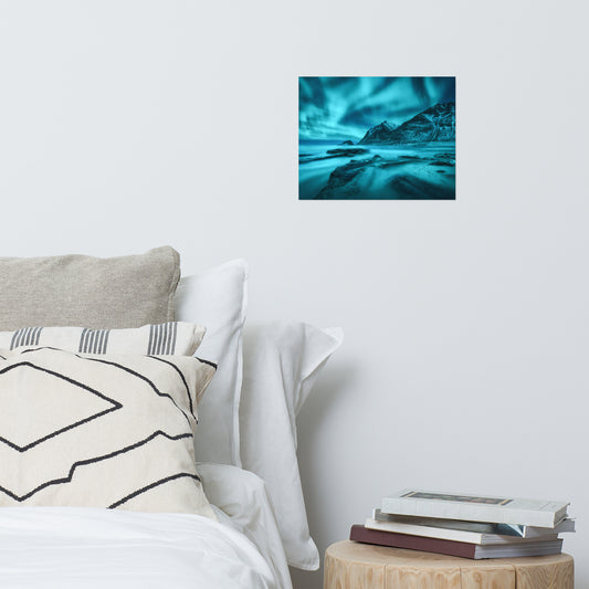 Blue Northern Lights and Mountain Coast Landscape Photo Loose Wall Art Prints