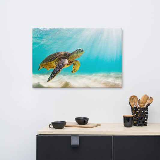 Hawaiian Green Sea Turtle In Turquoise Blue Sea and Sandbars Animal Wildlife Photograph Canvas Wall Art Print