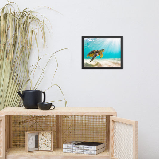 Hawaiian Green Sea Turtle in Turquoise Blue Sea and Sandbars Animal Wildlife Photograph Framed Wall Art Print