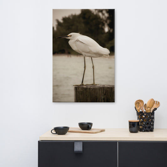 Aged and Colorized Snowy Egret on Pillar Wildlife Canvas Fine Art Photography Print