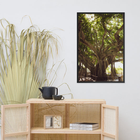 Banyan Tree With Glory Rays of Sunlight Tropical Botanical Nature Photo Framed Wall Art Print