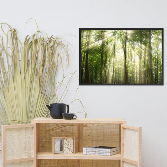 Sun Rays Through Treetops in the Forest Framed Photo Paper Wall Art Prints
