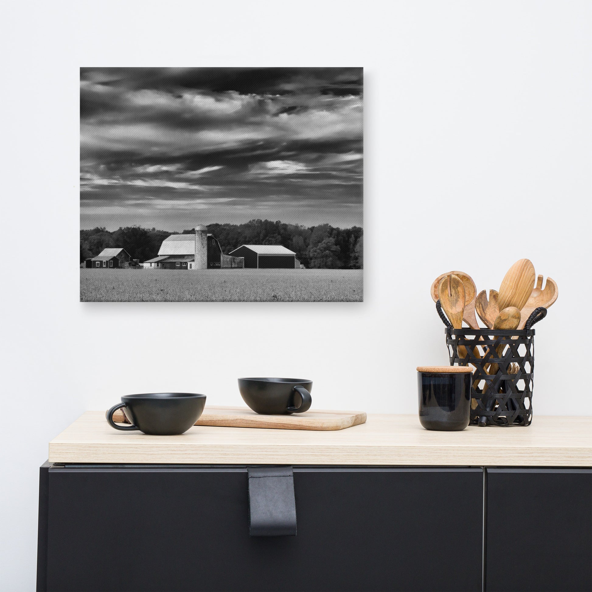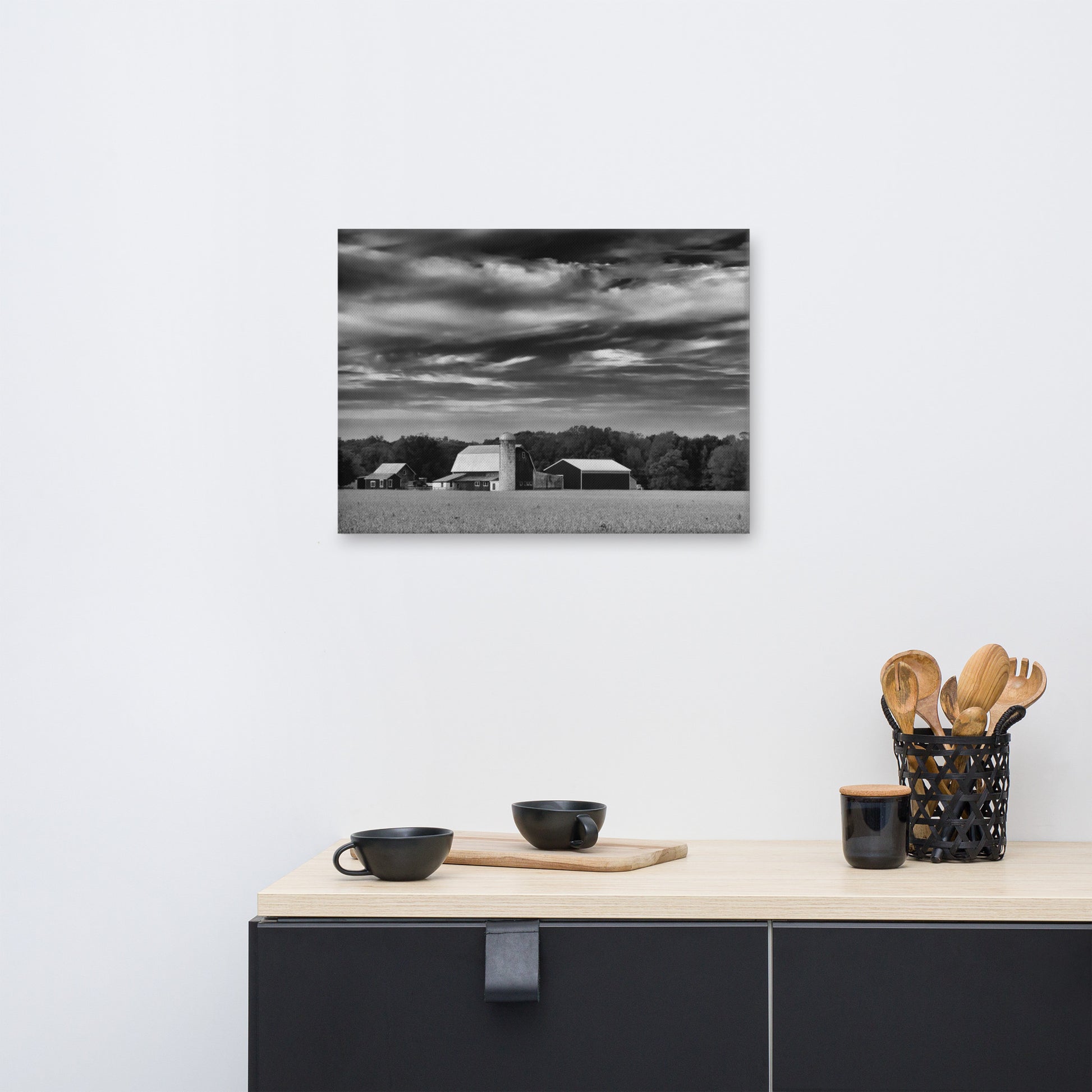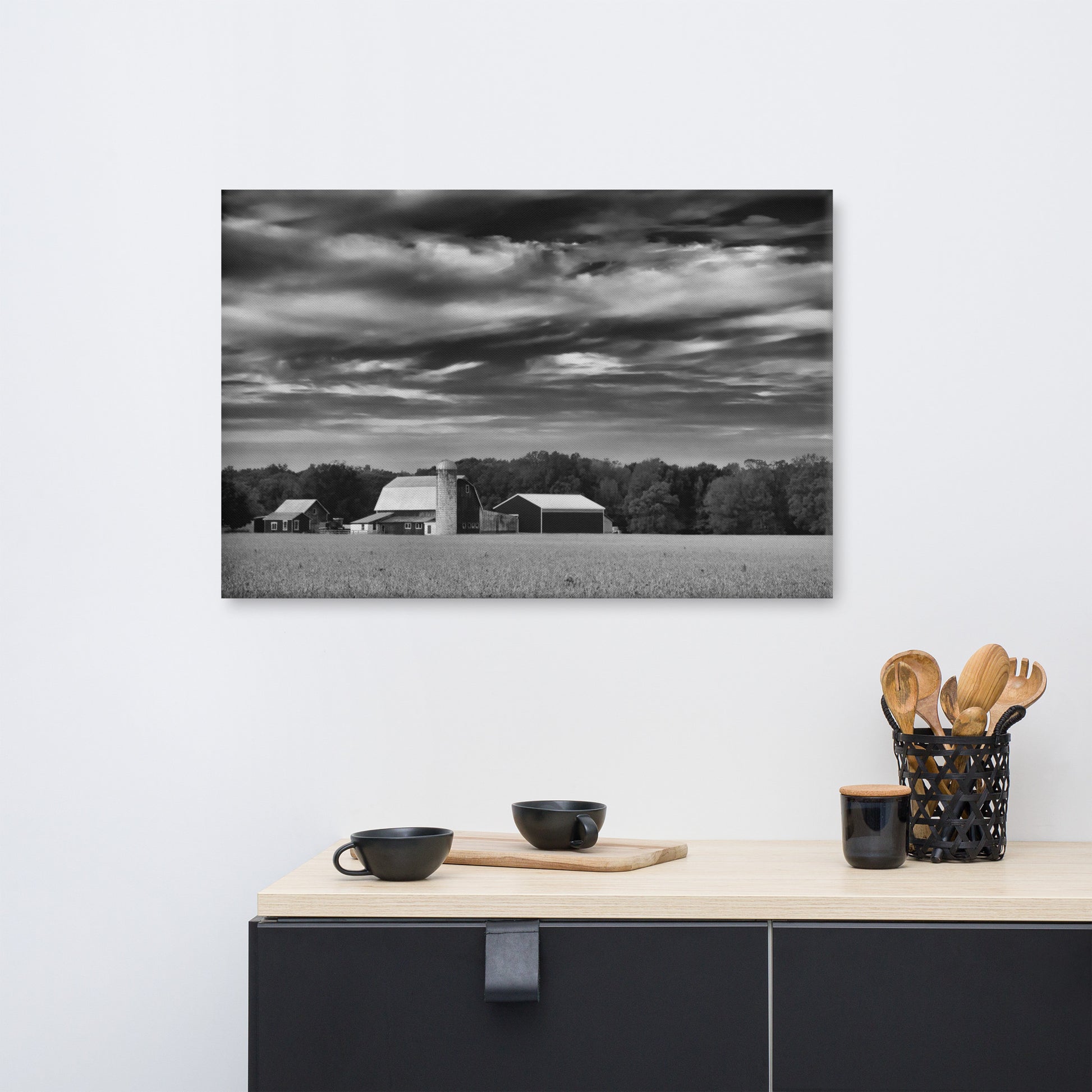 Originally photographed near the quaint town of Middletown, Delaware, in the early morning hours of fall, this image is also available in a color version to suit your personal style and decor. Bring a touch of rustic elegance and the tranquility of the countryside into your home with the "Barn in Field" canvas print.