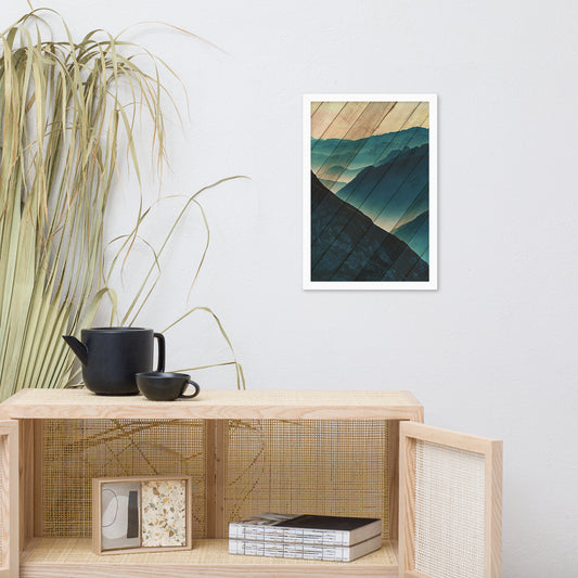 Faux Wood Misty Blue Silhouette Mountain Range Landscape Framed Photo Paper Wall Art Prints