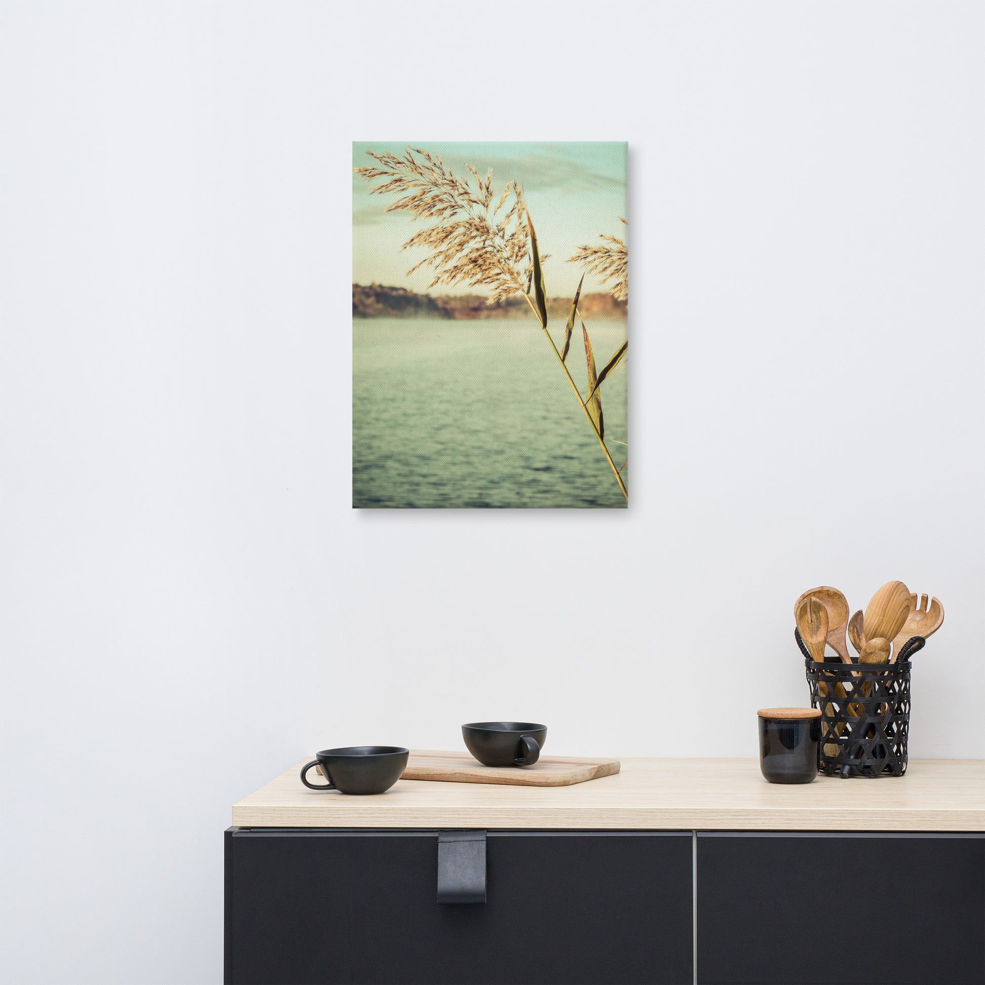 About this rustic beach grass print: Embrace the tranquility of the early morning with Golden Dreams, a breathtaking canvas art print that captures the ethereal beauty of Waples Pond in the autumn season. The neutral hues of the split tone coloring enhance the dreamlike atmosphere, transporting you to a world of mist-shrouded serenity. The bushy top of a marsh grass stalk stands tall against the misty backdrop, bathed in the warm glow of the rising sun. Its intricate details are rendered in stunning clarity, inviting you to explore the wonders of the natural world.