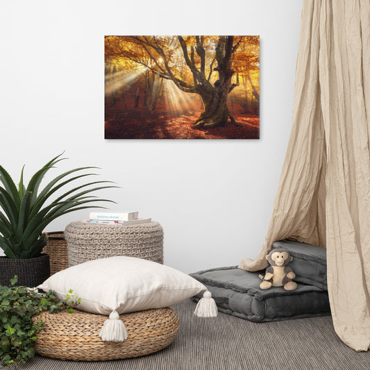 Old Magical Tree in Forest with Glory Rays Landscape Photograph Canvas Wall Art Prints