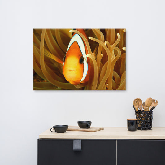 Close-up Orange Tropical Clownfish Face in Coral Animal Wildlife Photograph Canvas Wall Art Print