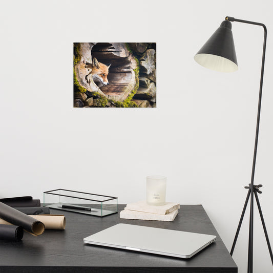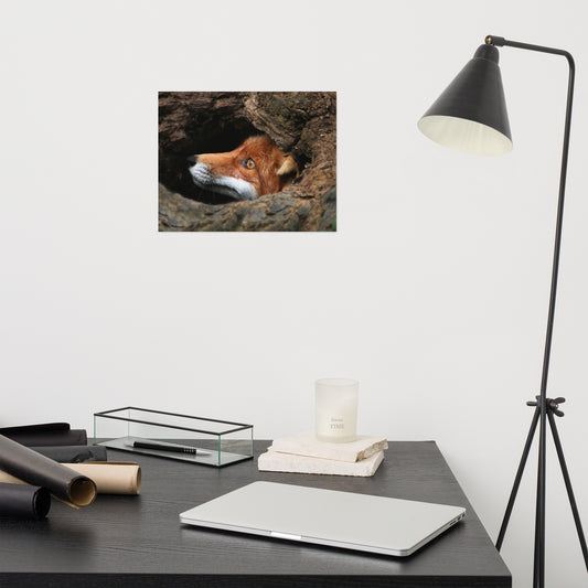 Red Fox Face in Stump of Tree Rustic Farmhouse Style Animal Wildlife Nature Photograph Loose Wall Art Print