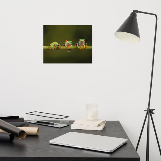 Three Tiny Green Red Eyed Tree Frog on Bamboo Branch Animal Wildlife Floral Nature Photograph Loose Wall Art Print