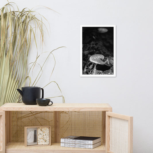 Mushroom on Log in Black and White Botanical Nature Photo Framed Wall Art Print