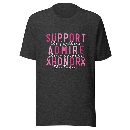 Breast Cancer Support - Admire Honor - Survivor - Awareness Pink Ribbon Black Light Pink Font Unisex T-shirt