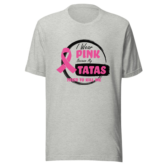 I Wear Pink Because My Tatas Tried To Kill Me - Breast Cancer Awareness - Humor - Funny Unisex T-shirt