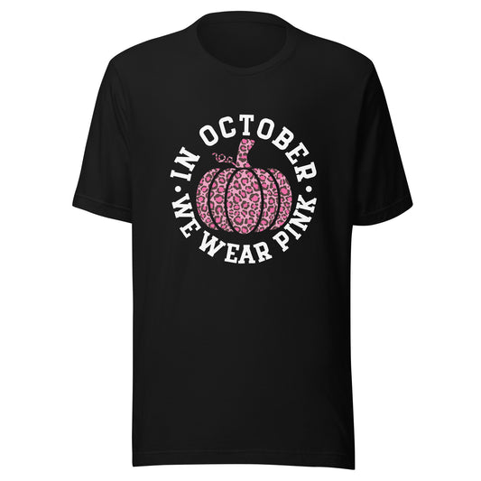 October We Wear Pink and Black Leopard Print Pumpkin - Breast Cancer Awareness Unisex T-shirt