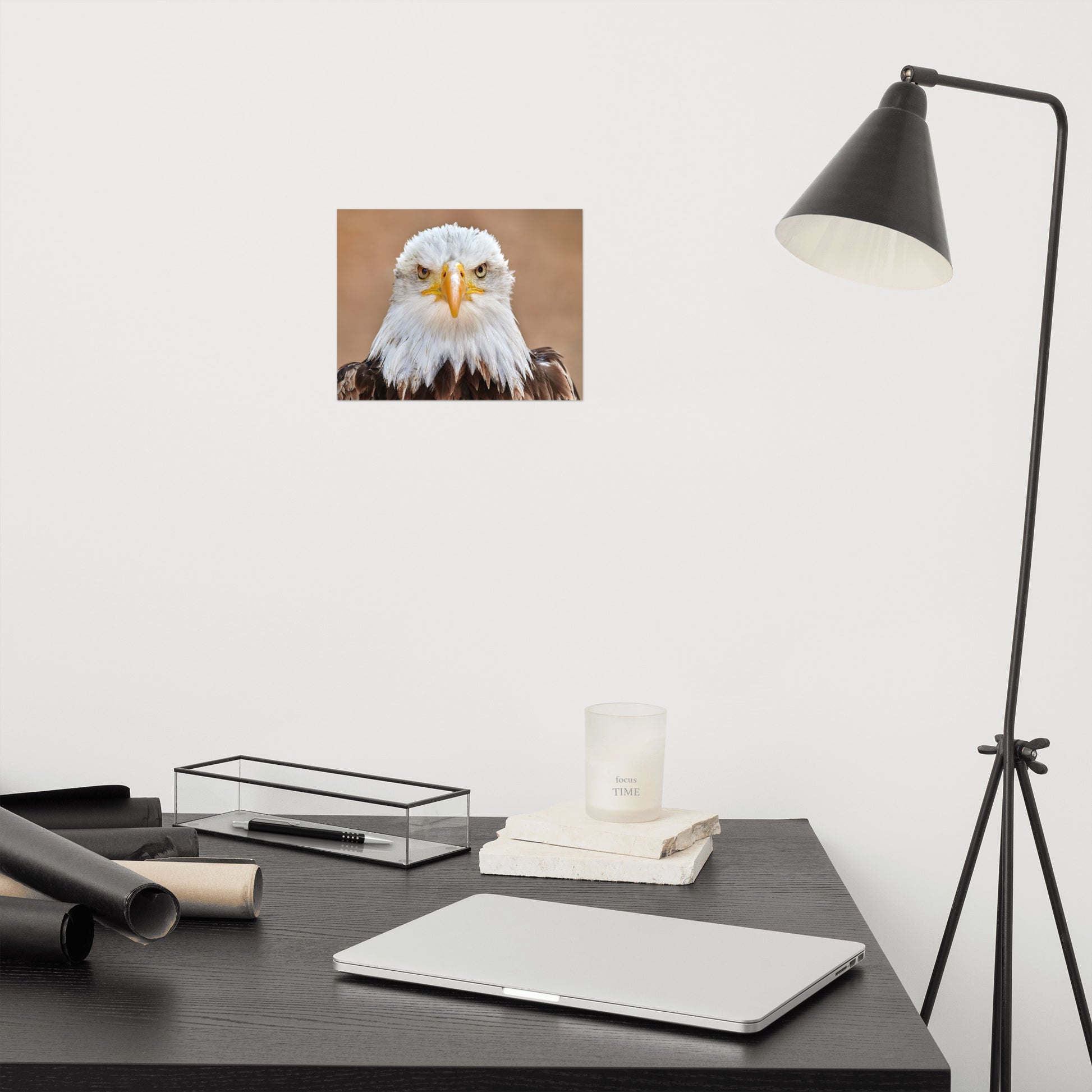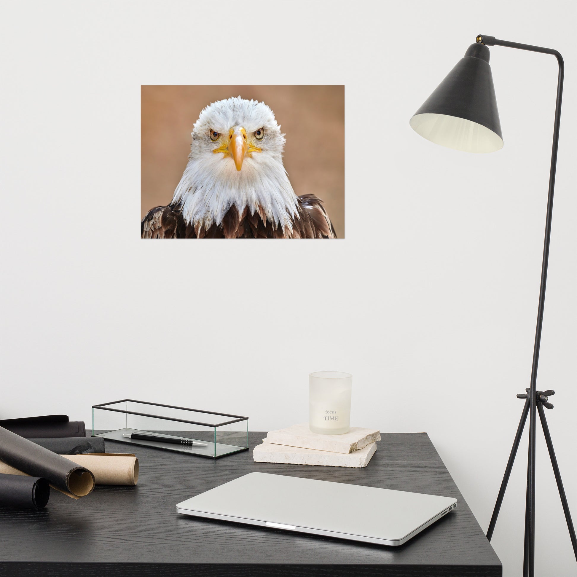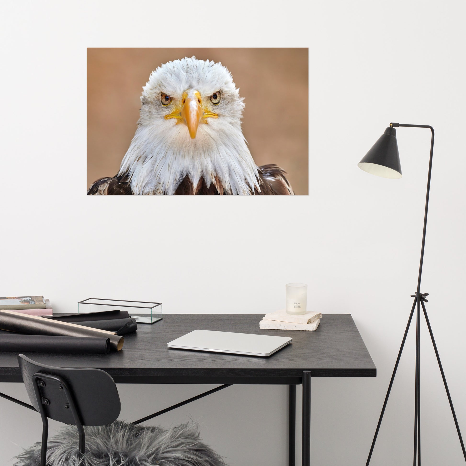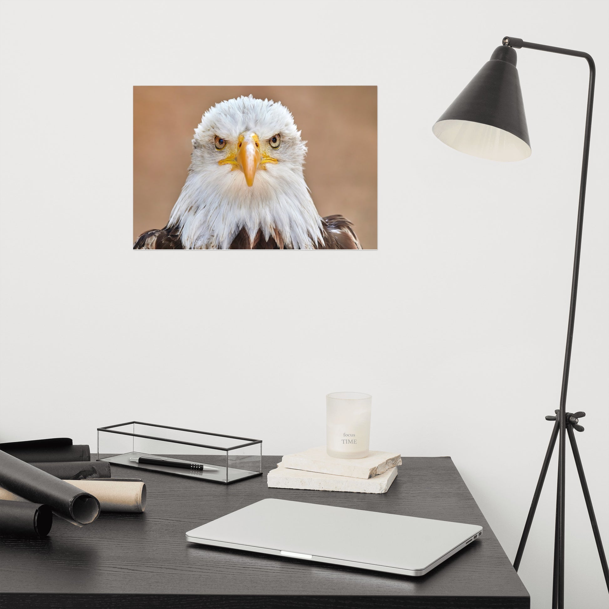 About this art for farmhouse style rooms: Capture the majesty of America's national bird with this stunning loose art print. A close-up portrait of an adult bald eagle, its piercing gaze fixed directly on you, is sure to become a captivating centerpiece in any room. Printed on high-quality archival paper, this unframed print allows for versatile display options and is perfect for custom framing to suit your personal style. Bring the power and beauty of the wild into your home.