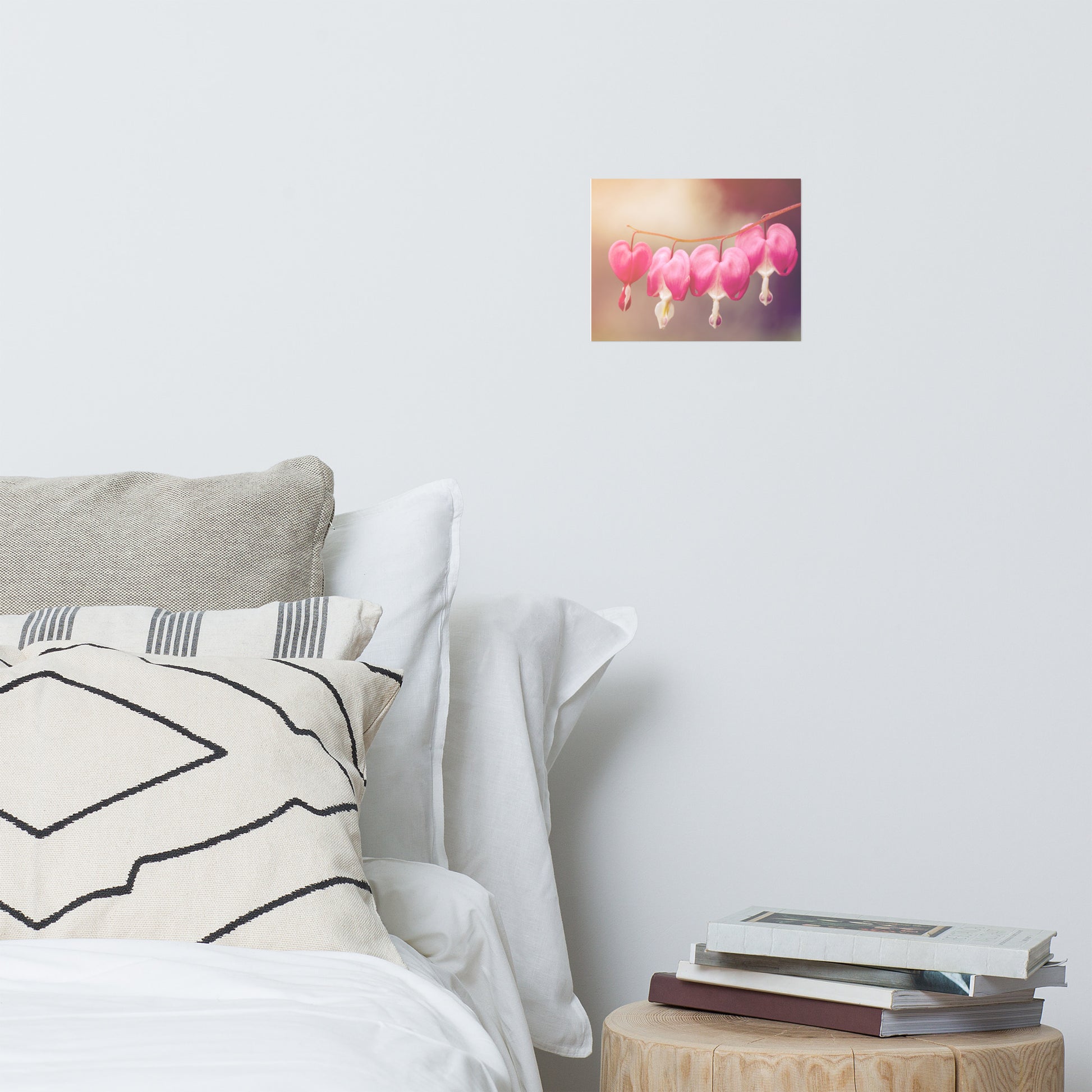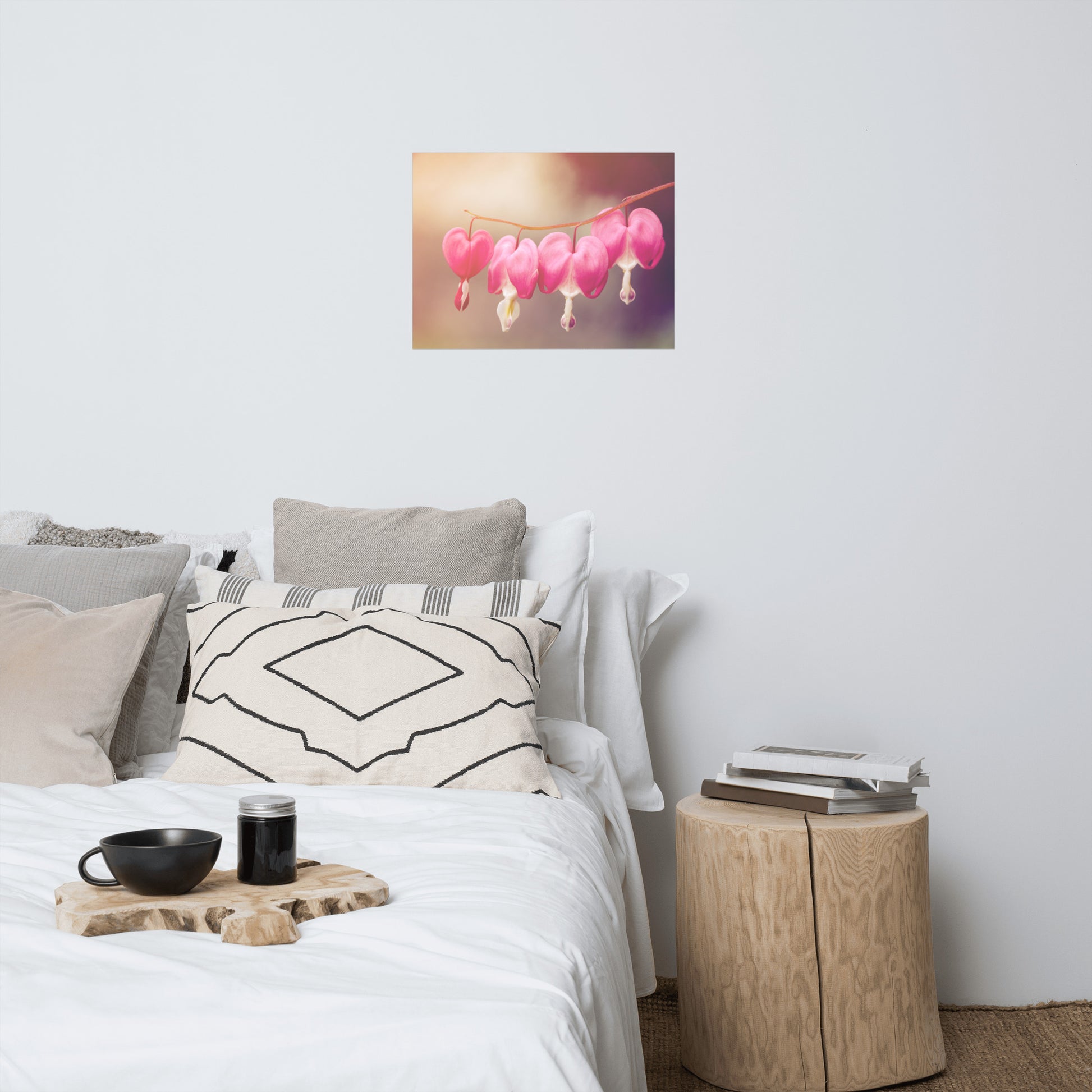 About this botanical flower poster: Bring the gentle beauty of nature into your home with "Be Still My Bleeding Heart Warm Summer Glow." This loose, unframed wall art print captures the soft focus elegance of four Bleeding Heart blooms in full glory, set against a lush green parkway backdrop. The aged coloring effect adds a touch of romance, making this print a timeless addition to any space.