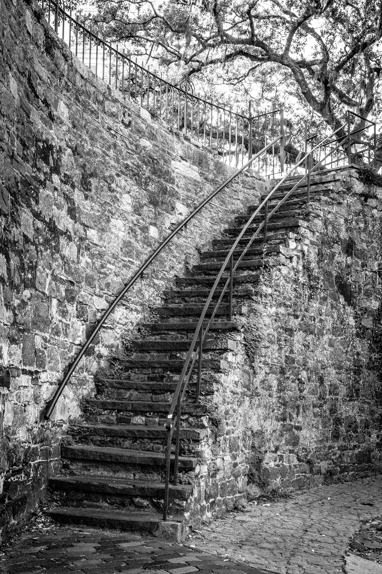 About these black white photography prints: Capture the essence of Savannah's historic charm with this captivating canvas print. "Old Stone Stairs" showcases the iconic stone stairs that lead from the bustling city streets down to the picturesque River Street. The black and white photograph highlights the intricate details of the weathered stonework and the elegant wrought iron handrails, while the overhead branches create a natural canopy that adds depth and dimension to the scene.