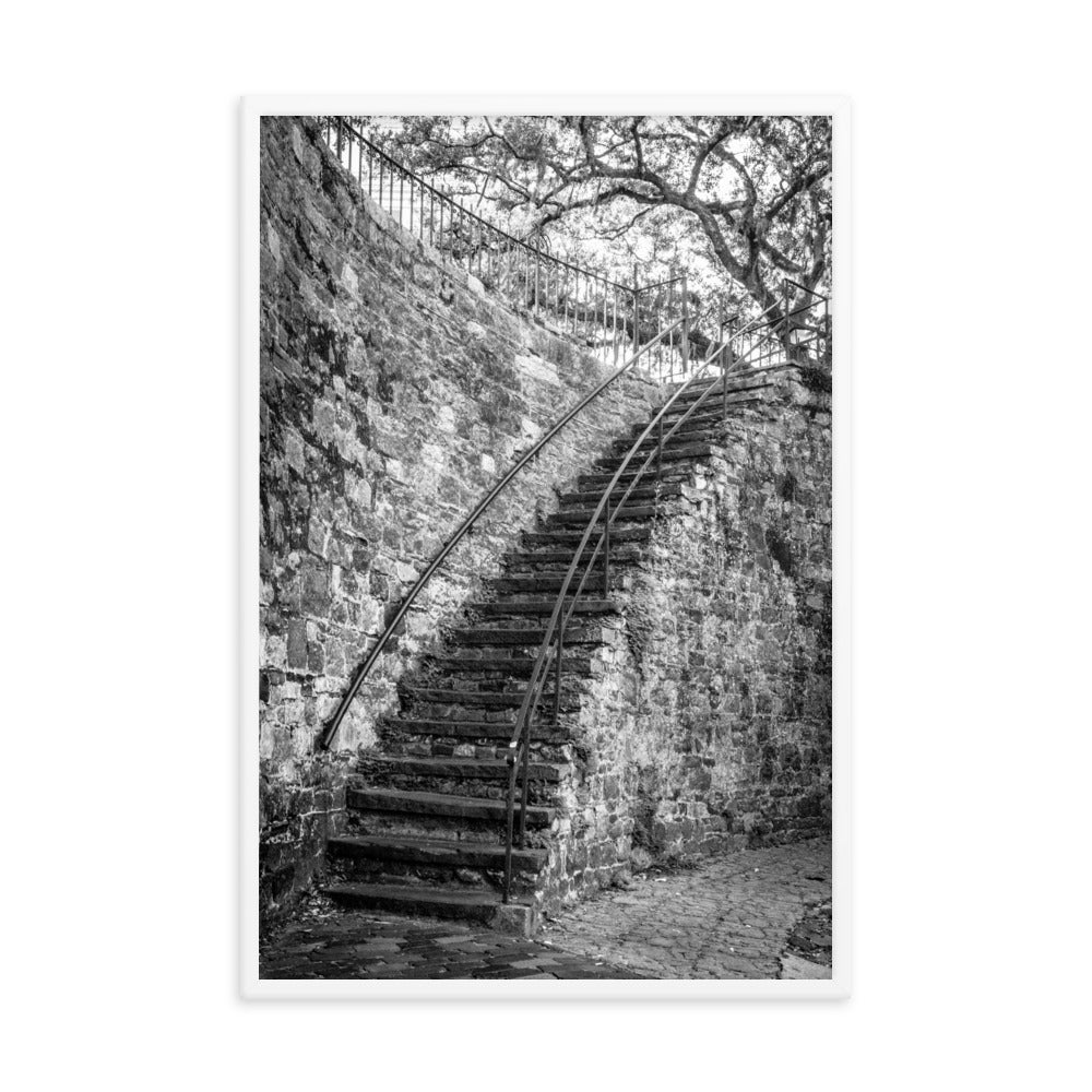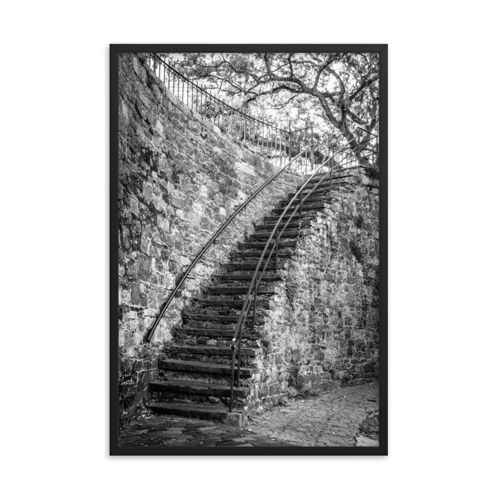 Black and White Old Stone Stairs River Street Savannah Ga Framed Wall Art Print