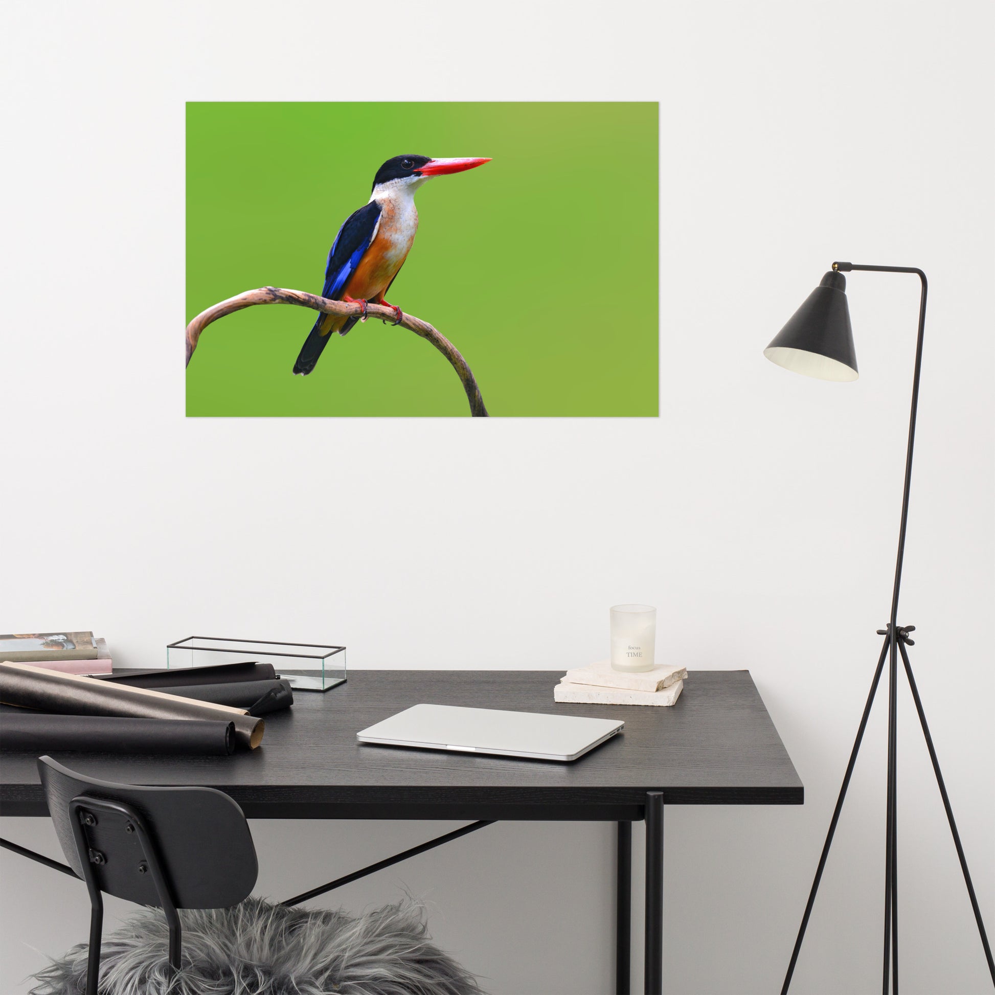 About these tropical bird prints: Bring the vibrant beauty of the tropics into your home with this minimal close-up photograph of a Black-capped Kingfisher. Perched on a lush green branch, this stunning bird is captured in exquisite detail, showcasing its iridescent blue plumage and striking black cap.