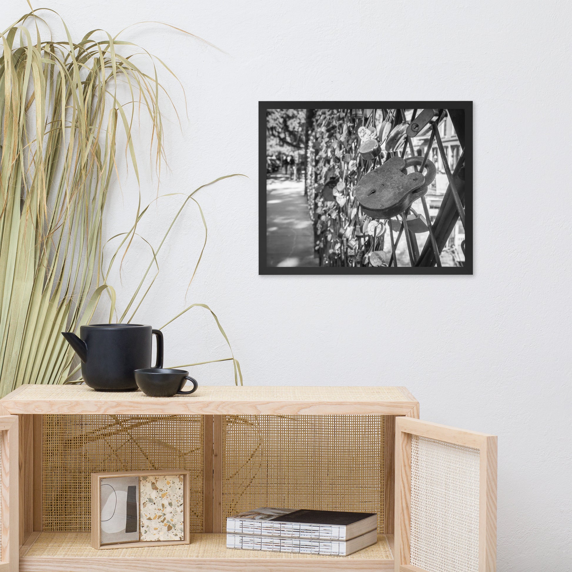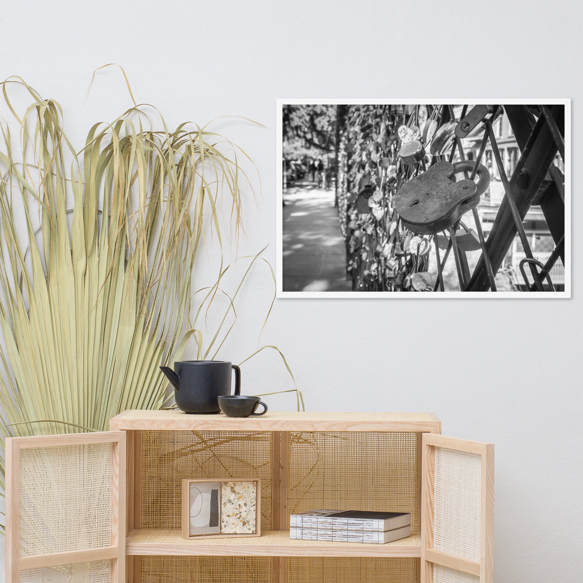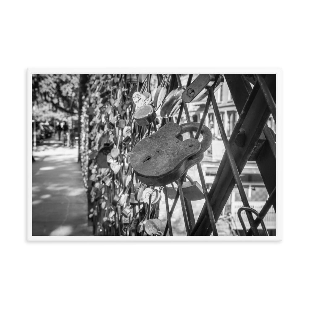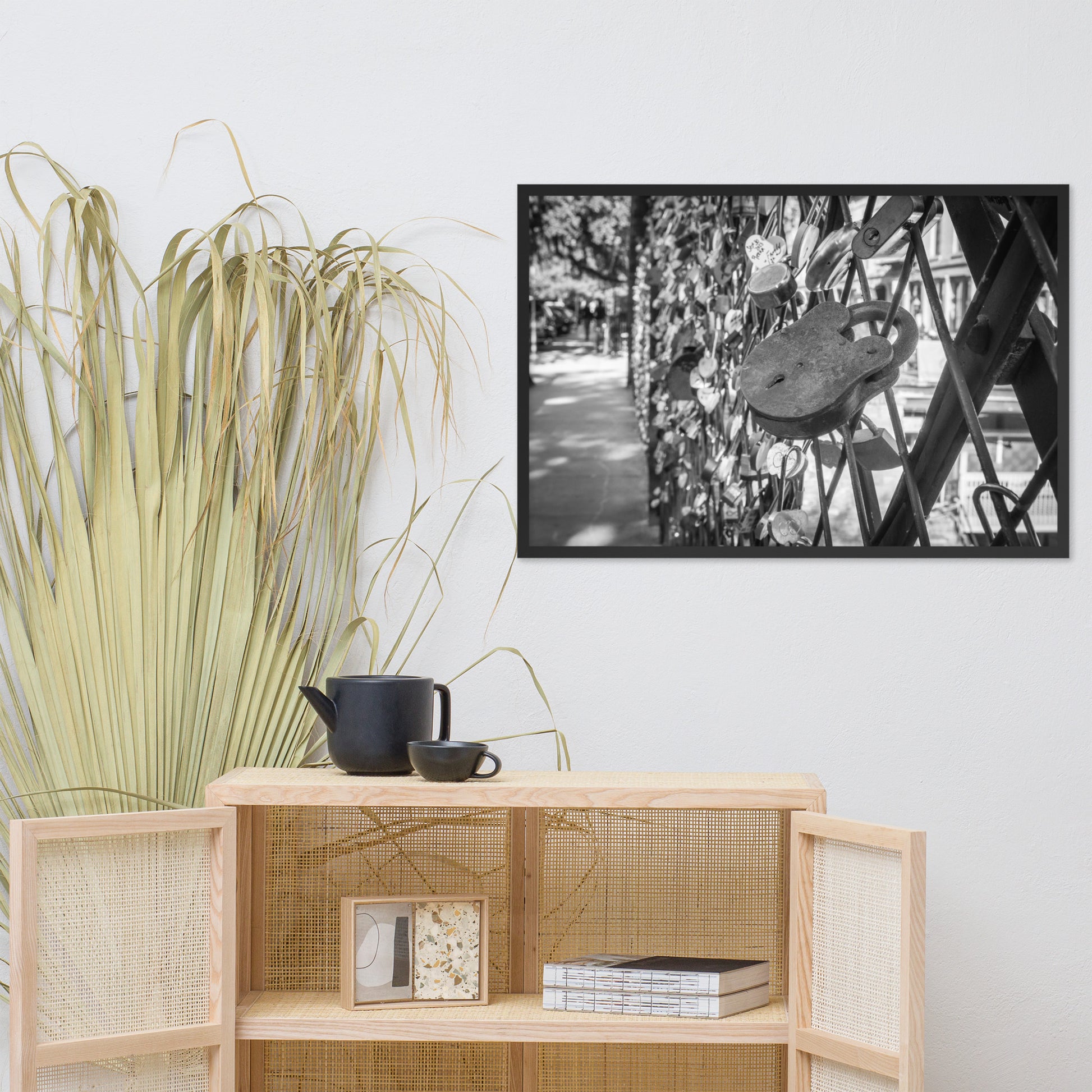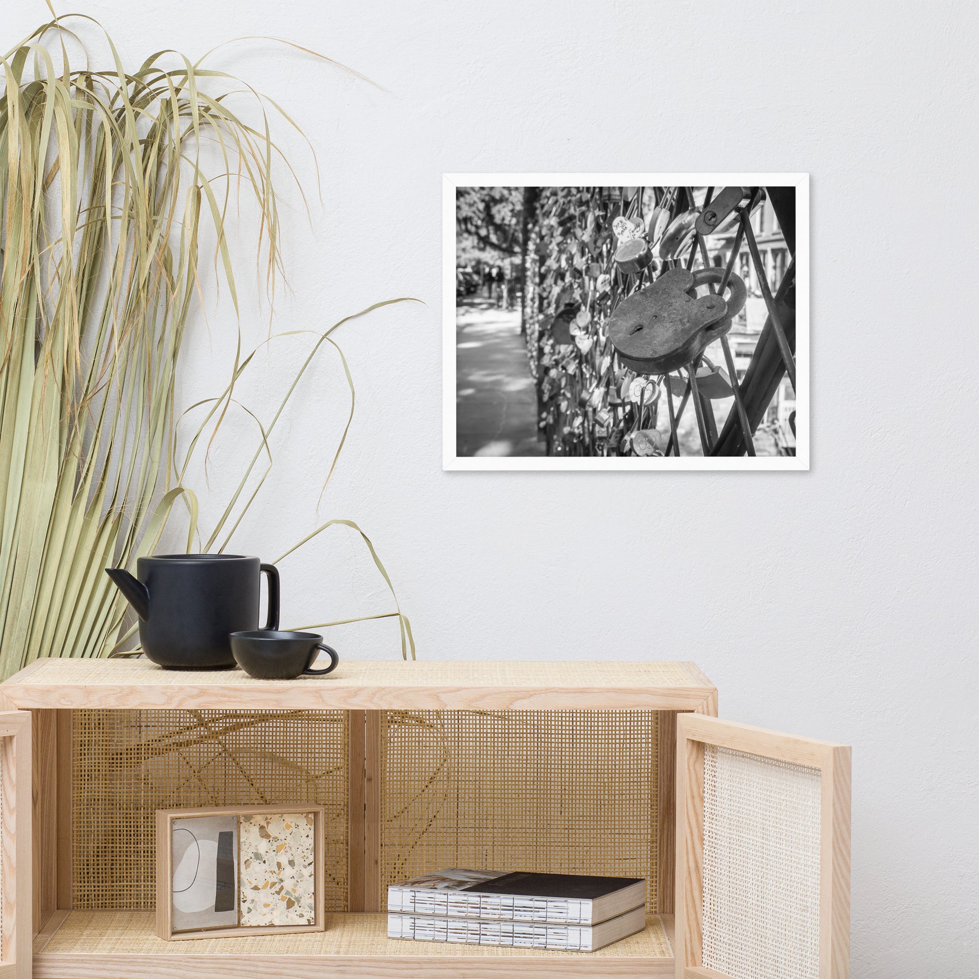 Rustic Industrial Wall Art: Black and White Minimal Street Photograph Love Lock Bridge - Modern / Architectural / Urban - Framed Print - Artwork