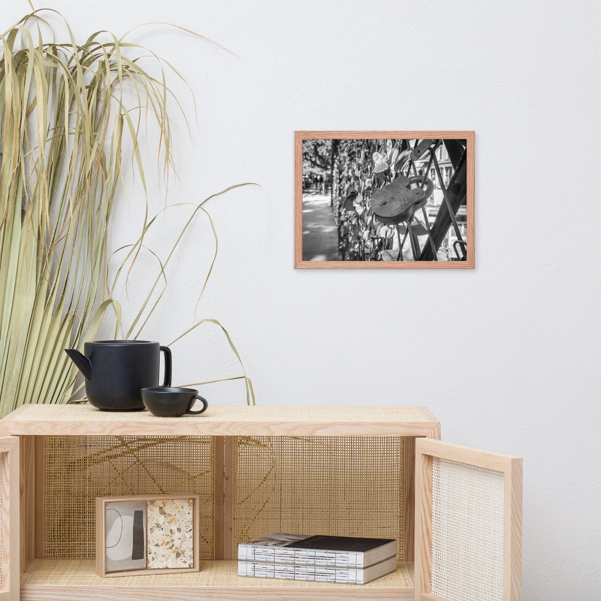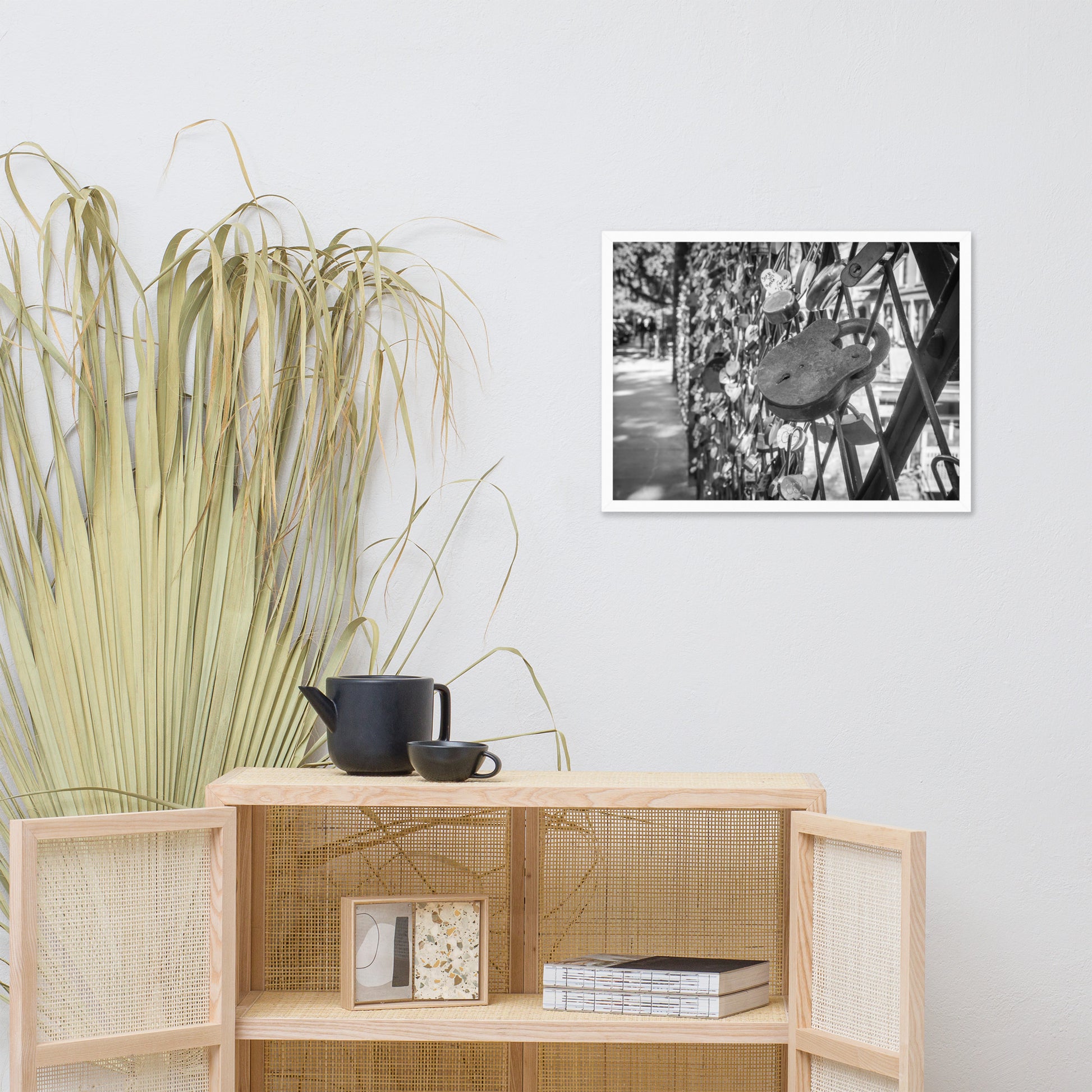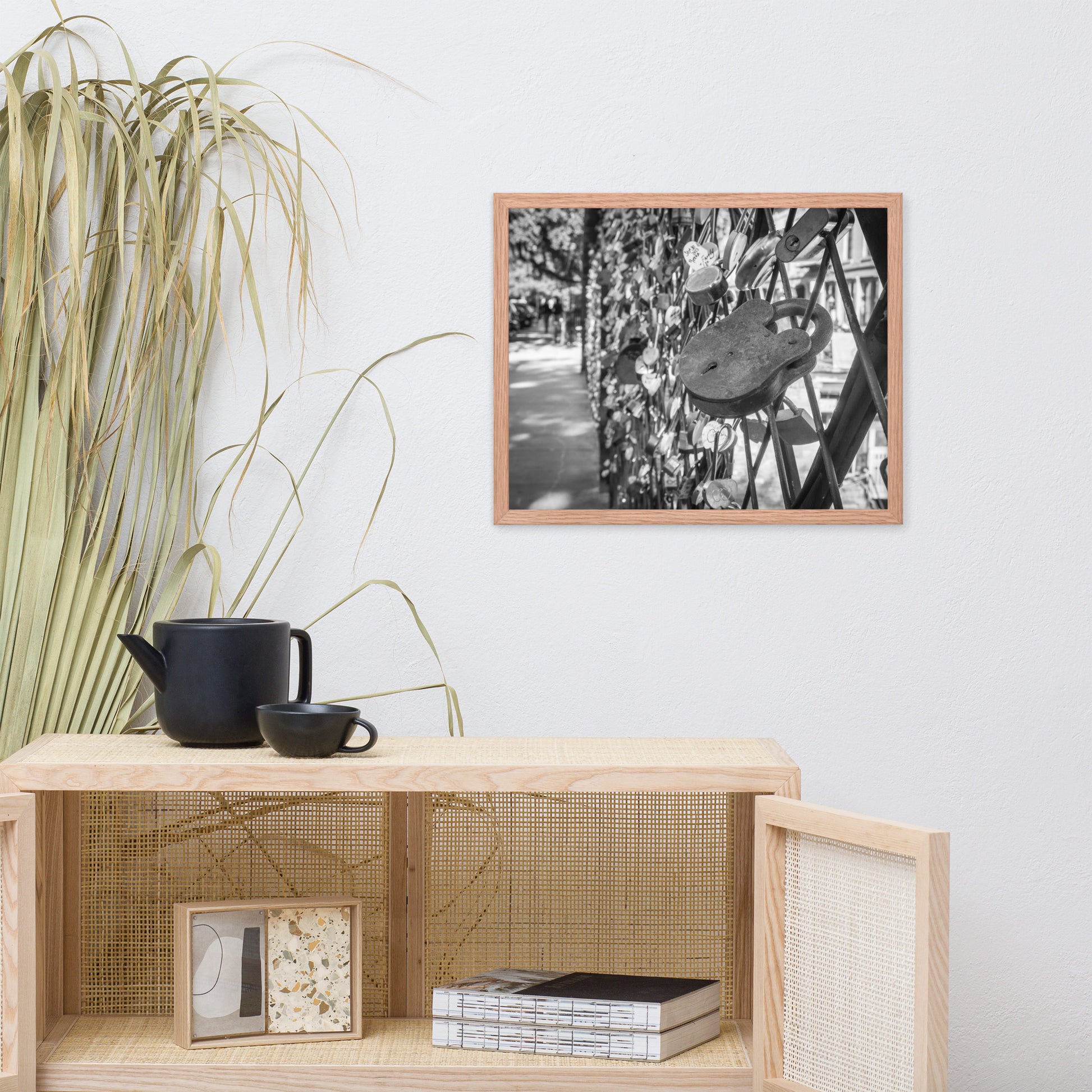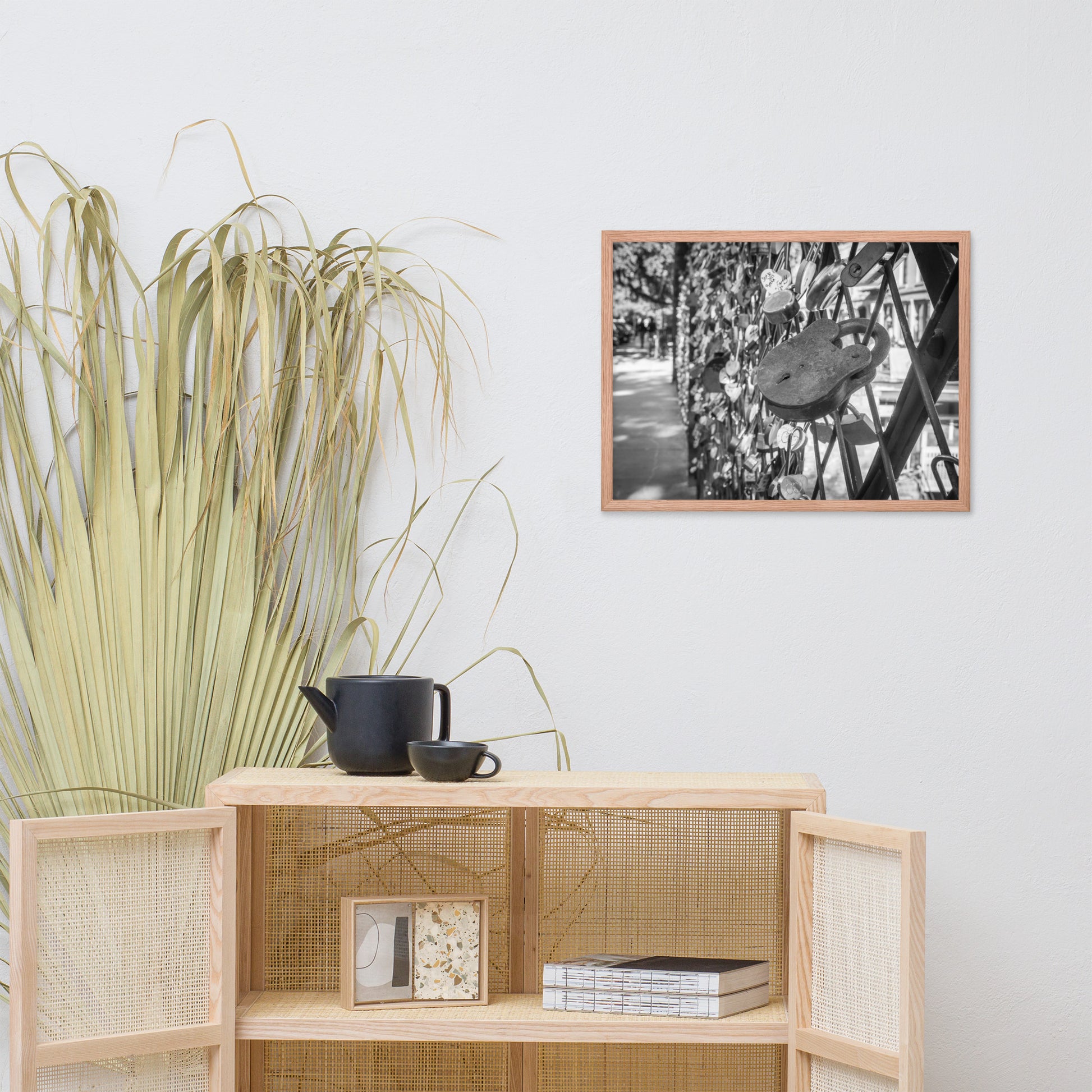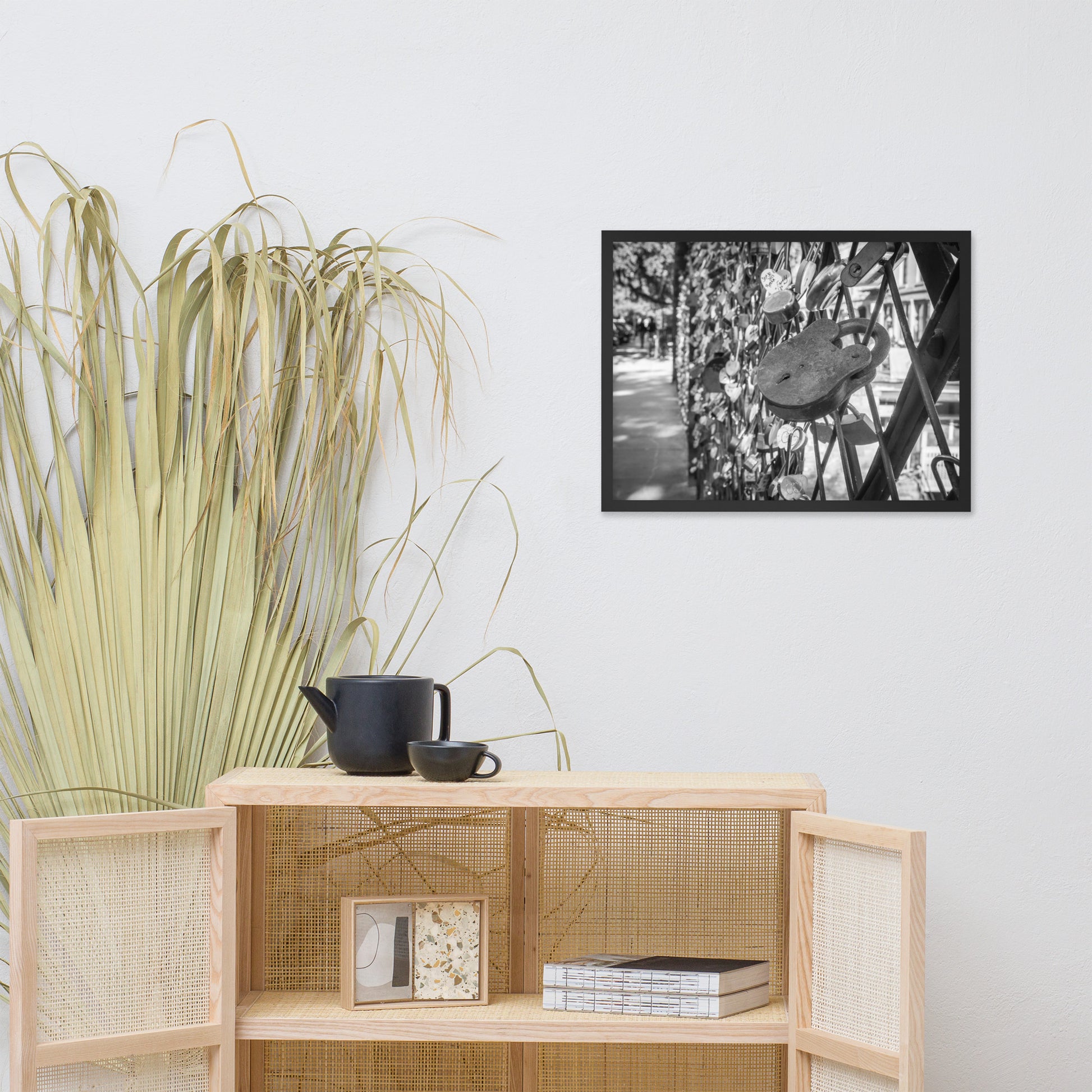 Rustic Industrial Wall Art: Black and White Minimal Street Photograph Love Lock Bridge - Modern / Architectural / Urban - Framed Print - Artwork