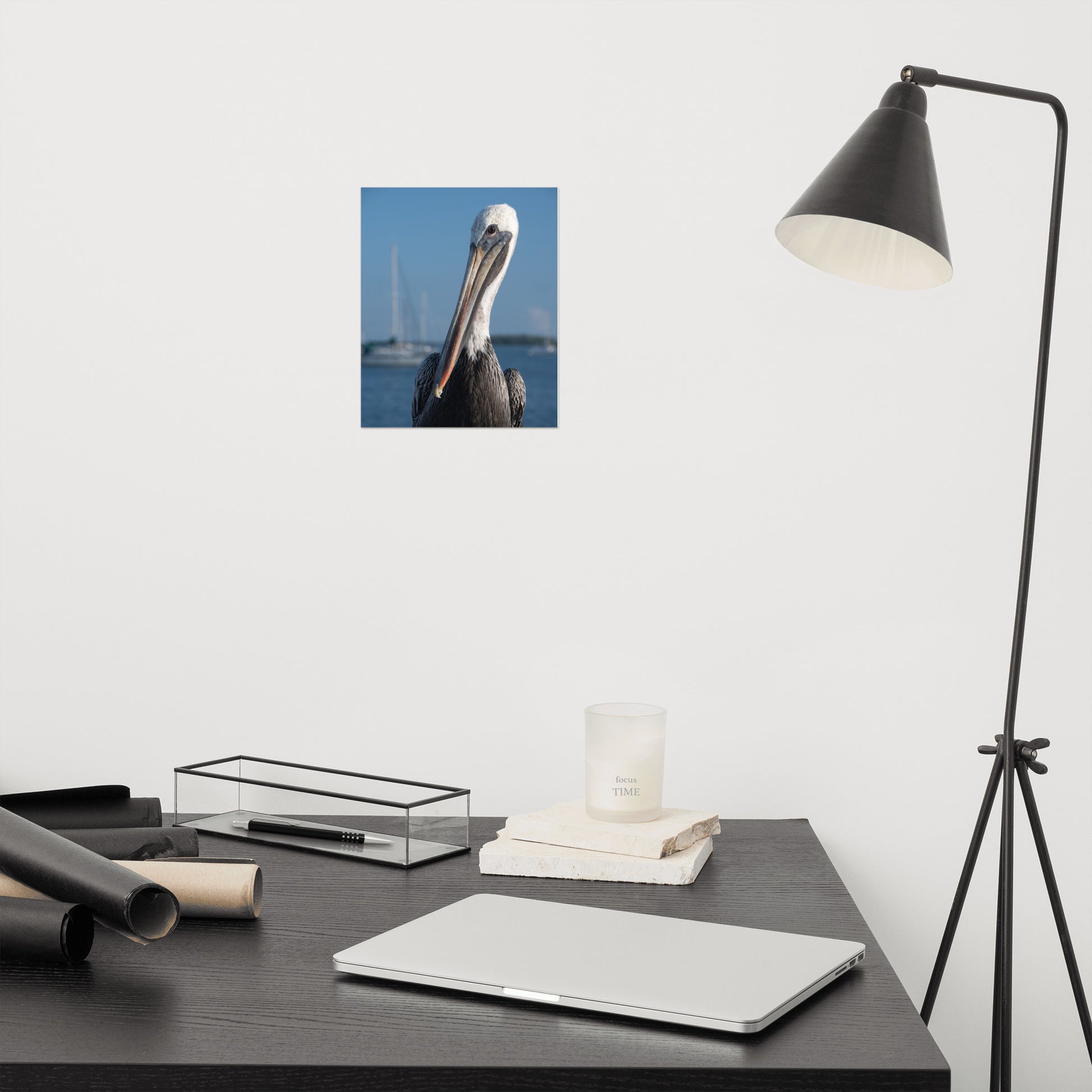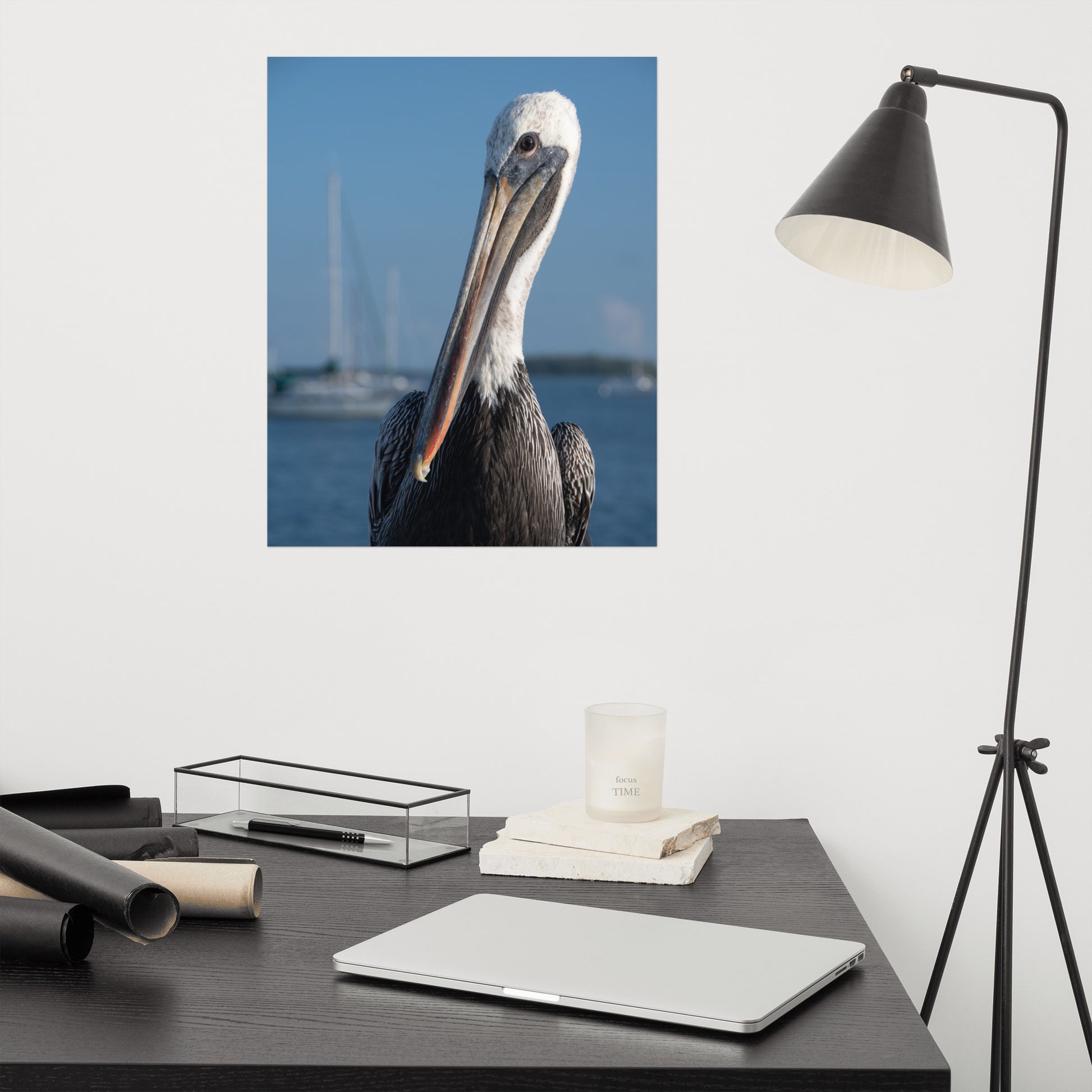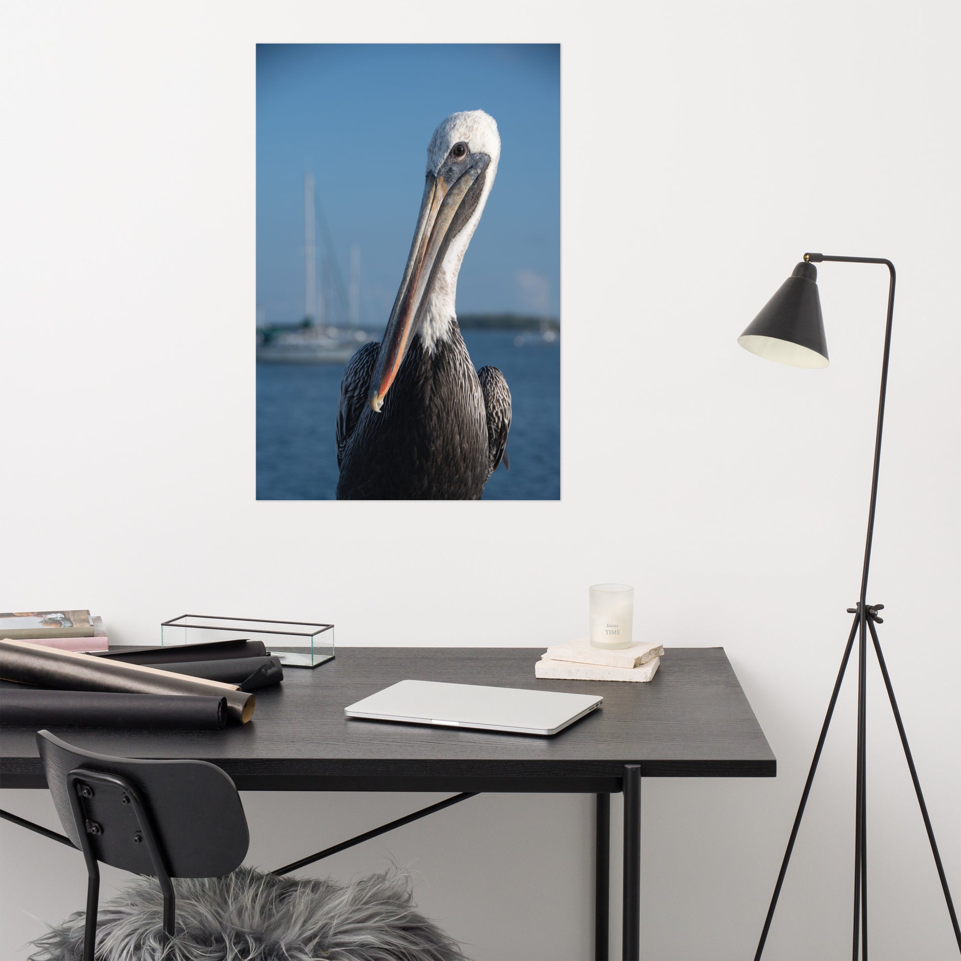 About these coastal wall art prints: Capture the beauty of Florida's coast with "Bob the Pelican 3 Color," a vibrant close-up wildlife photograph showcasing a majestic brown and white pelican. Perched on an old fishing pier on the shores of Tampa Bay, Bob's bright orange beak pops against the backdrop of crisp blue water dotted with sailboats. This unframed print is perfect for adding a touch of coastal charm to any space and is ready to be customized with your favorite frame and mat.