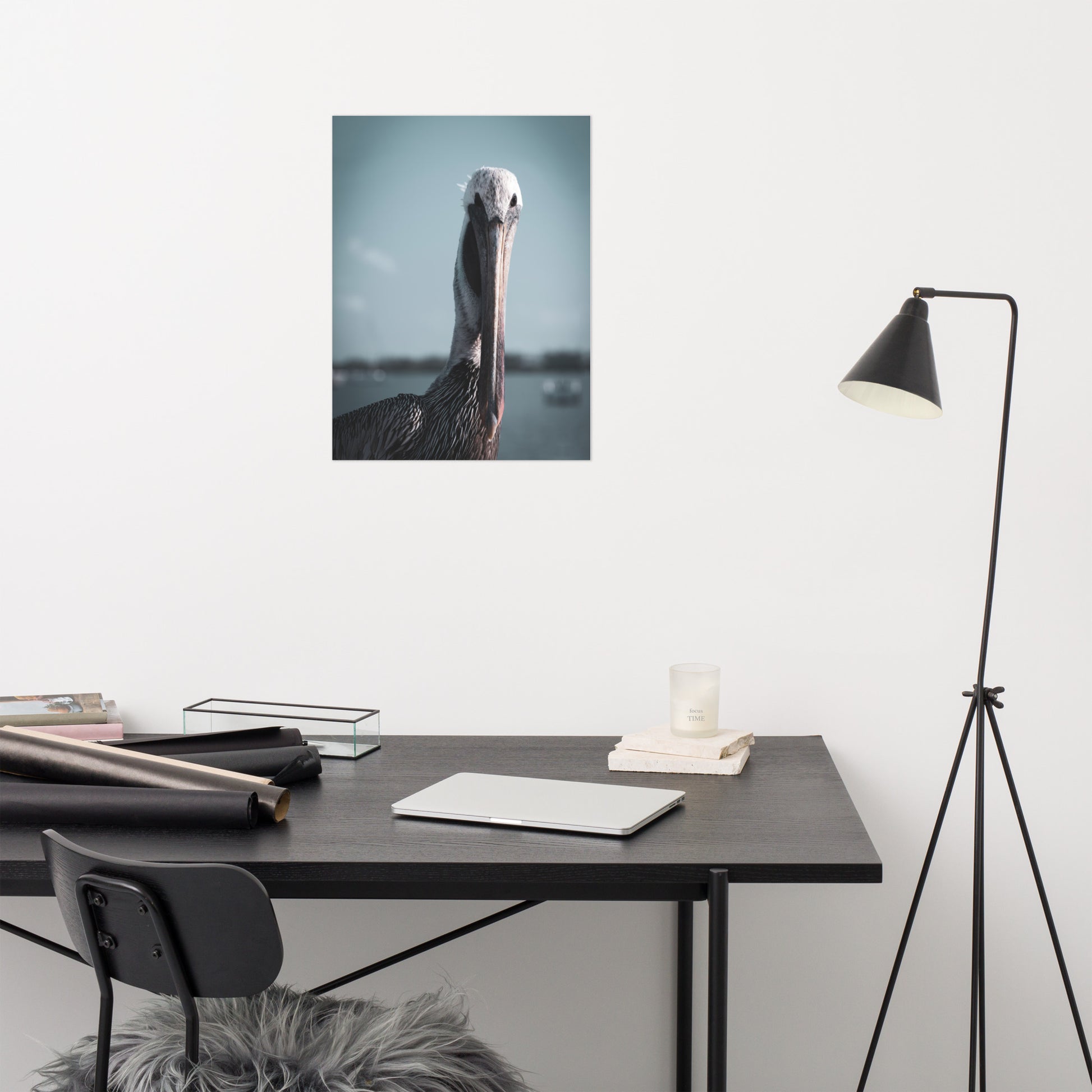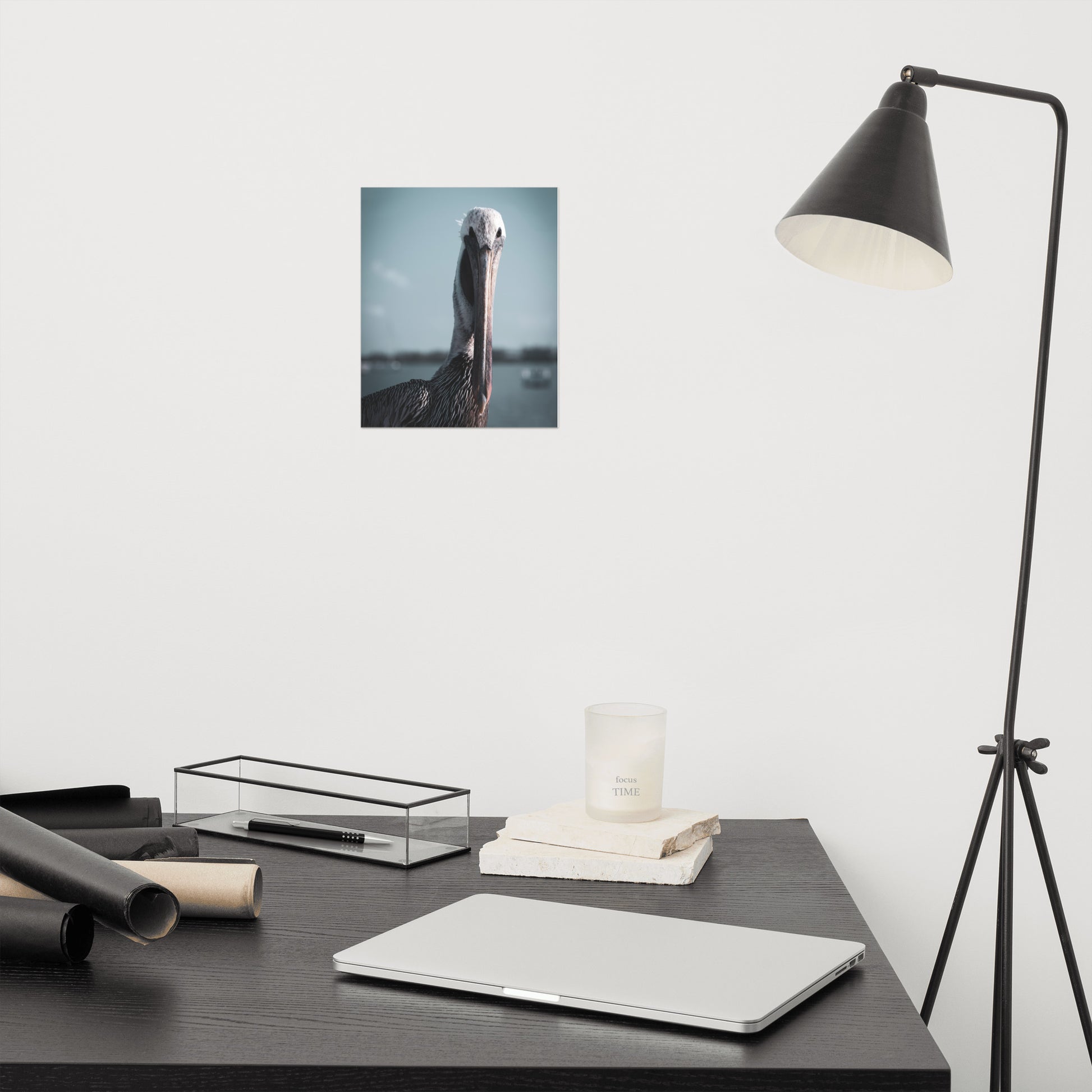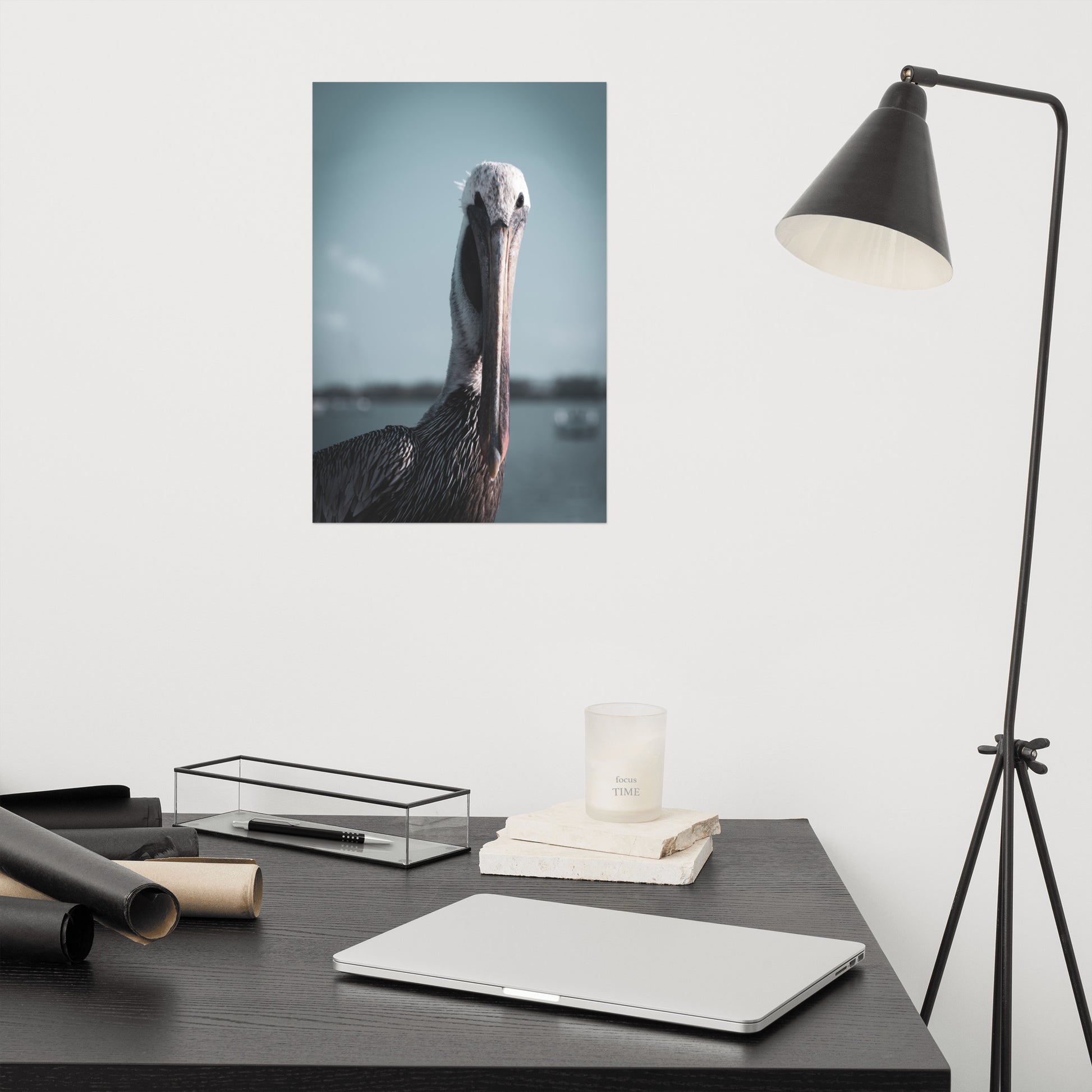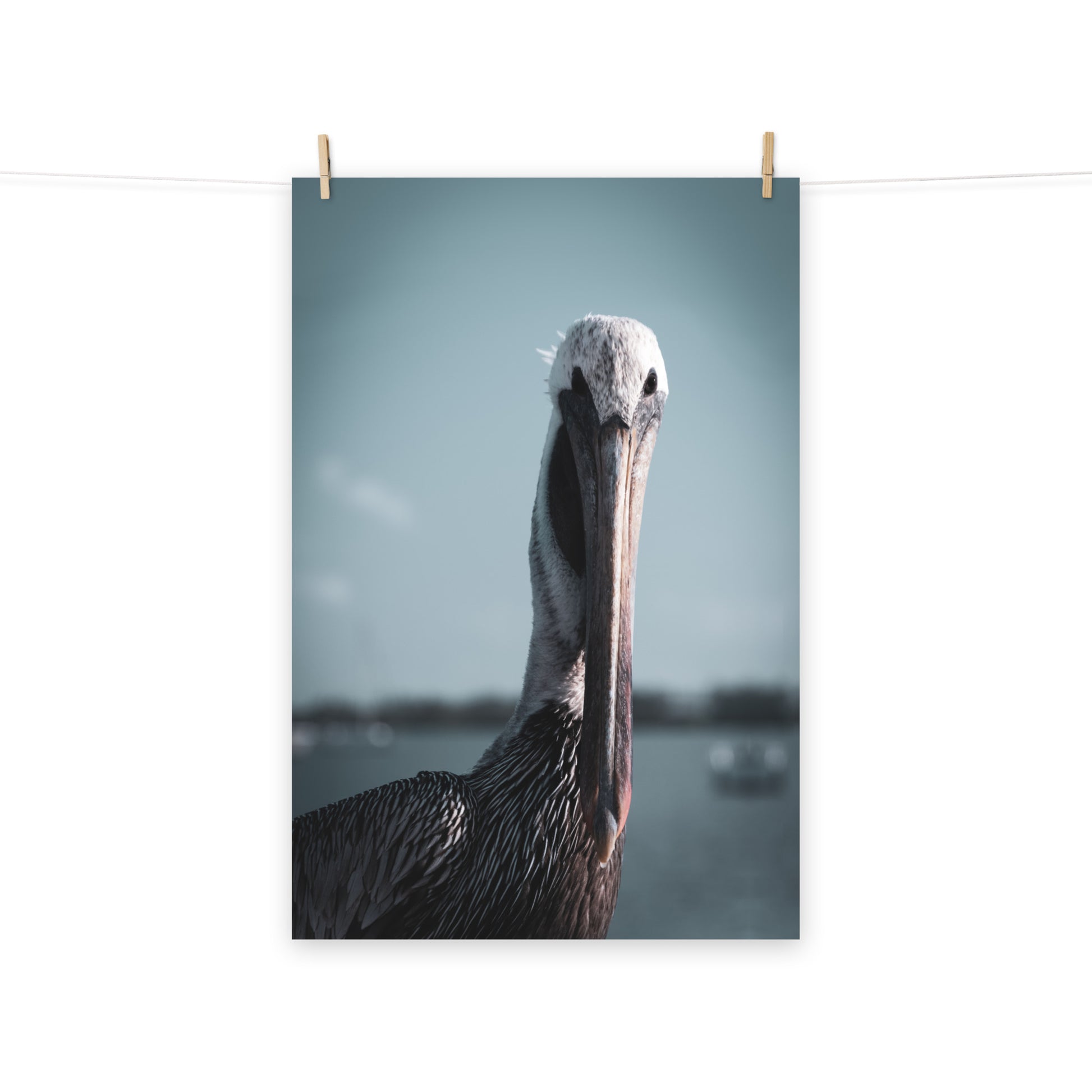 About these bird artwork prints: Bob the Pelican Colorized is a captivating close-up wildlife photograph showcasing a majestic brown and white pelican. With its bright orange beak and curious gaze, the pelican rests on a weathered wooden railing of an old fishing pier off the shores of Tampa Bay, Florida. The image has been enhanced with an aging and blue color effect, creating a dramatic and evocative atmosphere that captures the essence of the rural coastal landscape. This loose, unframed art print is perfect for adding a touch of coastal charm and natural beauty to any space.