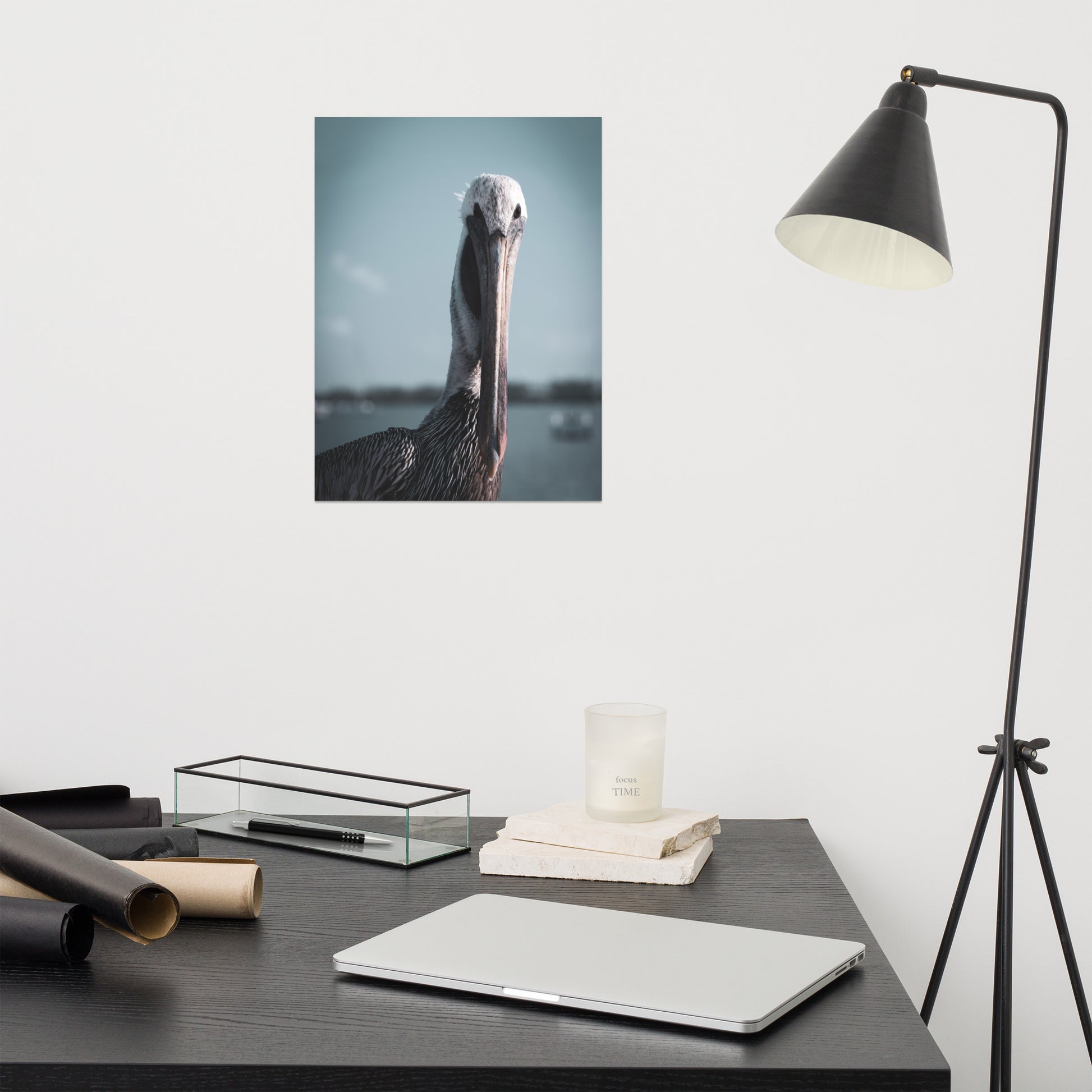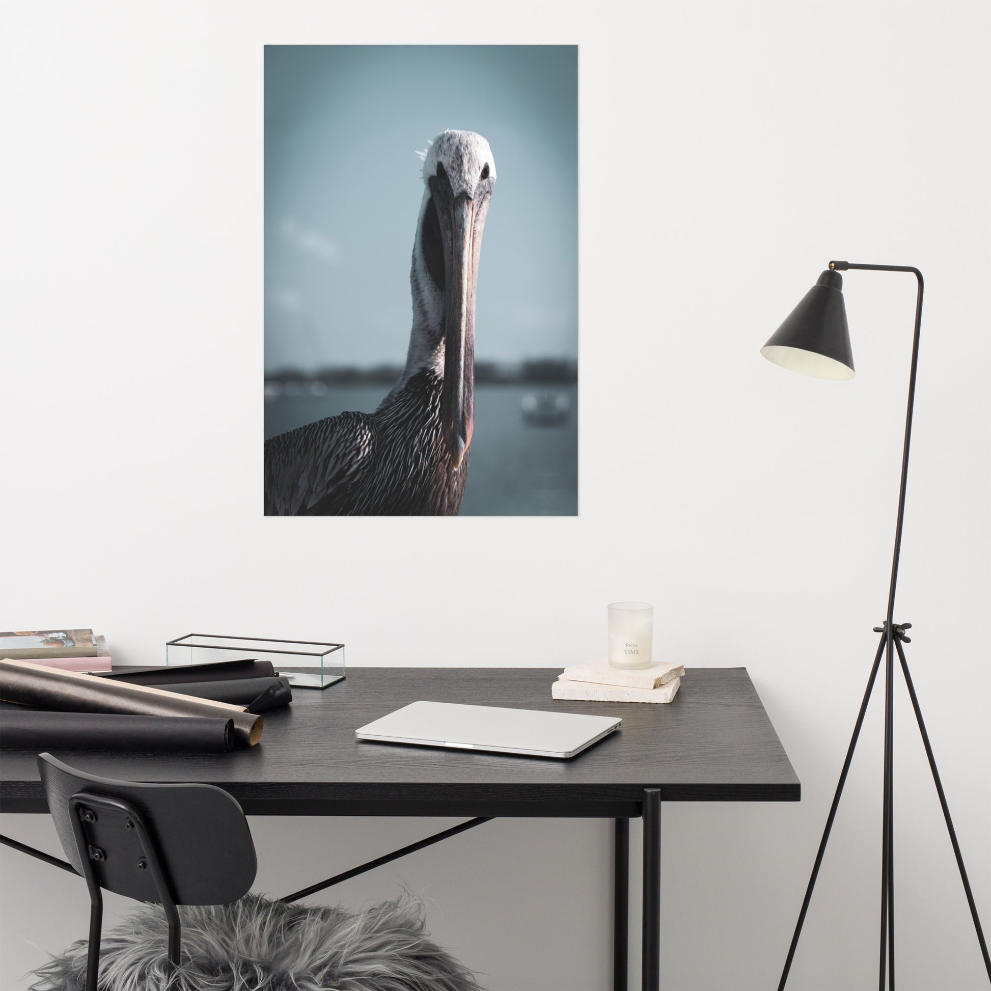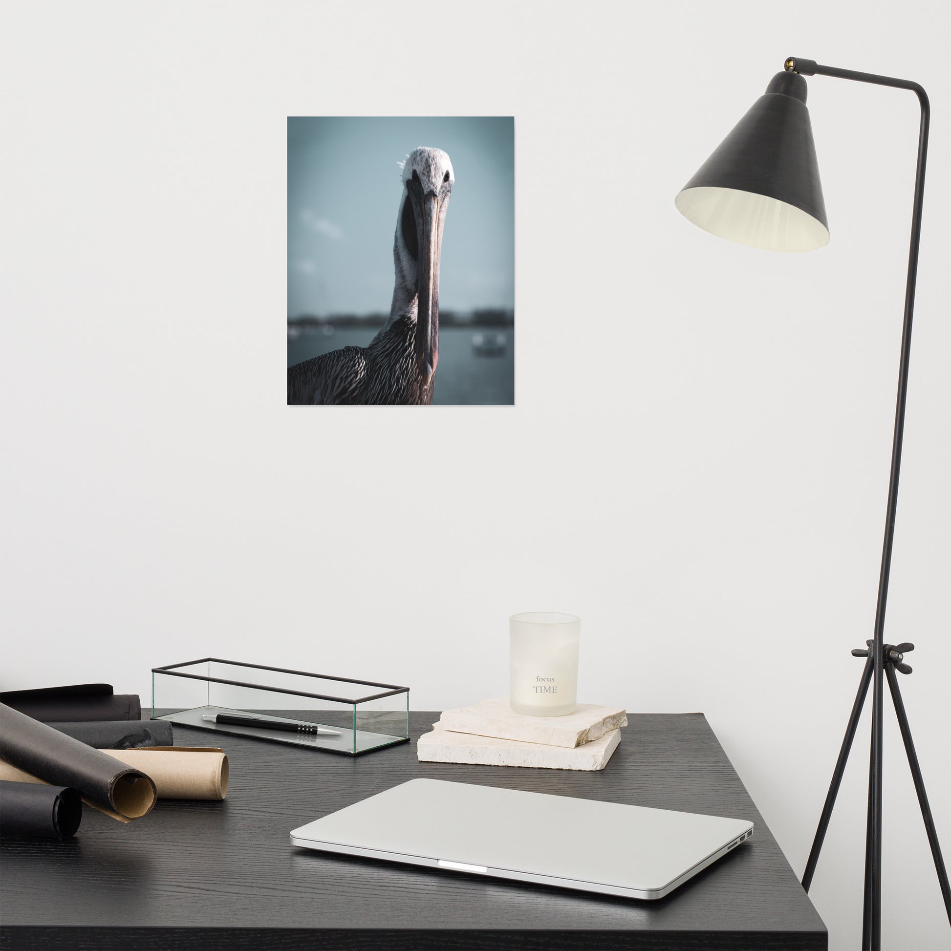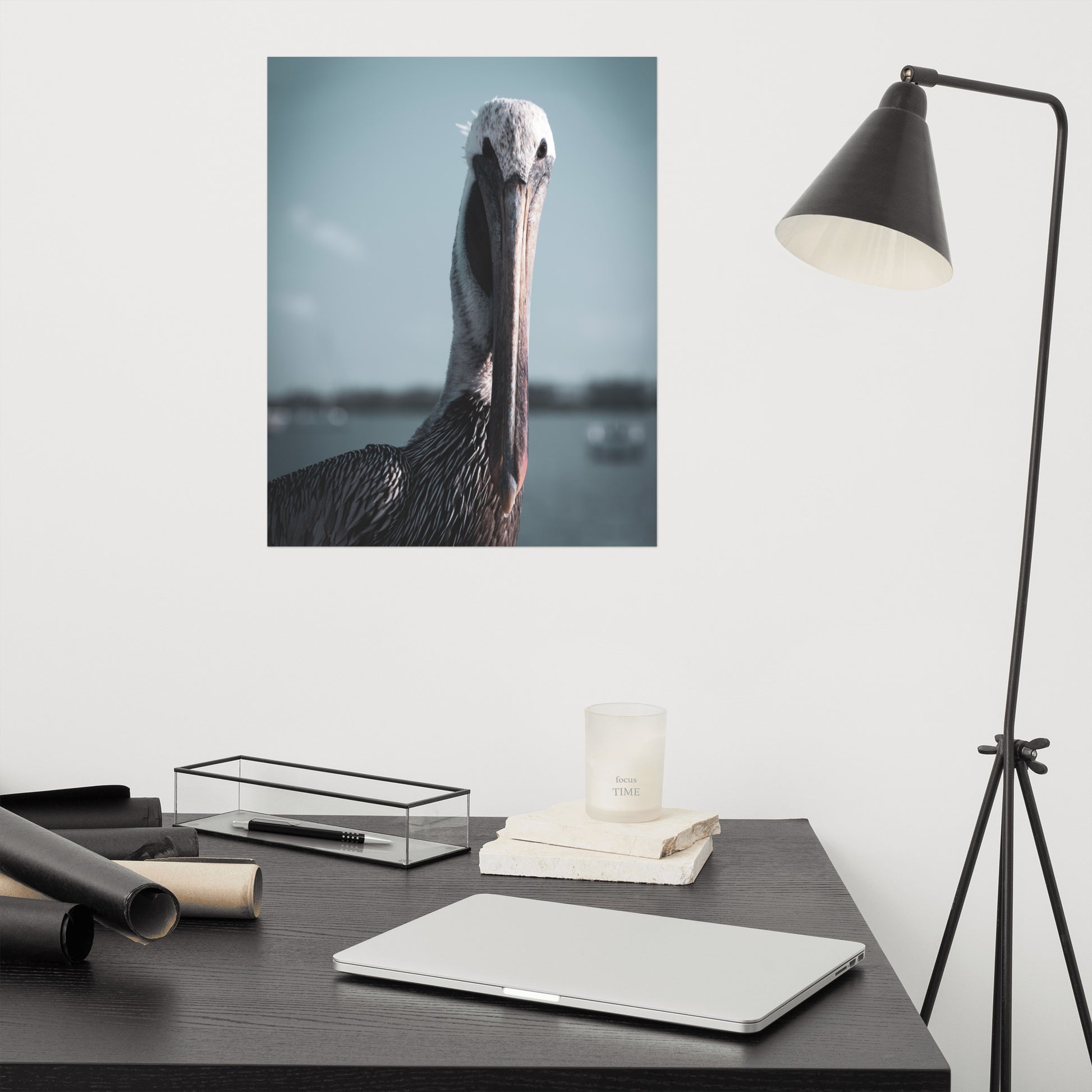 About these bird artwork prints: Bob the Pelican Colorized is a captivating close-up wildlife photograph showcasing a majestic brown and white pelican. With its bright orange beak and curious gaze, the pelican rests on a weathered wooden railing of an old fishing pier off the shores of Tampa Bay, Florida. The image has been enhanced with an aging and blue color effect, creating a dramatic and evocative atmosphere that captures the essence of the rural coastal landscape. This loose, unframed art print is perfect for adding a touch of coastal charm and natural beauty to any space.