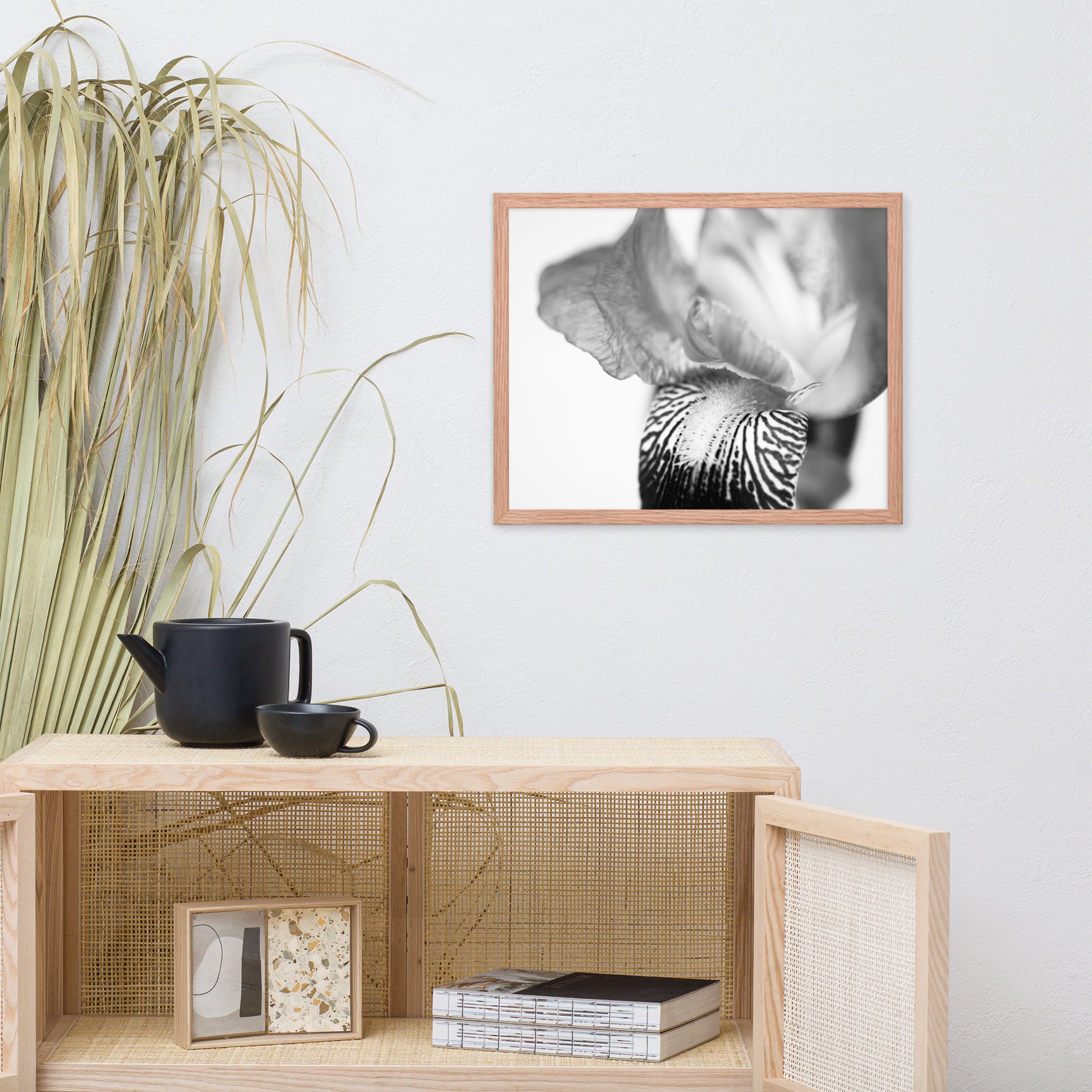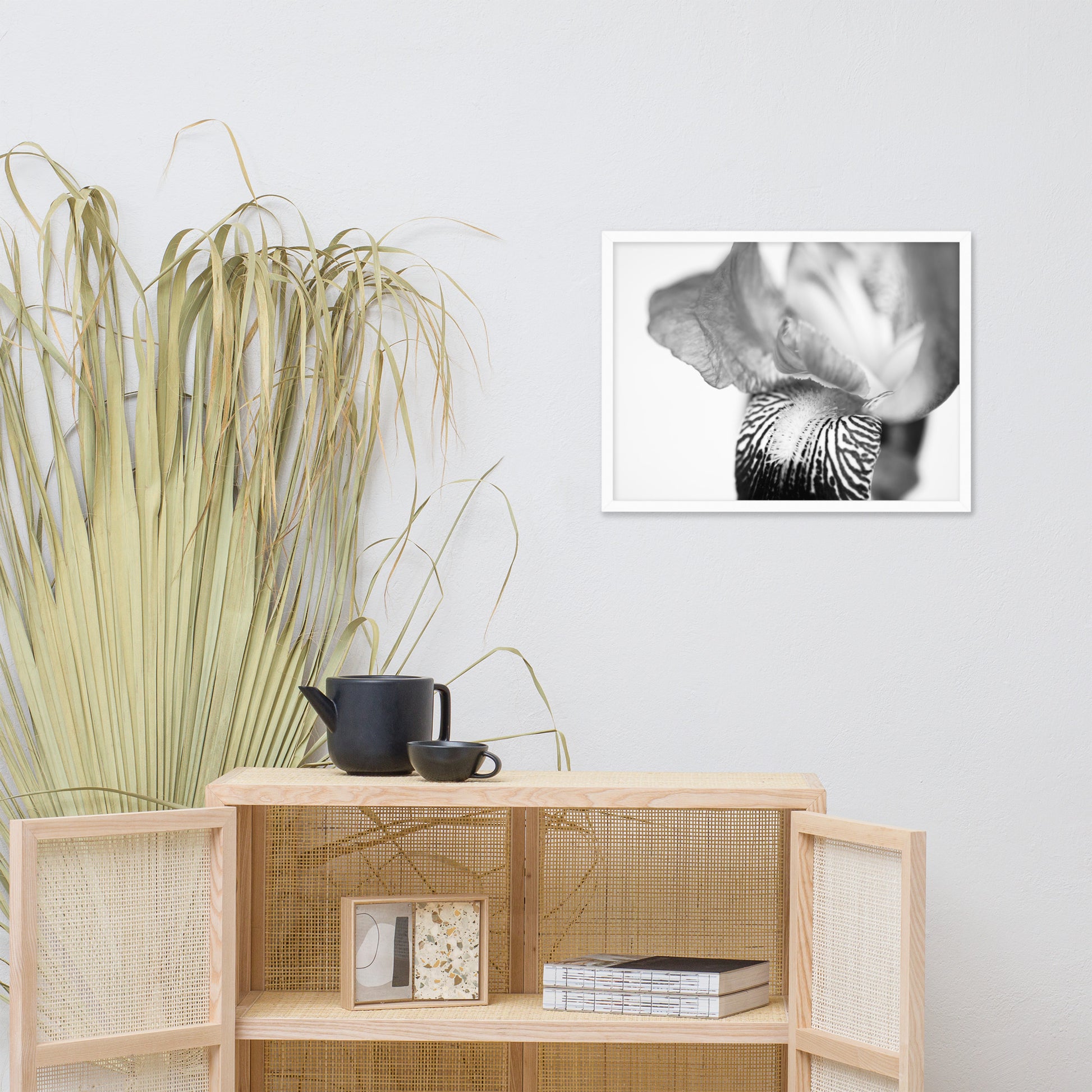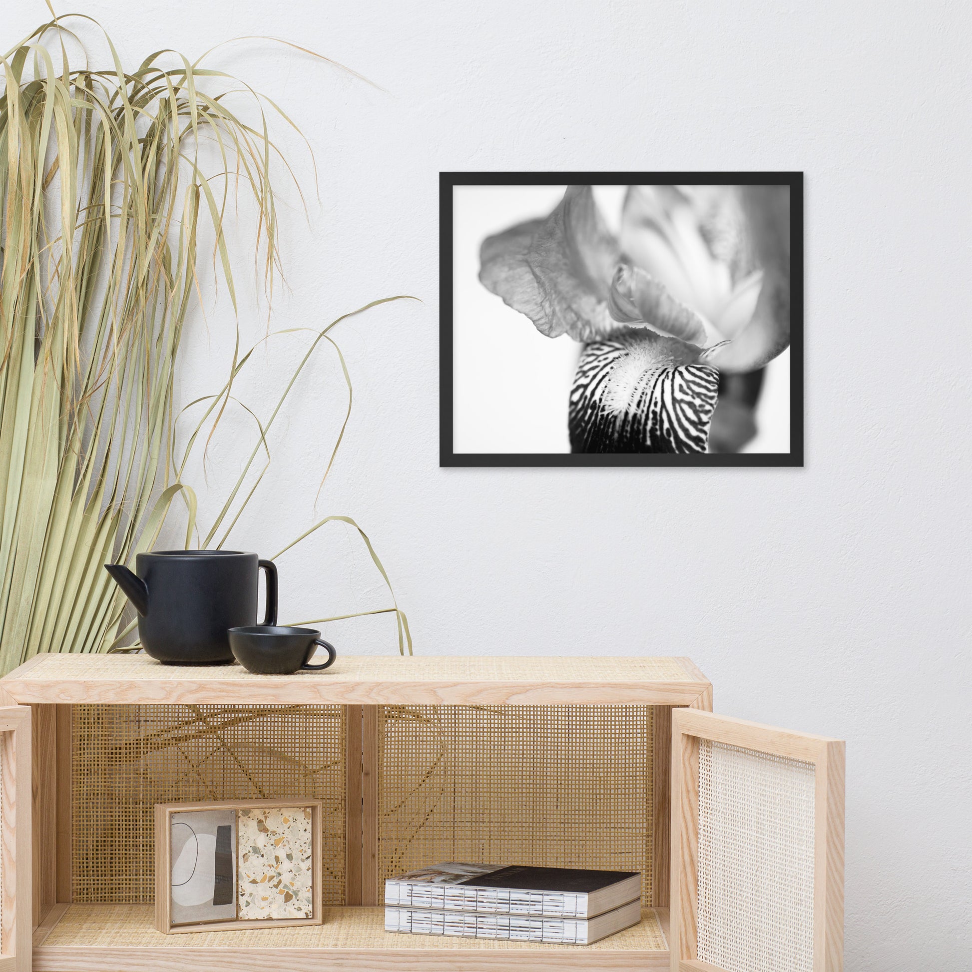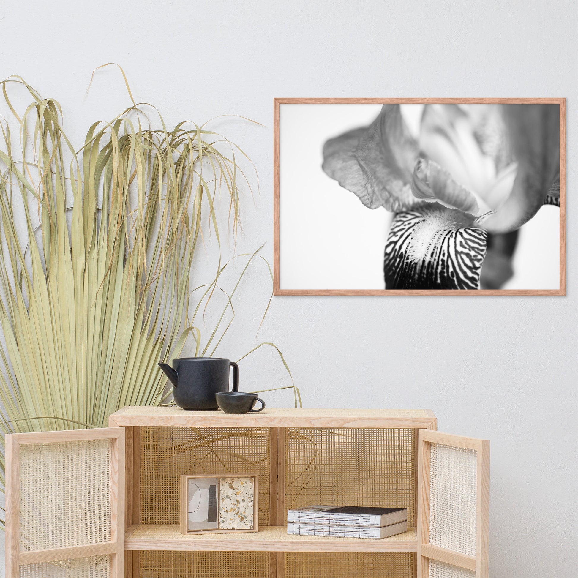 About this black and white floral framed art: Embrace the dramatic elegance of nature with "Bold Iris on White," a captivating framed print that showcases the exquisite details of a Japanese Iris in full bloom. This striking black and white photograph reveals the intricate patterns and textures of the petals, creating a mesmerizing visual display.
