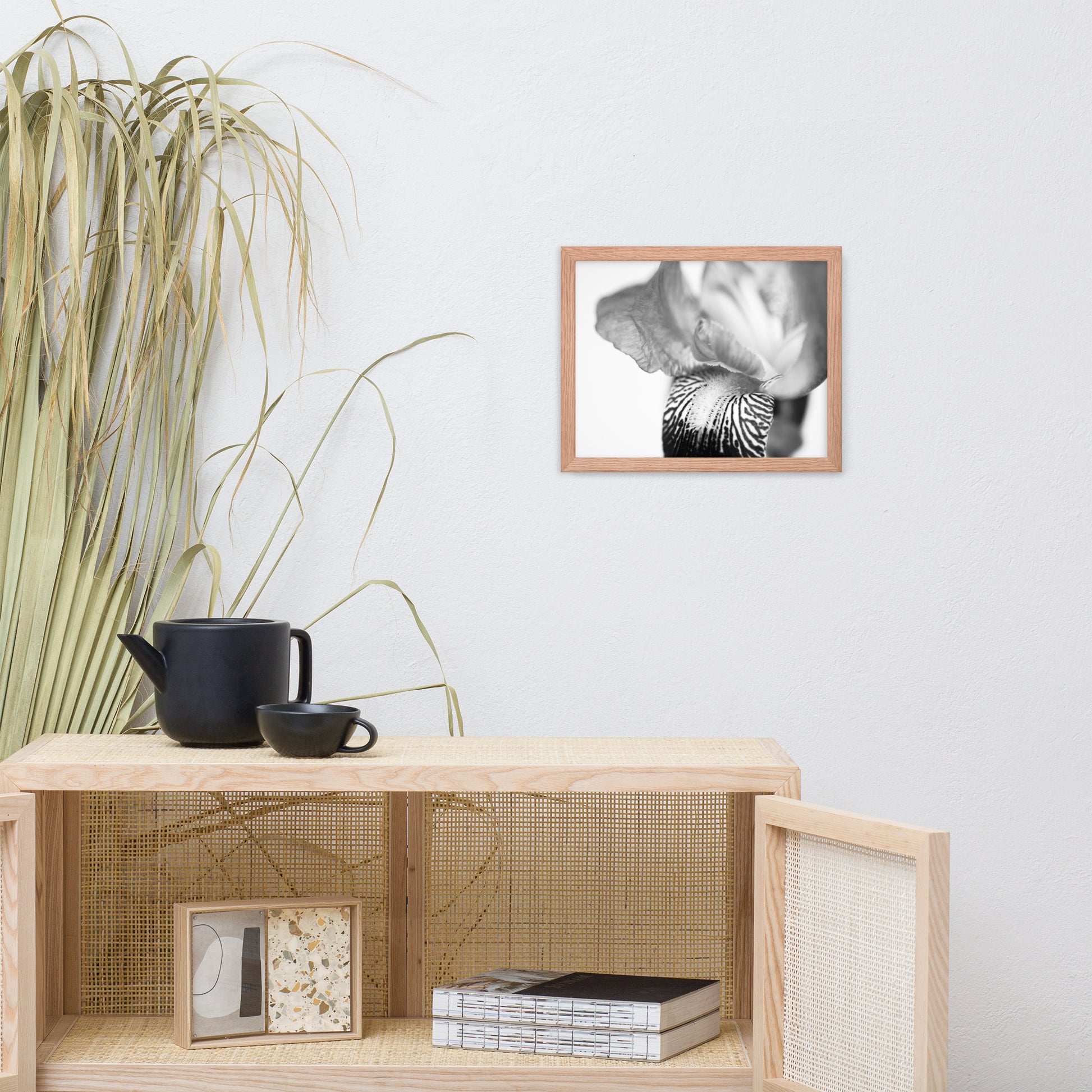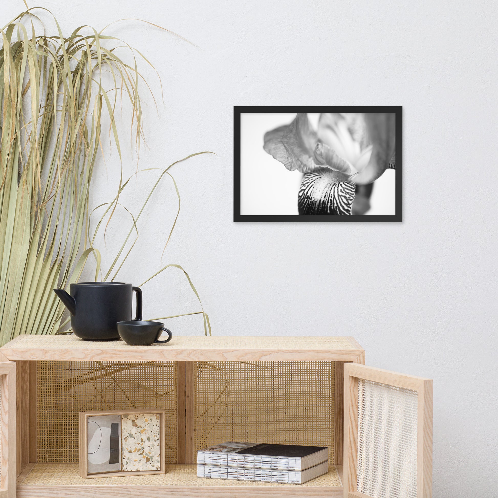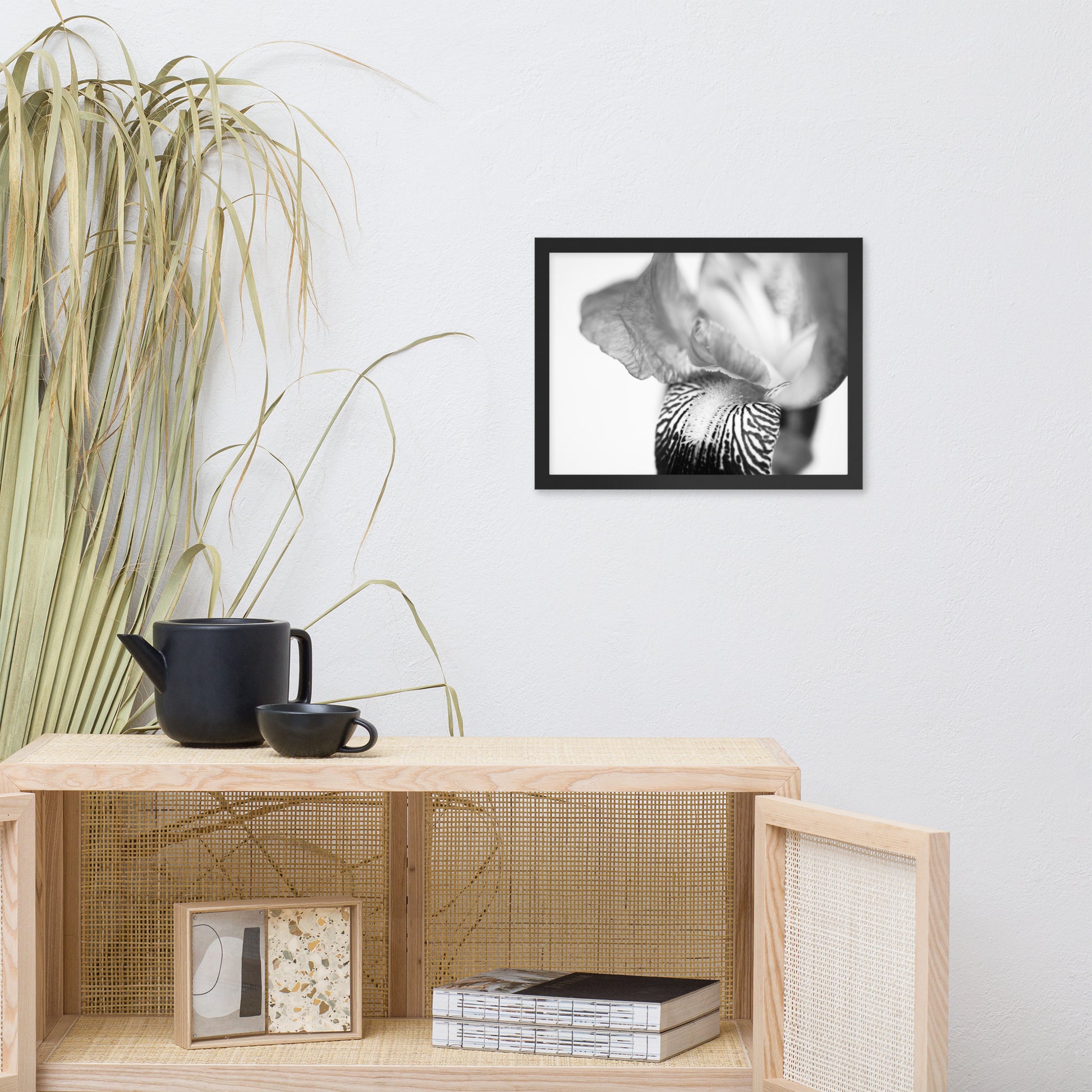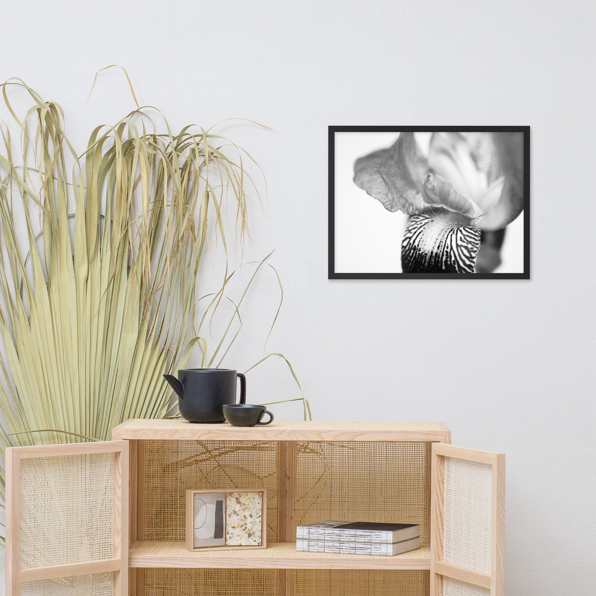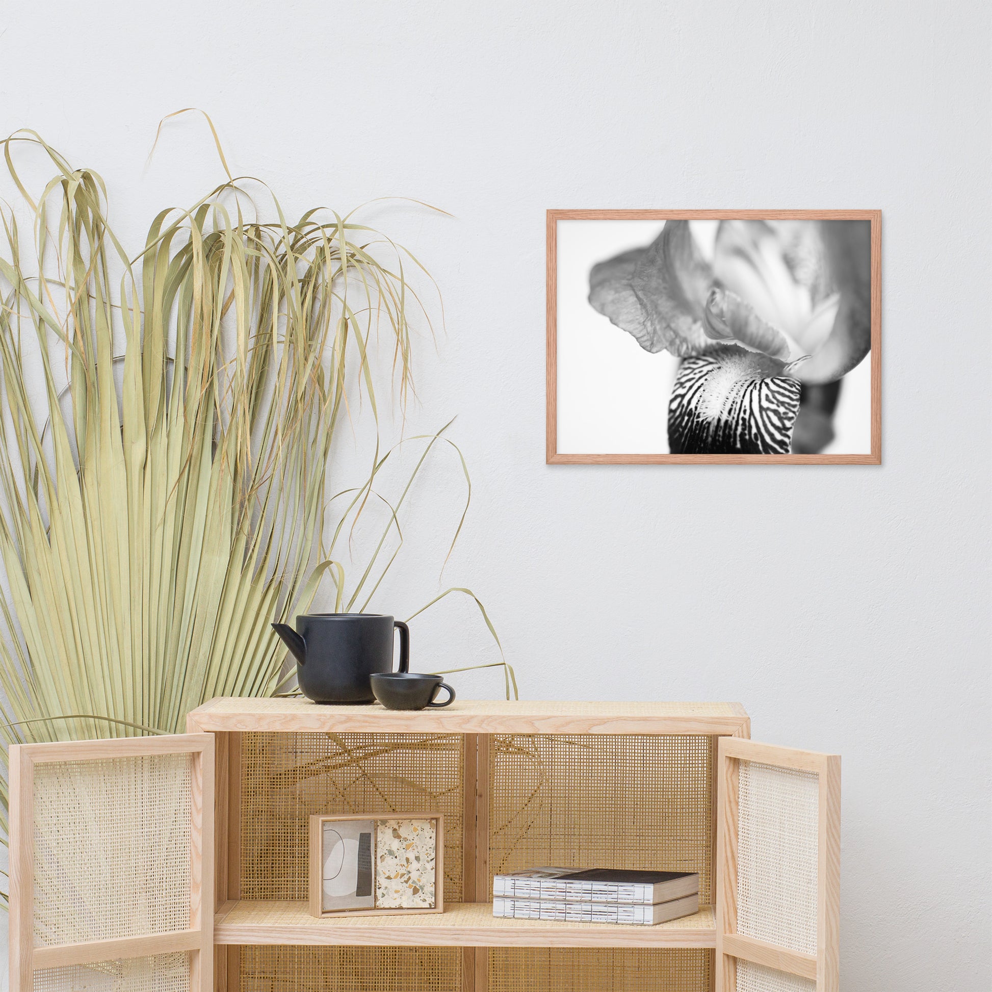 About this black and white floral framed art: Embrace the dramatic elegance of nature with "Bold Iris on White," a captivating framed print that showcases the exquisite details of a Japanese Iris in full bloom. This striking black and white photograph reveals the intricate patterns and textures of the petals, creating a mesmerizing visual display.