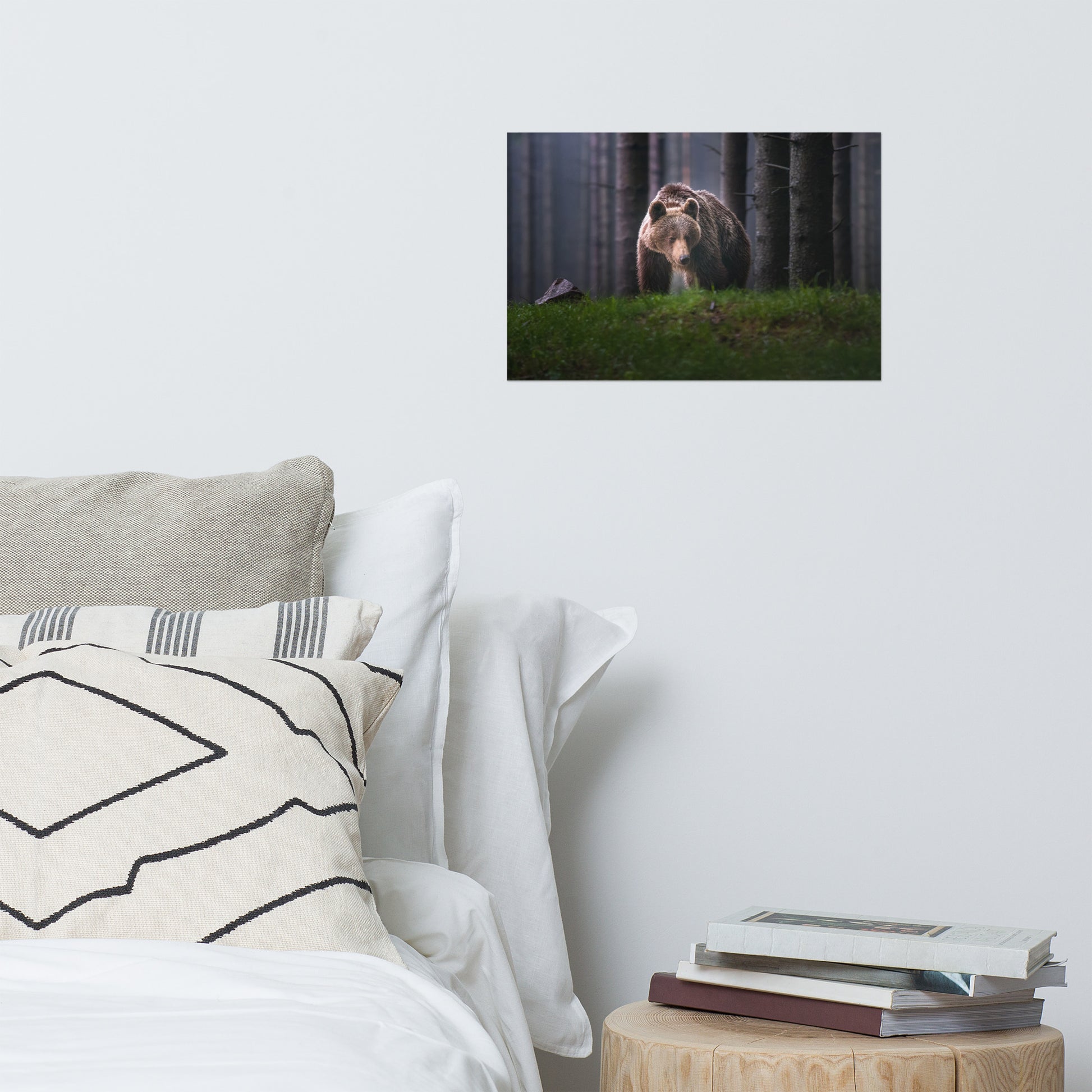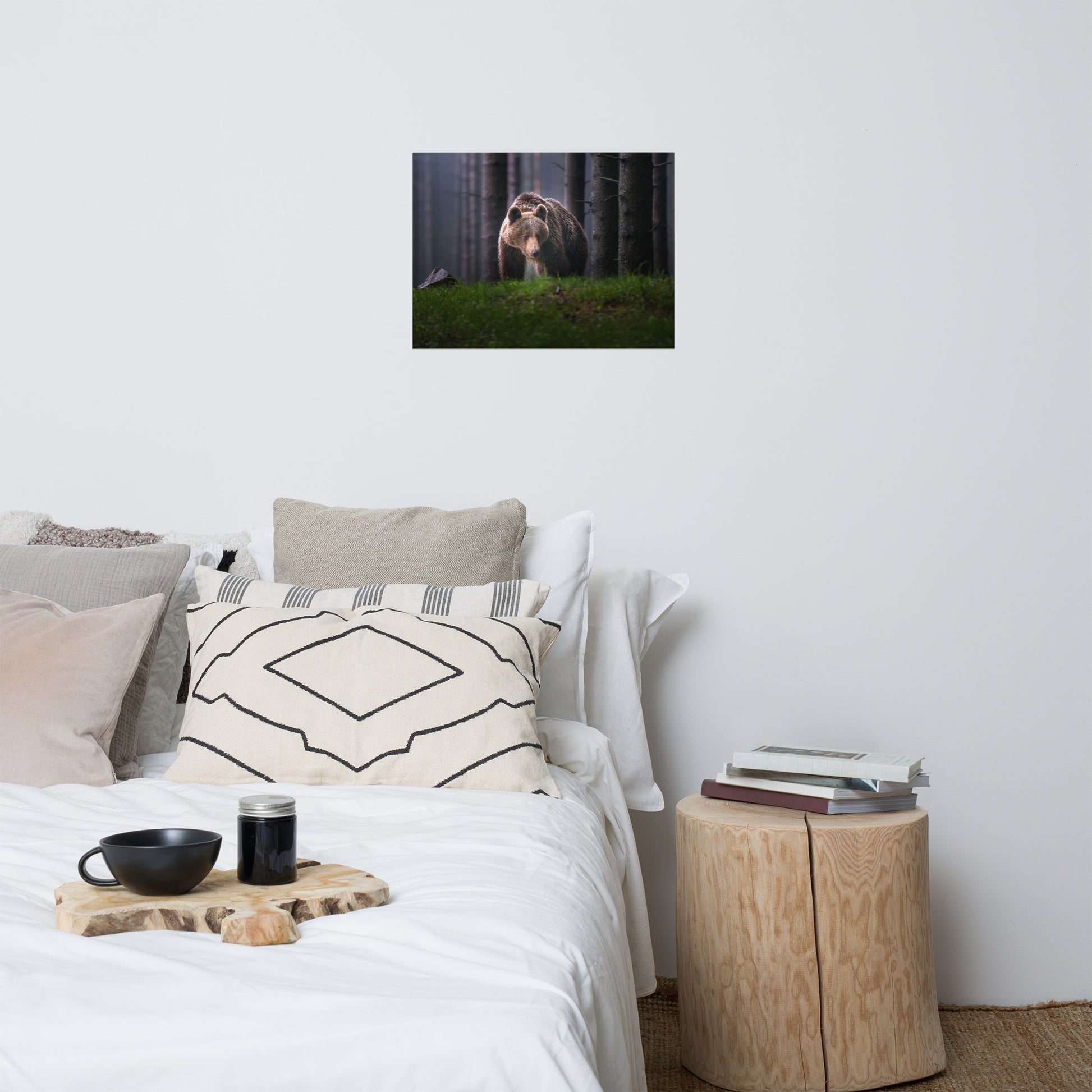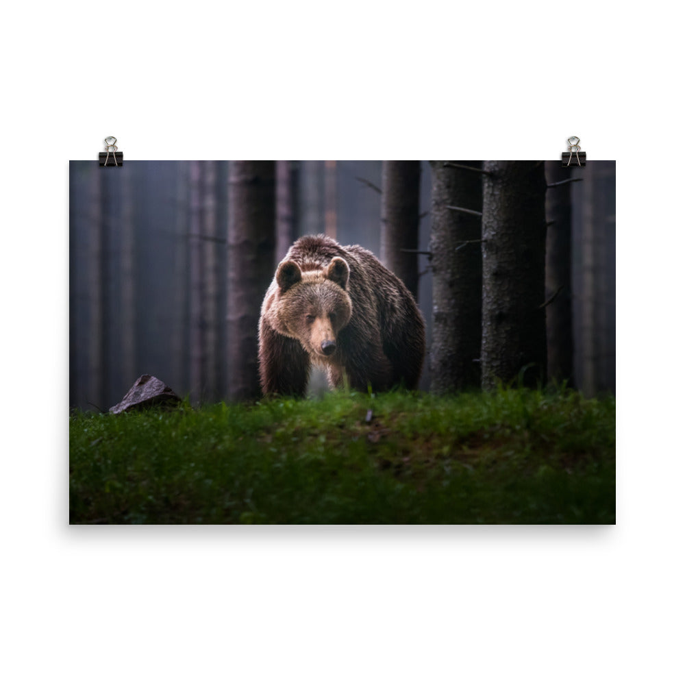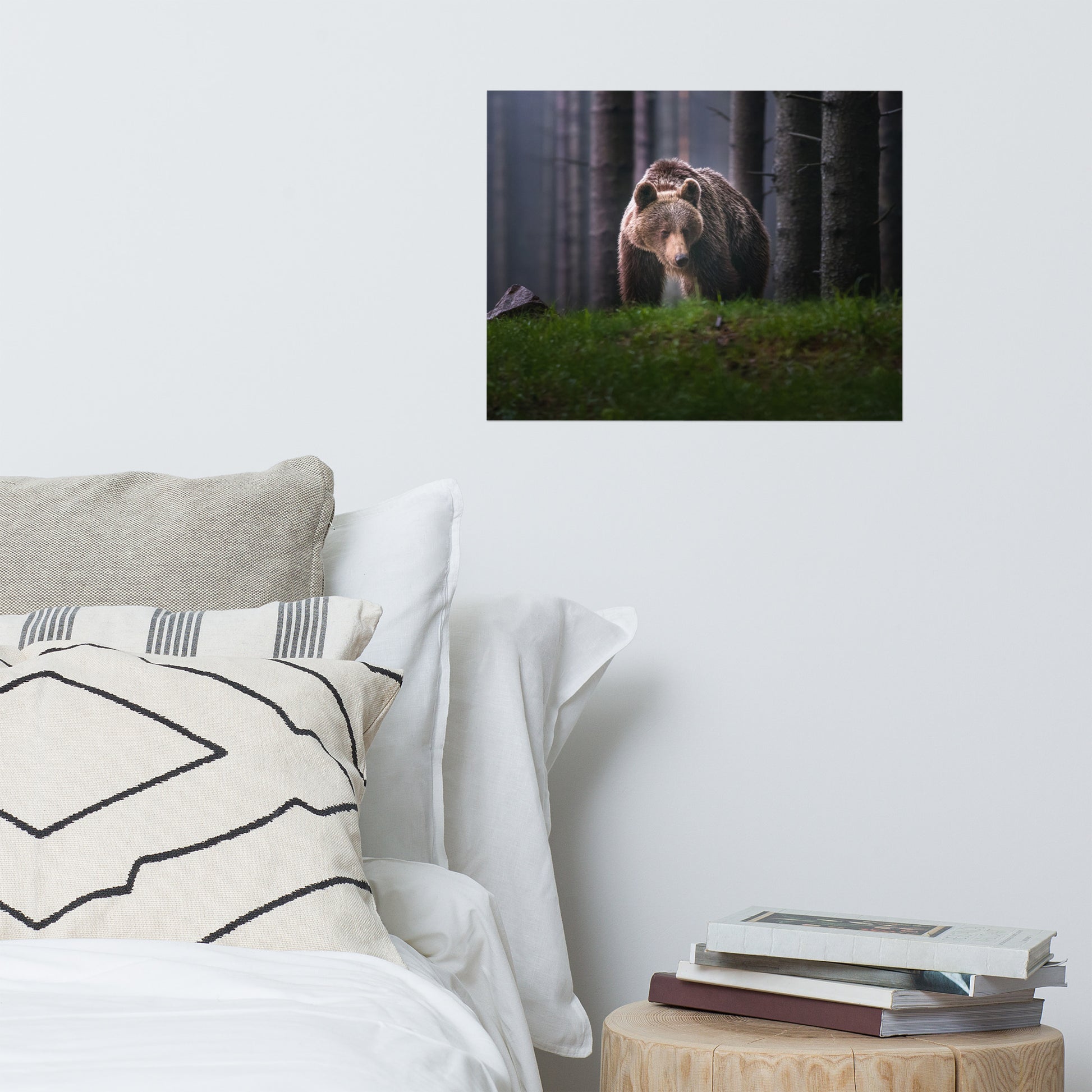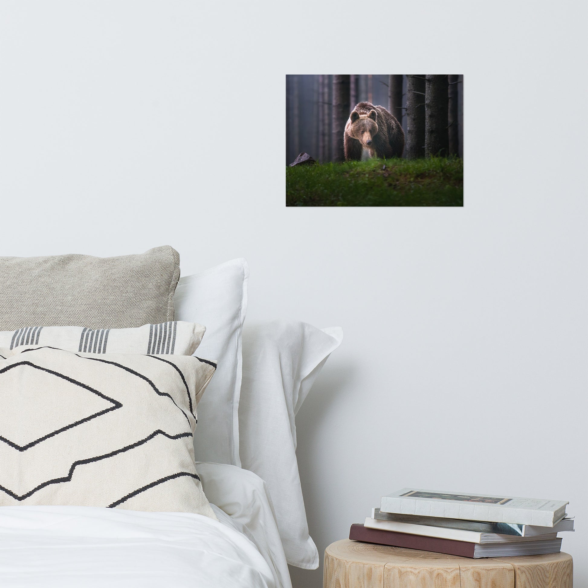 About these bear wall pictures: Capture the majesty of nature with this unframed art print featuring a stunning adult Brown Bear peacefully navigating a lush forest clearing. Whether in search of sustenance or a moment of respite, the bear's tranquil presence is beautifully captured against the vibrant backdrop of the forest. An artistic filter enhances the scene's depth and drama, making this print a captivating addition to any space.