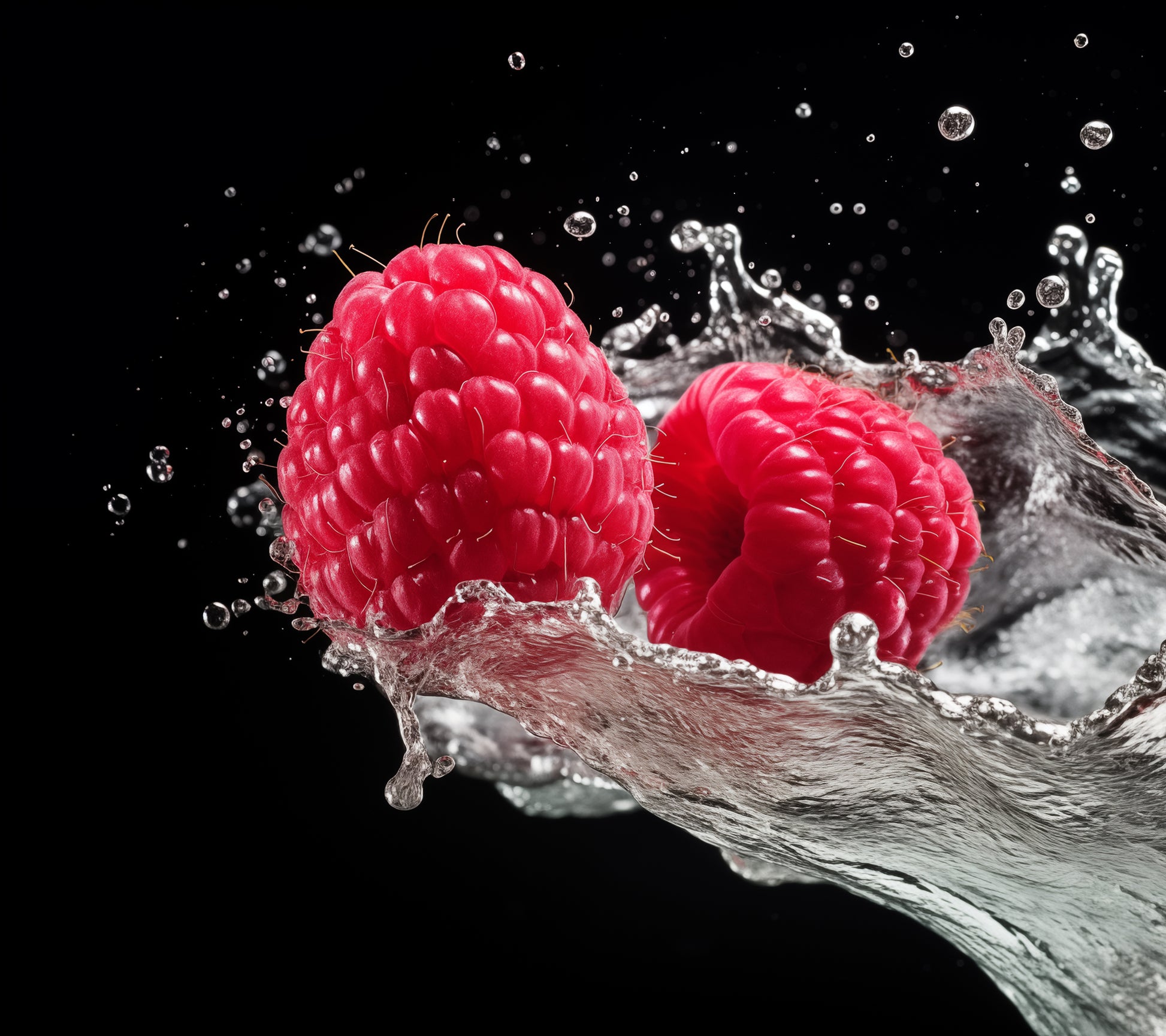 This minimalist digital artwork features two photorealistic raspberries against a stark black background. The vibrant red berries, with their intricate drupelets and glossy sheen, are the focal point. Clear water splashes dynamically beneath them, adding a sense of movement and freshness to the still life. The high-resolution image captures the textures and details with stunning clarity.