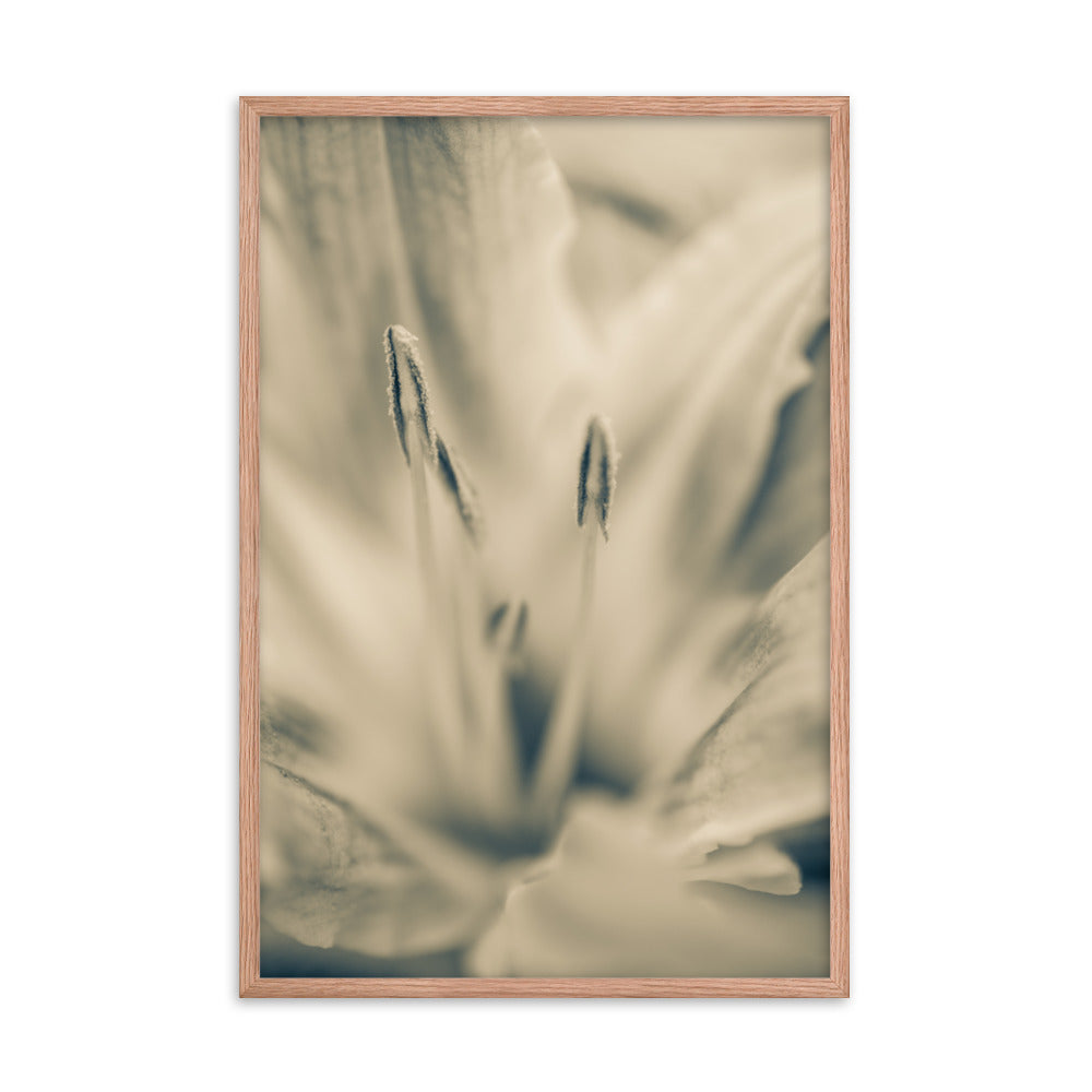 About this minimalist floral print: Indulge in the delicate beauty of nature with "Calm Passion," a minimalist floral print that exudes tranquility and romance. This macro photograph captures the intimate details of a Tiger Lily in full bloom, focusing on the intricate stigmas nestled within the flower's heart. The sepia tone adds a timeless quality, evoking a sense of nostalgia and warmth.