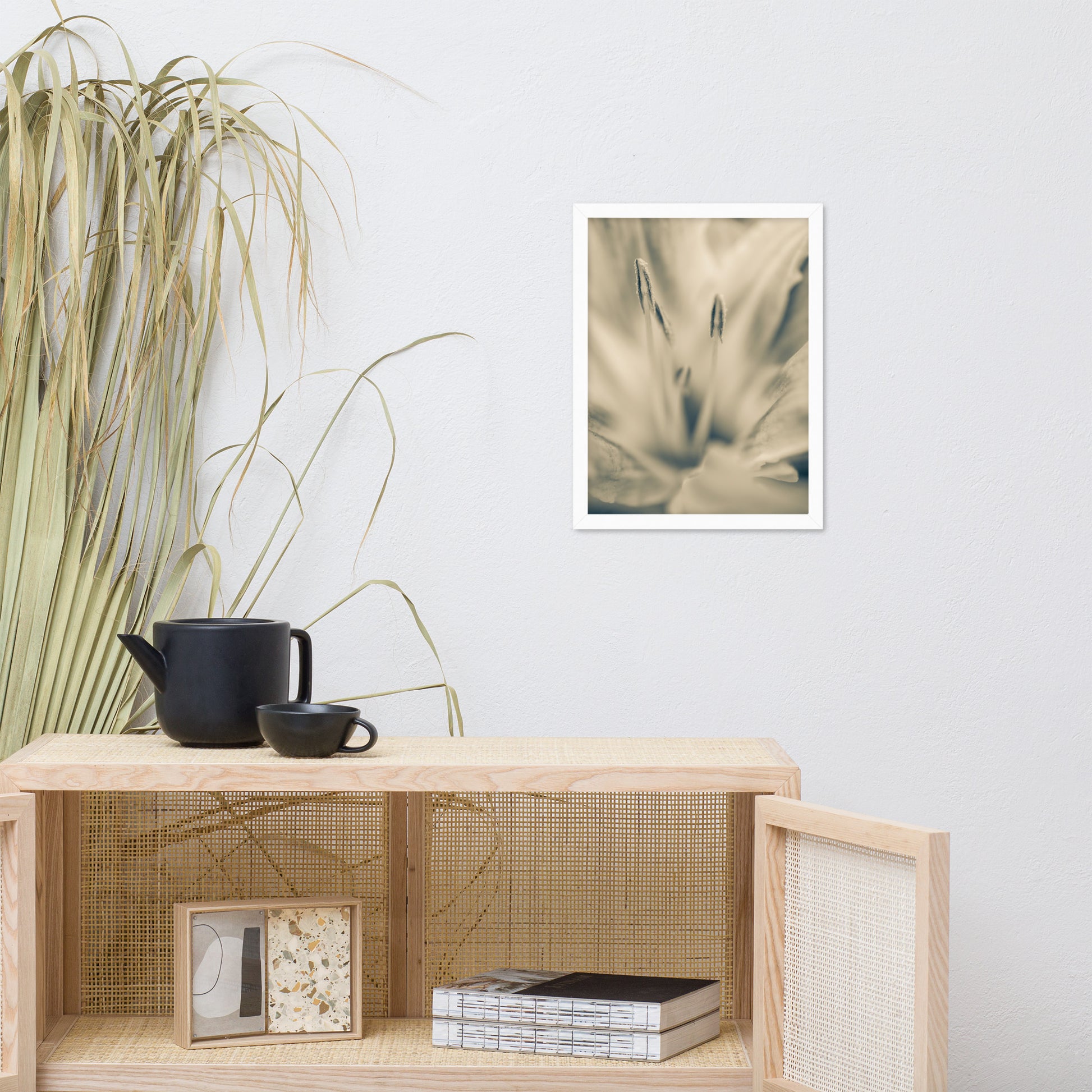 This exquisite artwork invites you to pause and appreciate the simple elegance of the natural world. Its muted color palette and soft focus create a soothing atmosphere, making it a perfect addition to any space seeking a touch of serenity. Whether displayed in a cozy living room, a peaceful bedroom, a spa-like bathroom, a sophisticated dining room, or a calming office, this framed print will infuse your surroundings with a sense of calm and beauty.