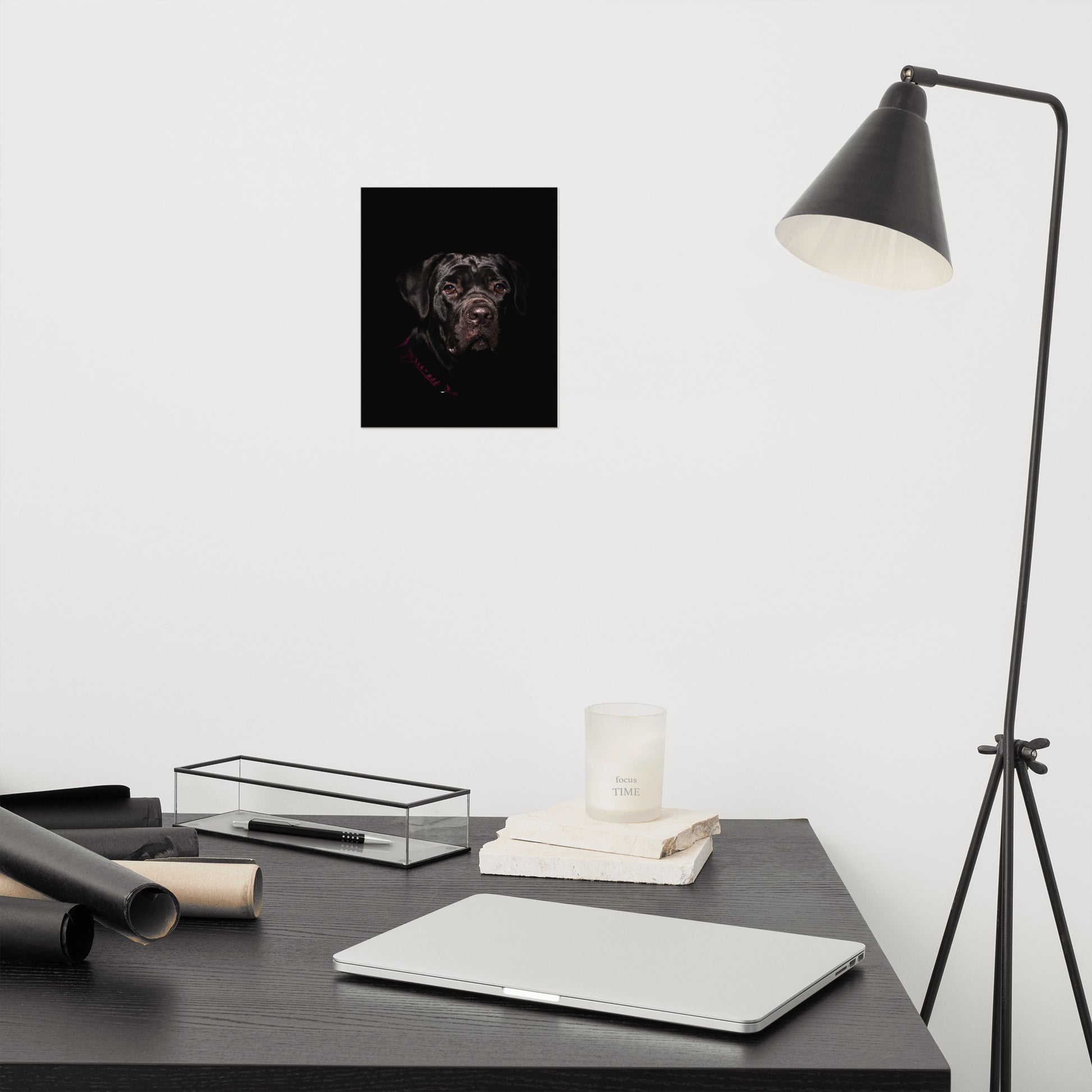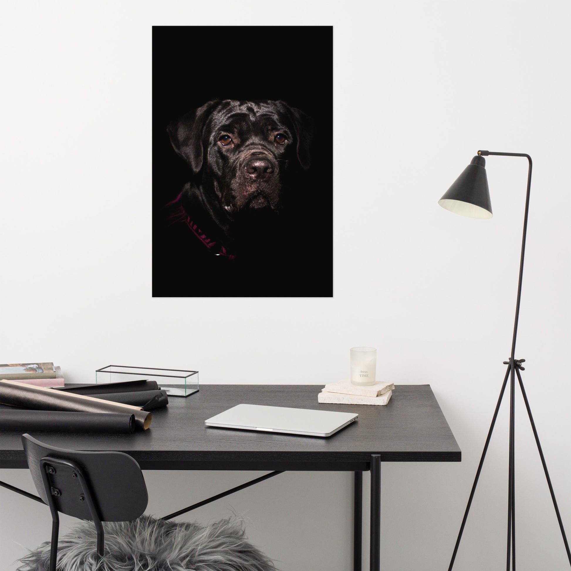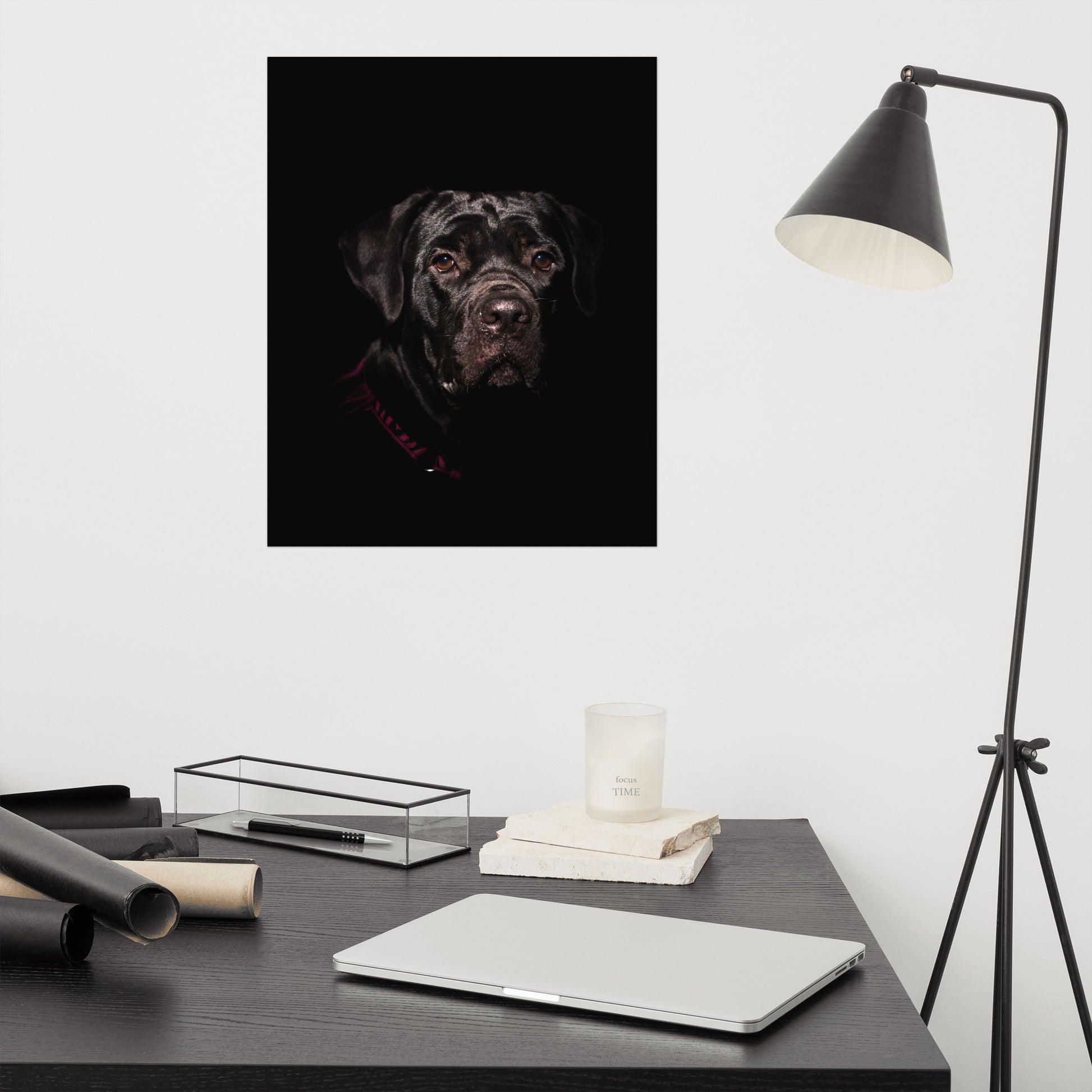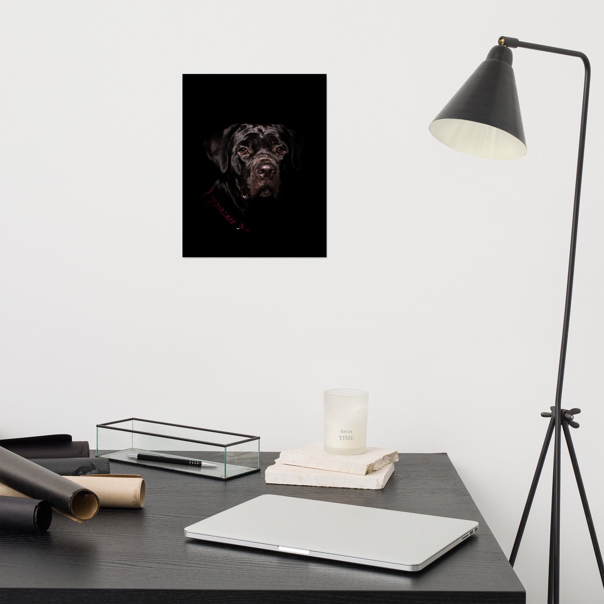 About this dog art print: Cane Corso Low Key is a dramatic animal portrait of a 10-month-old, all-black Cane Corso. Set against a solid black background and illuminated by a single light source, this unframed print captures the pup's face in stunning detail. Perfect for animal lovers and art enthusiasts alike, this striking image will make a bold statement in any home or office.