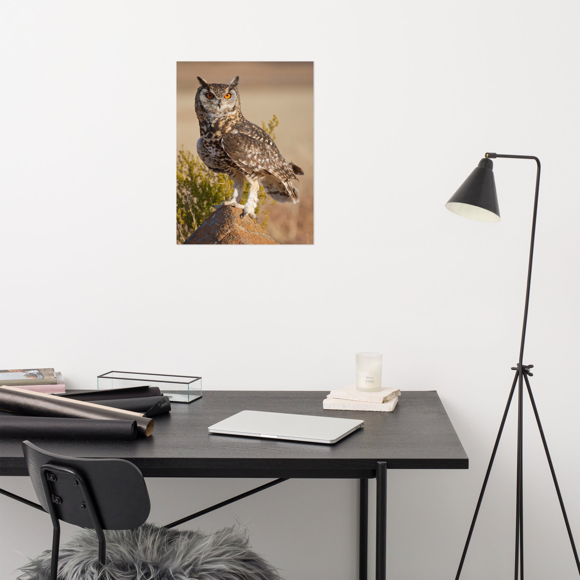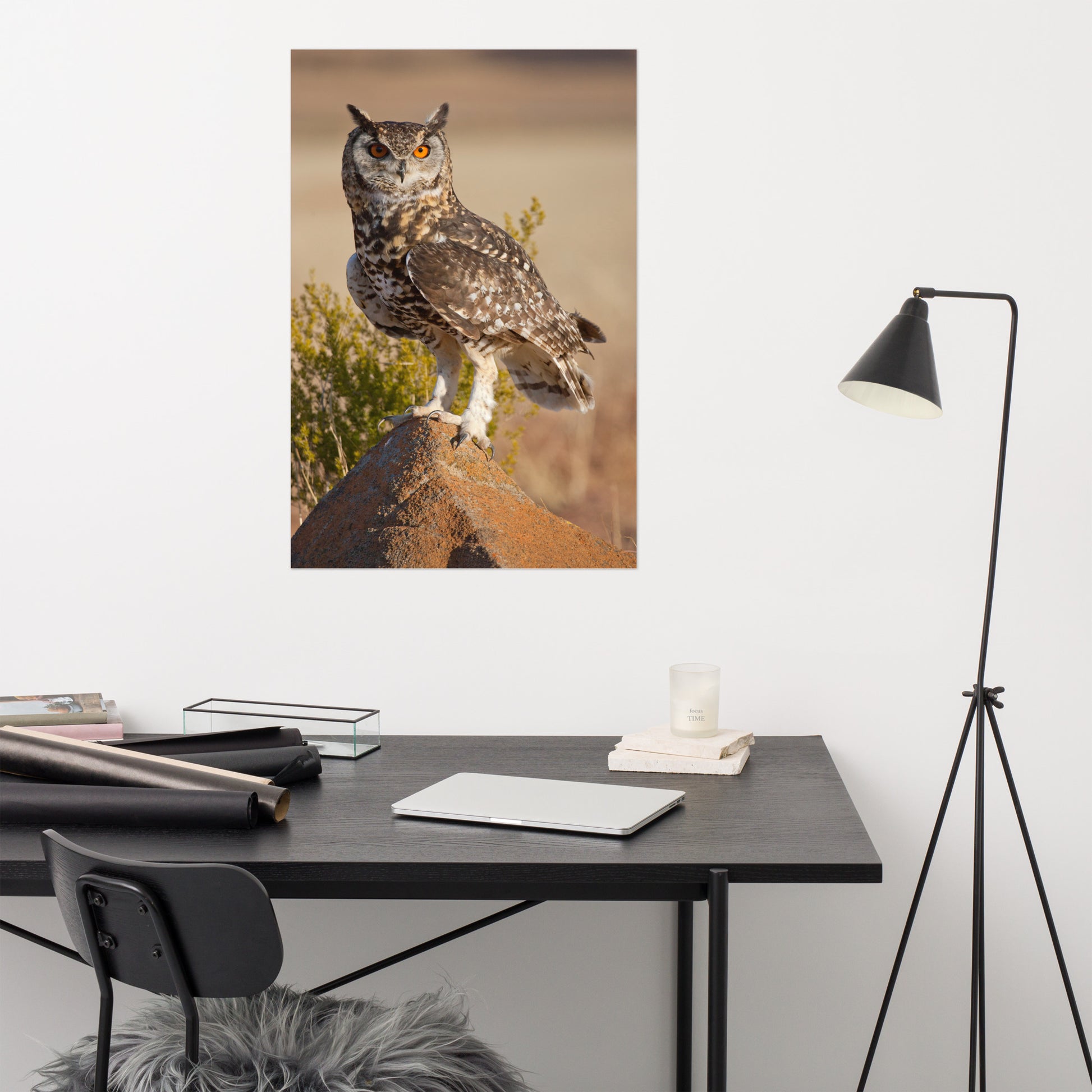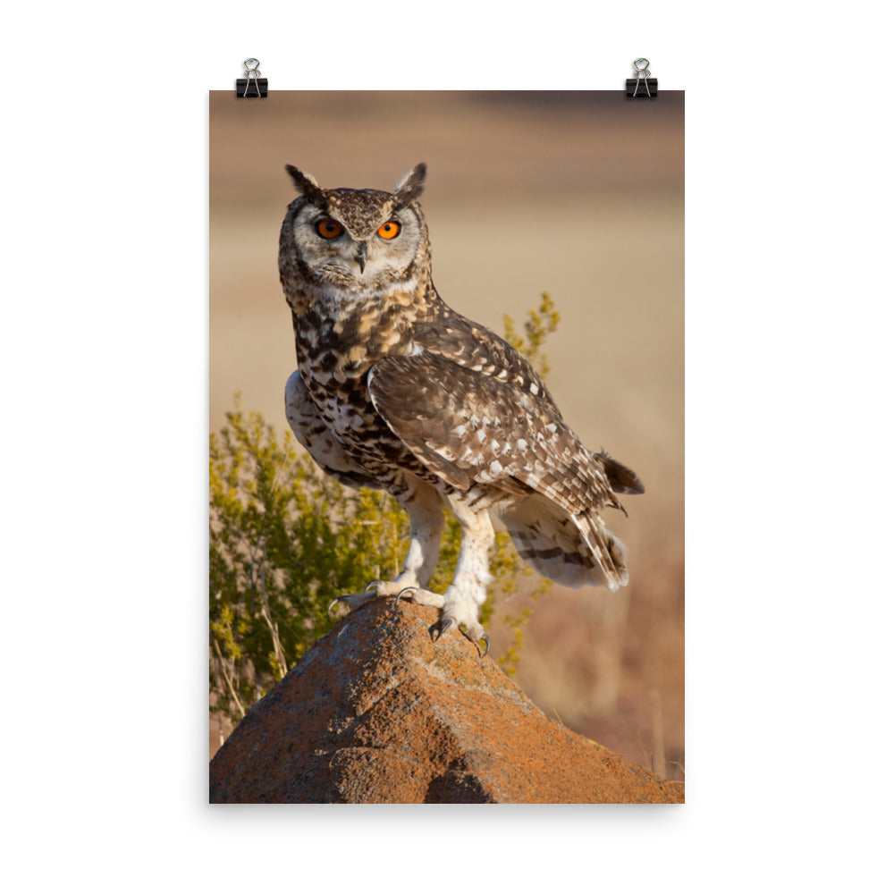 About this rustic farmhouse artwork: Capture the untamed beauty of the wild with this stunning wildlife photograph of a Cape Eagle Owl. Perched atop a weathered rock, its mottled brown and white feathers blend seamlessly with the rugged landscape. With piercing orange eyes fixed on the horizon, the owl exudes an air of quiet strength and wisdom. This loose, unframed print allows you the freedom to customize your display and bring a touch of the natural world into your home or office.