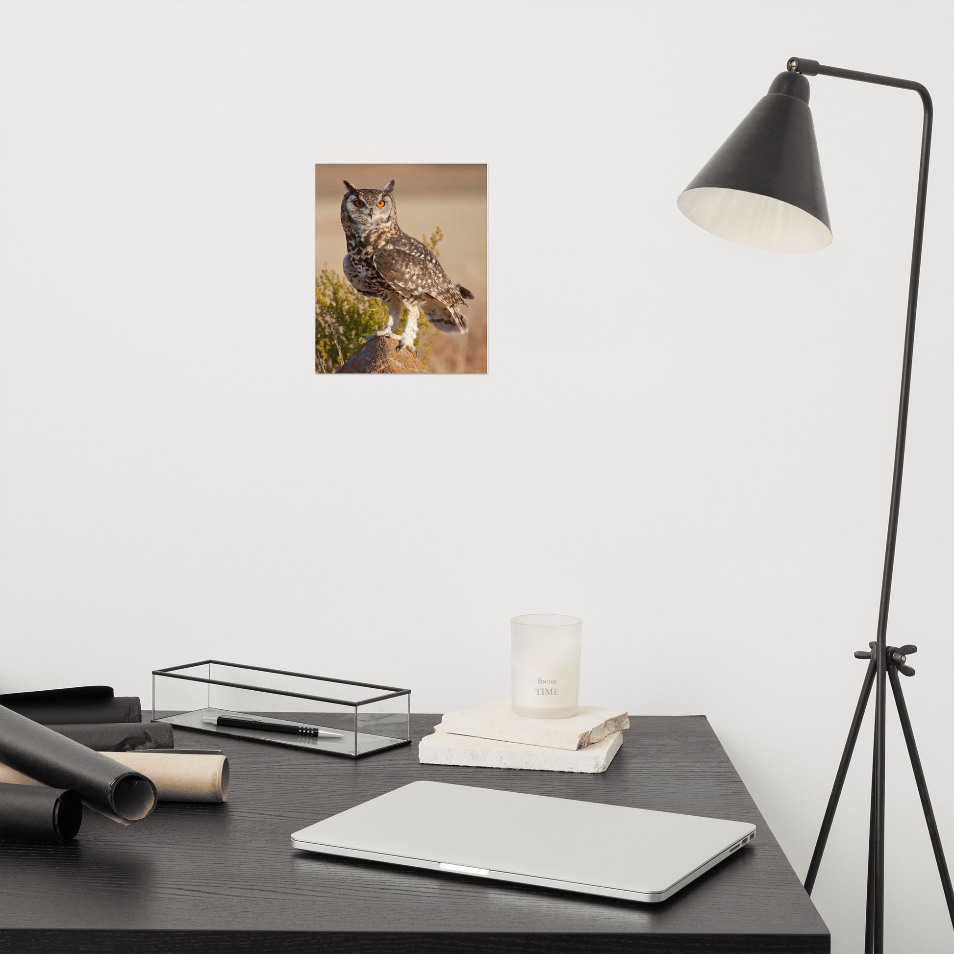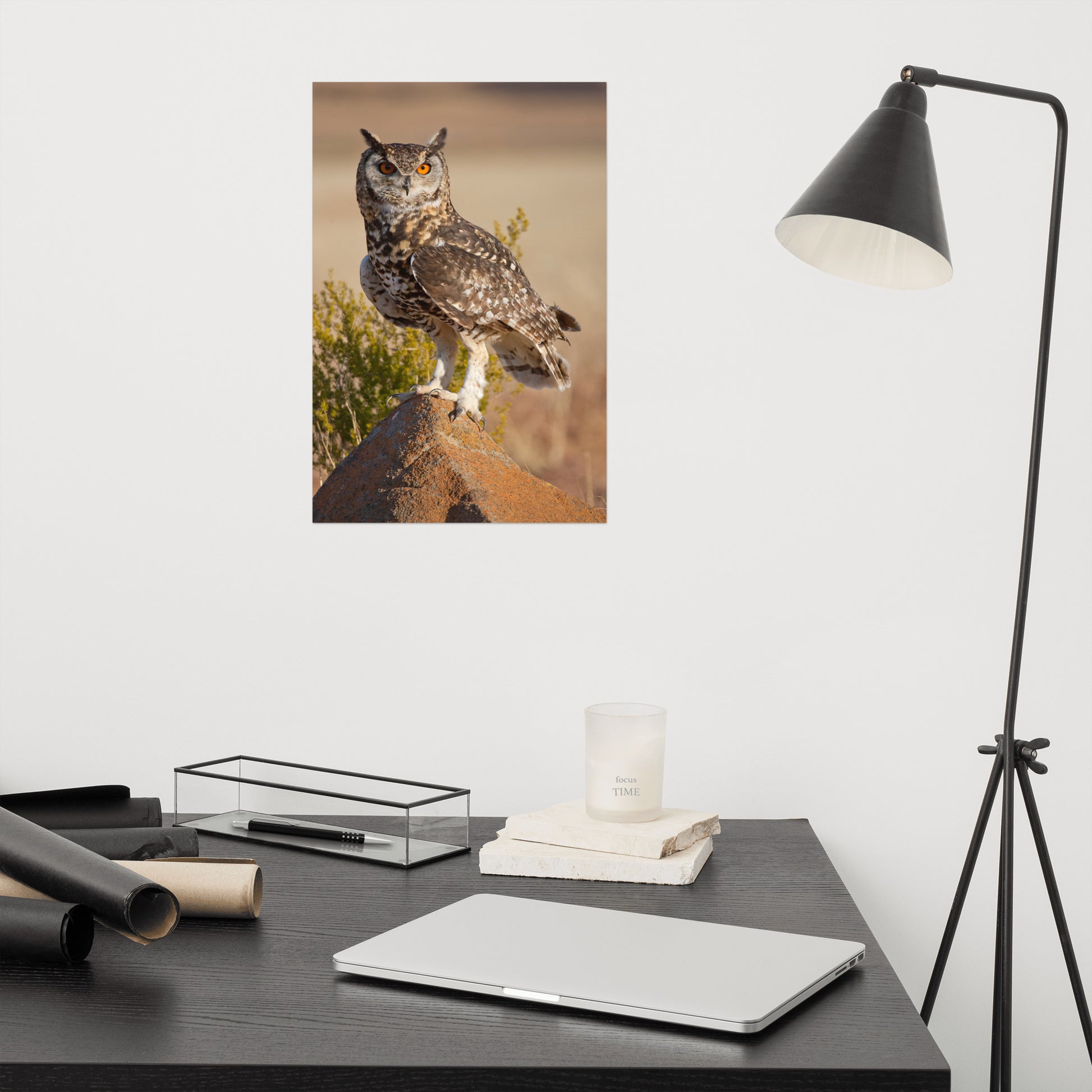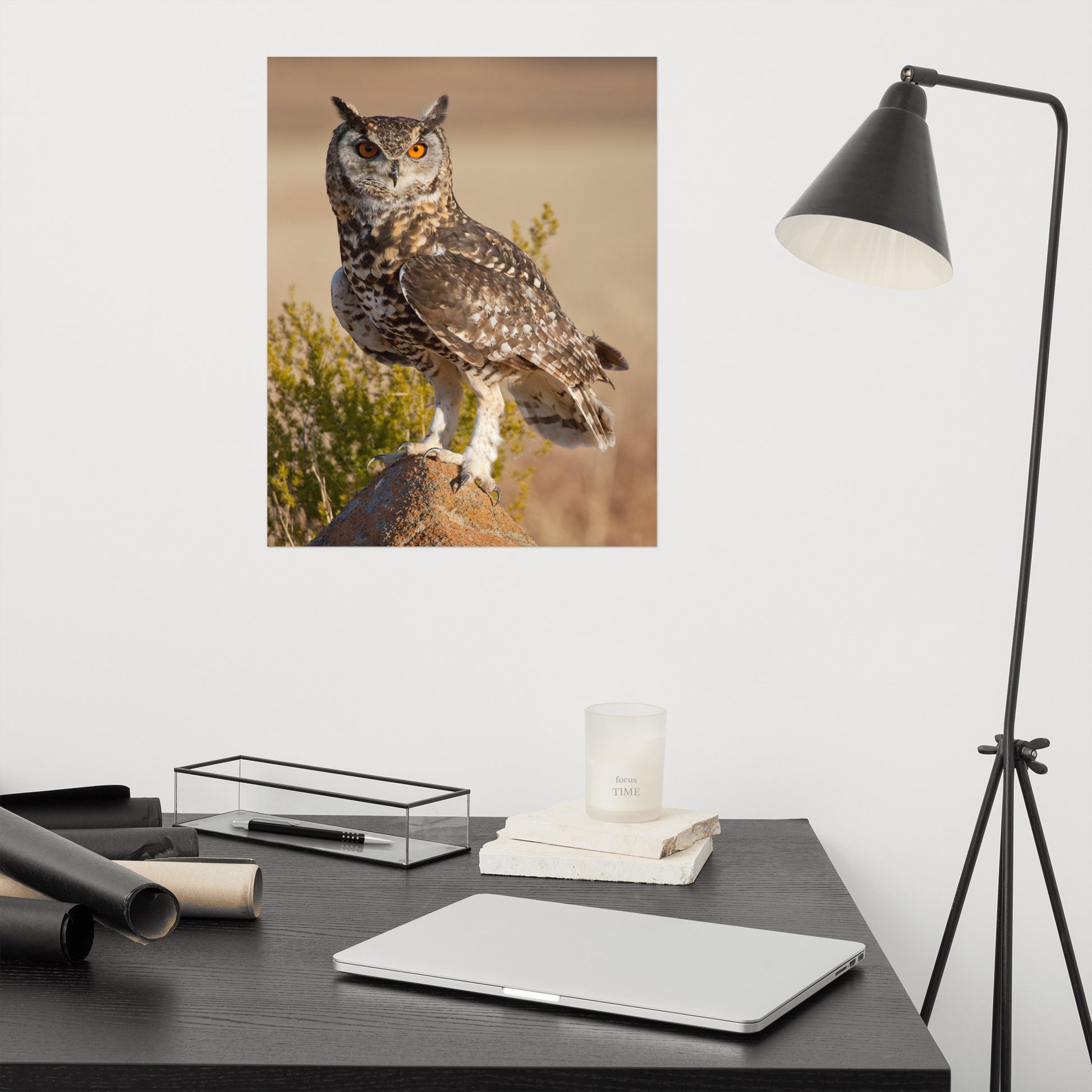 About this rustic farmhouse artwork: Capture the untamed beauty of the wild with this stunning wildlife photograph of a Cape Eagle Owl. Perched atop a weathered rock, its mottled brown and white feathers blend seamlessly with the rugged landscape. With piercing orange eyes fixed on the horizon, the owl exudes an air of quiet strength and wisdom. This loose, unframed print allows you the freedom to customize your display and bring a touch of the natural world into your home or office.