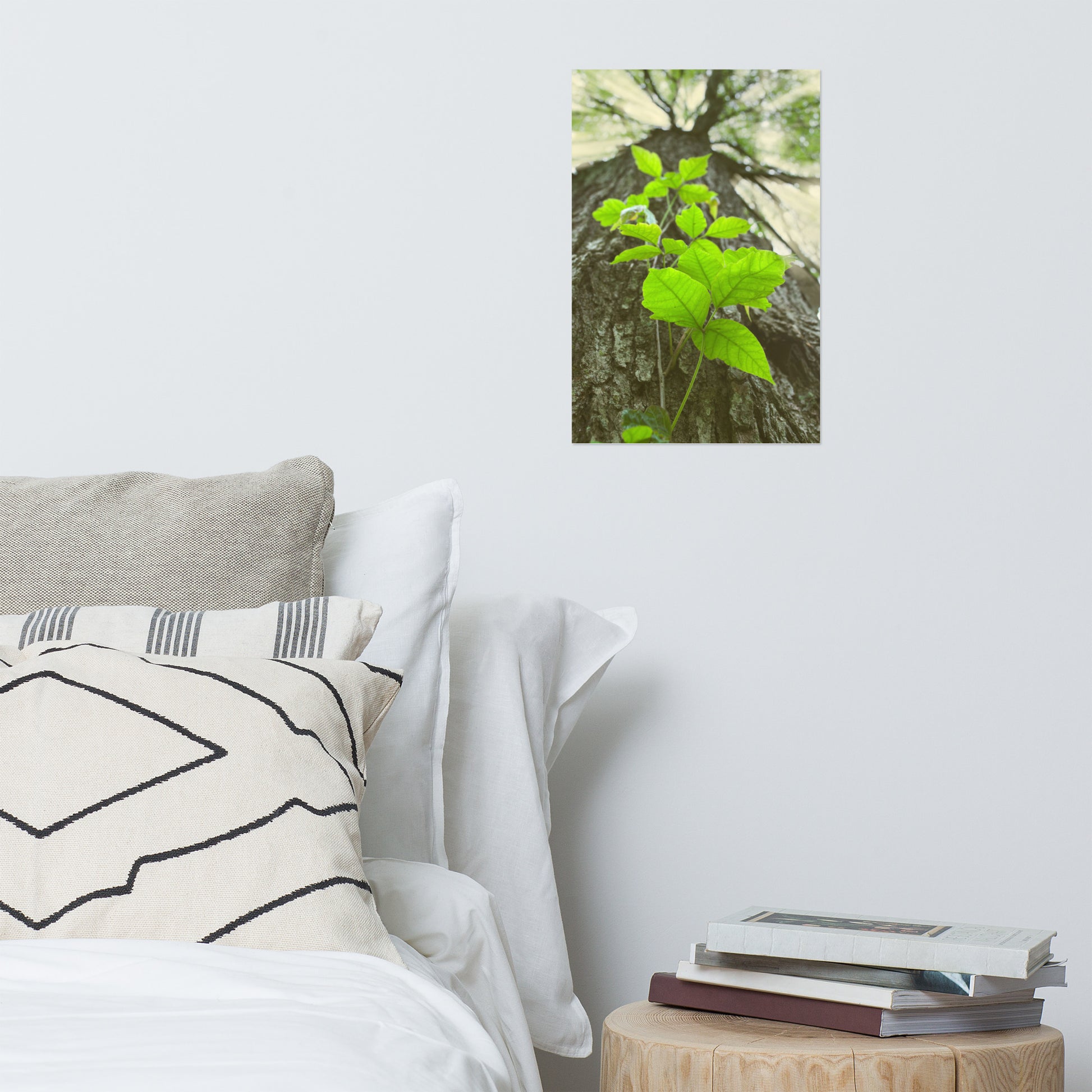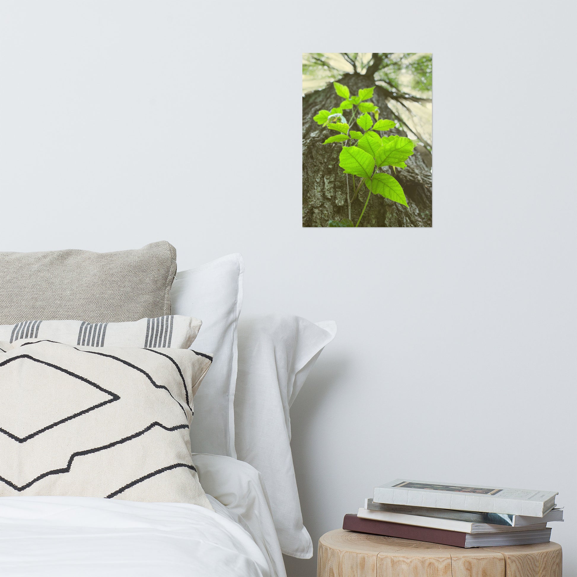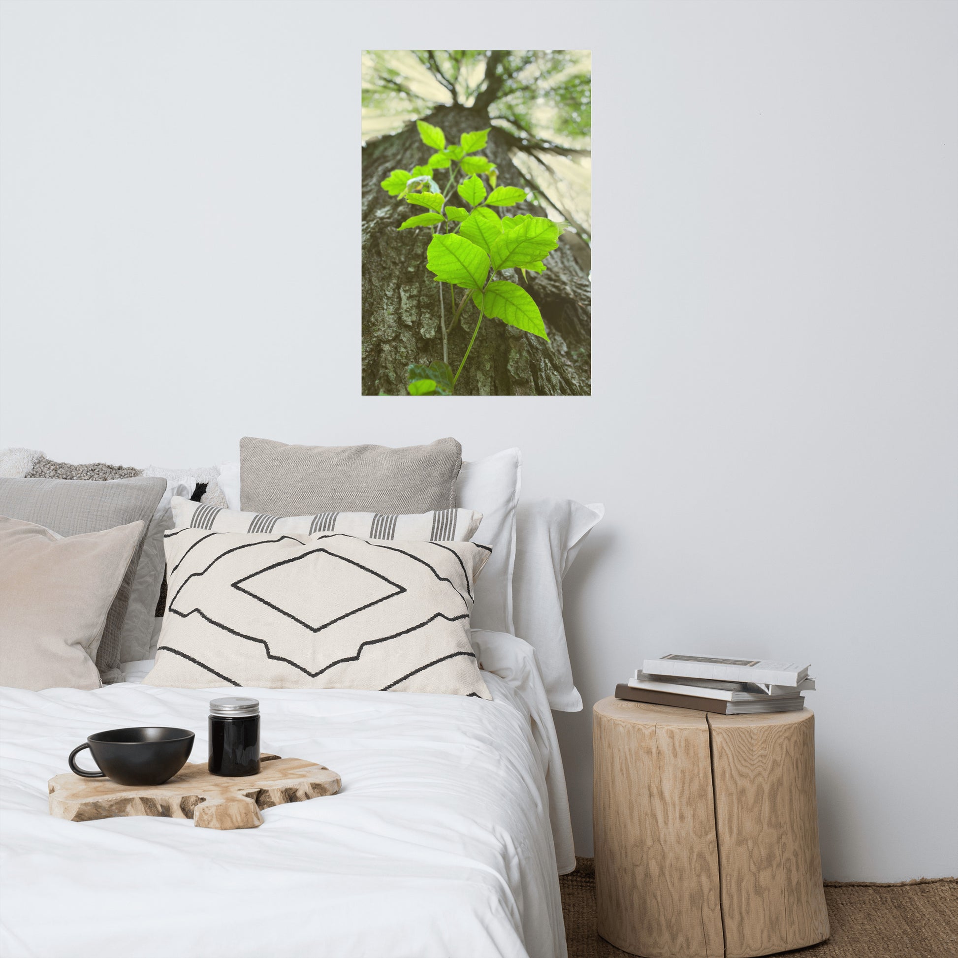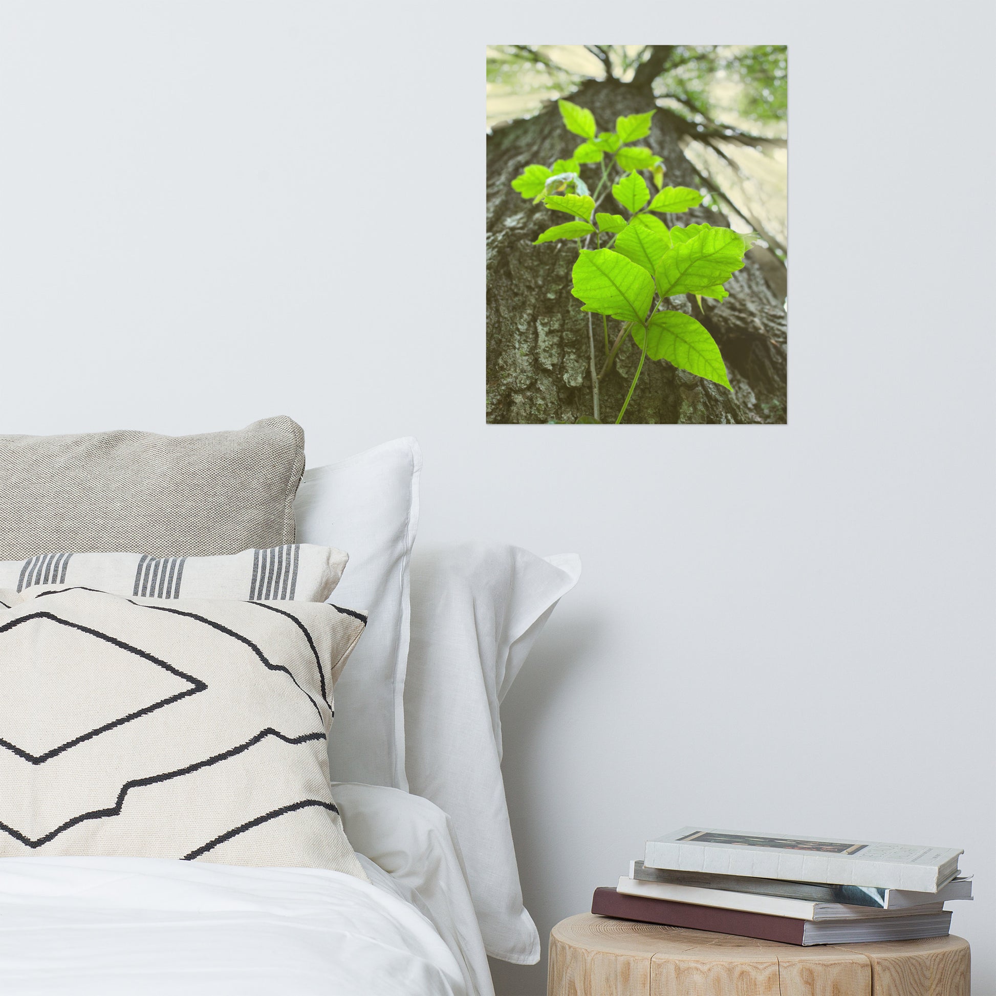 About this farmhouse decor wall art: Climbing The Tree is a breathtaking nature photograph that transports you to the heart of a tranquil forest. Imagine a vibrant vine of Poison Ivy gracefully winding its way up the rough bark of an ancient tree, reaching towards the radiant sunlight filtering through the leaves above.