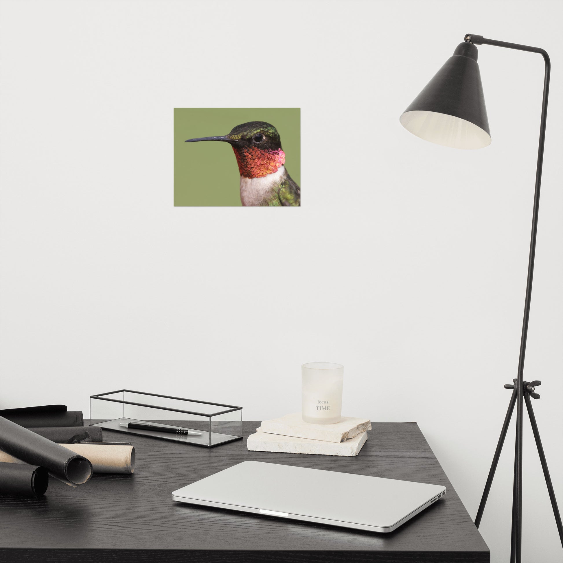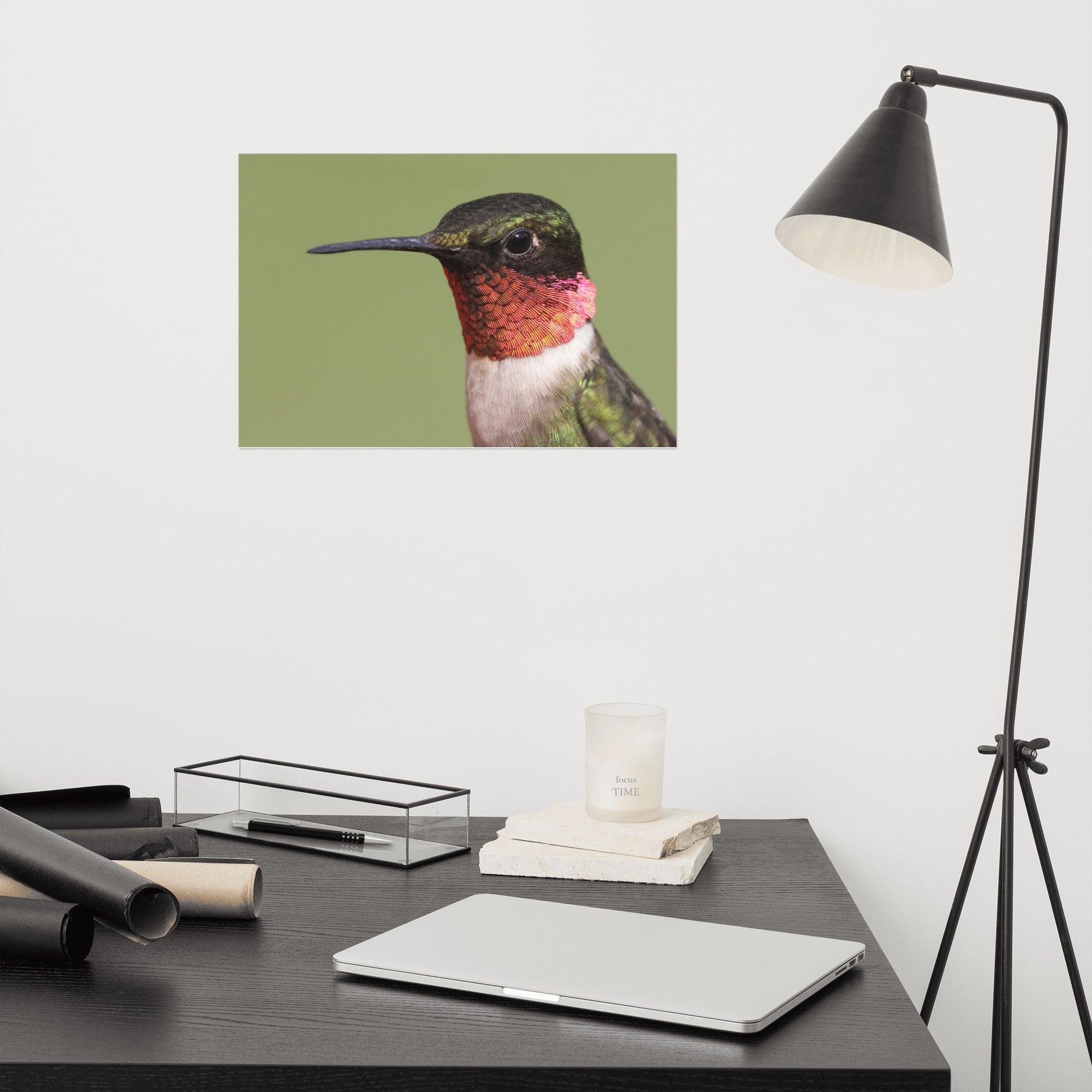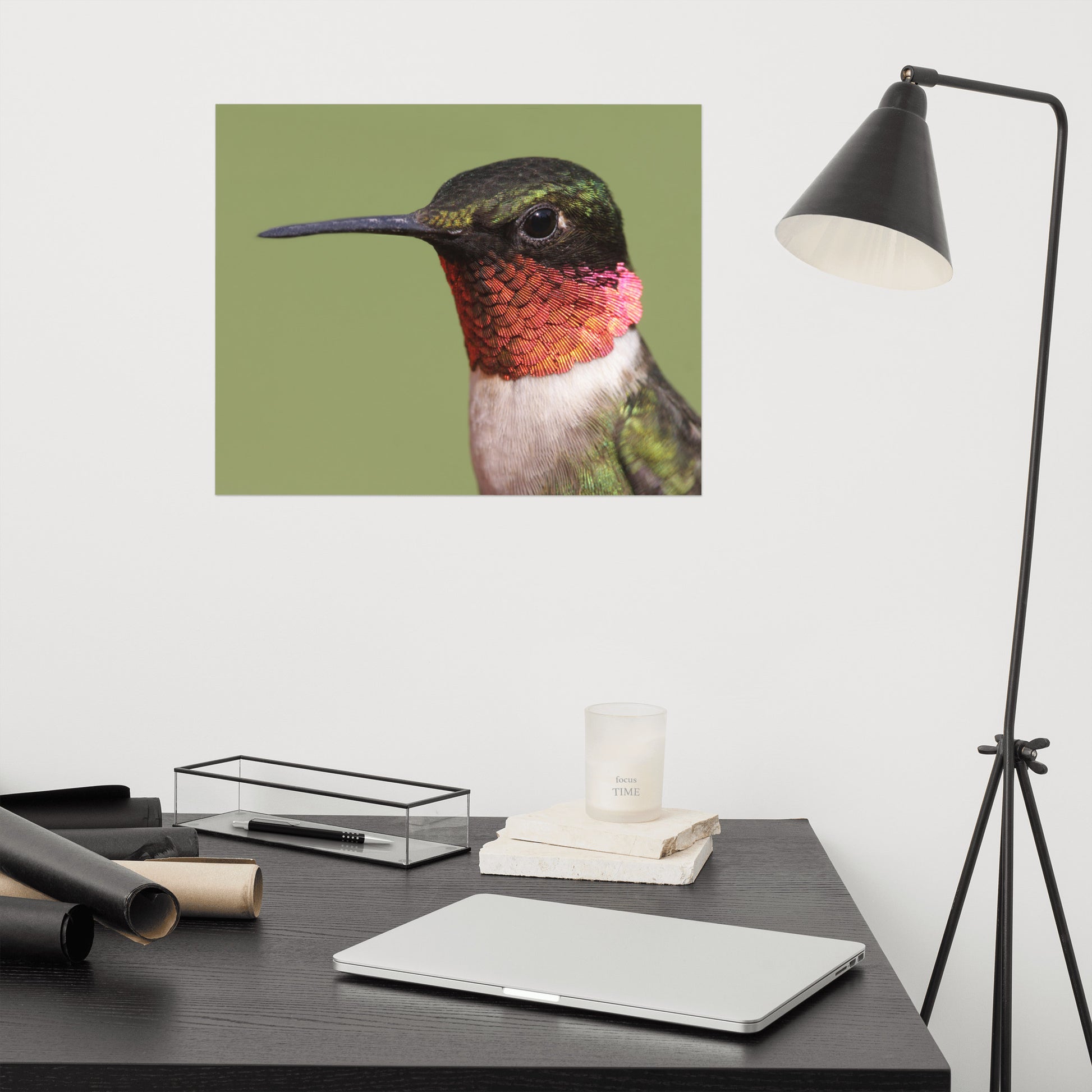 About these bird artwork prints: Capture the fleeting beauty of nature with this minimalist close-up photograph of a male Ruby-throated Hummingbird. Perched serenely against a calming garden-green backdrop, this exquisite image showcases the intricate details of the hummingbird's iridescent feathers and delicate form.
