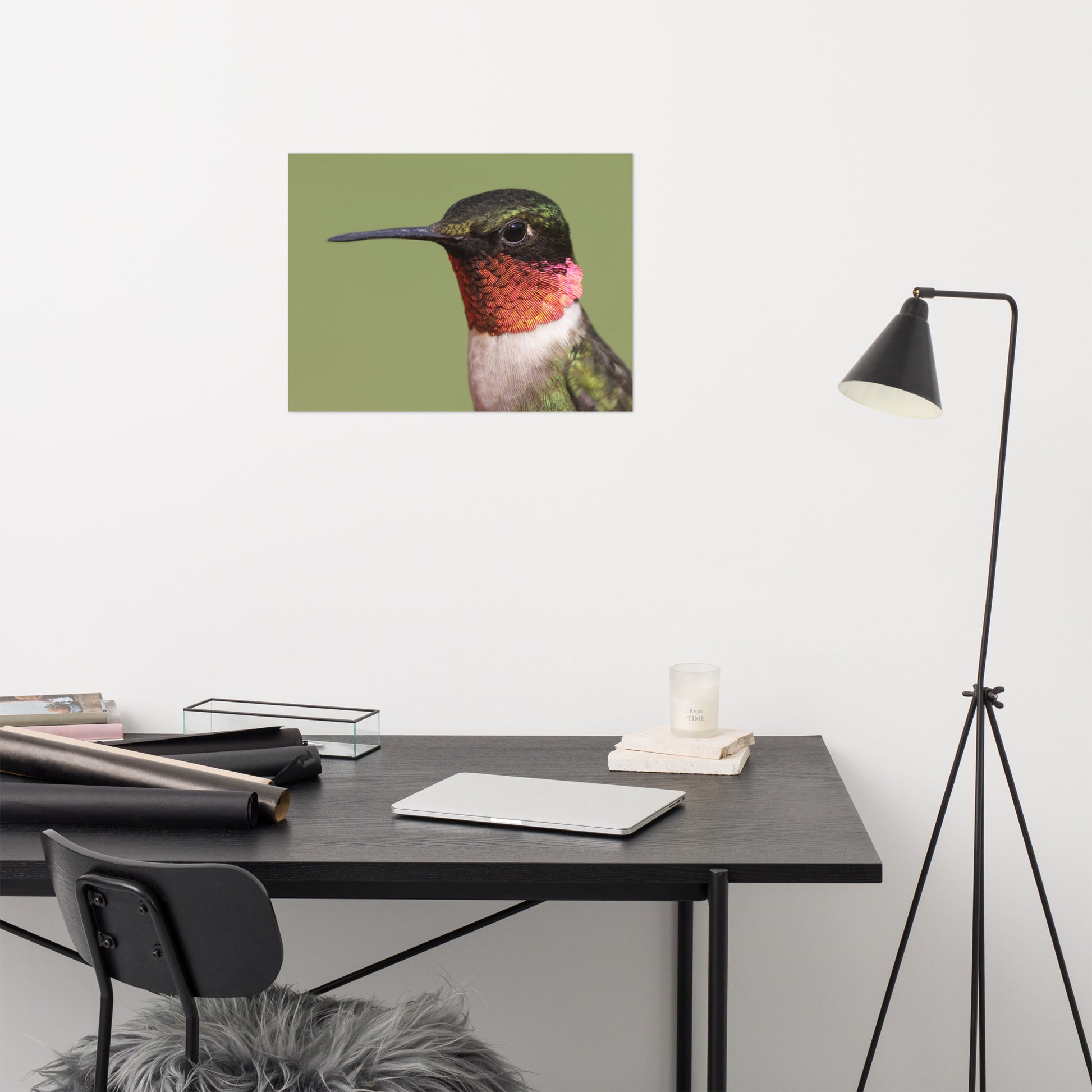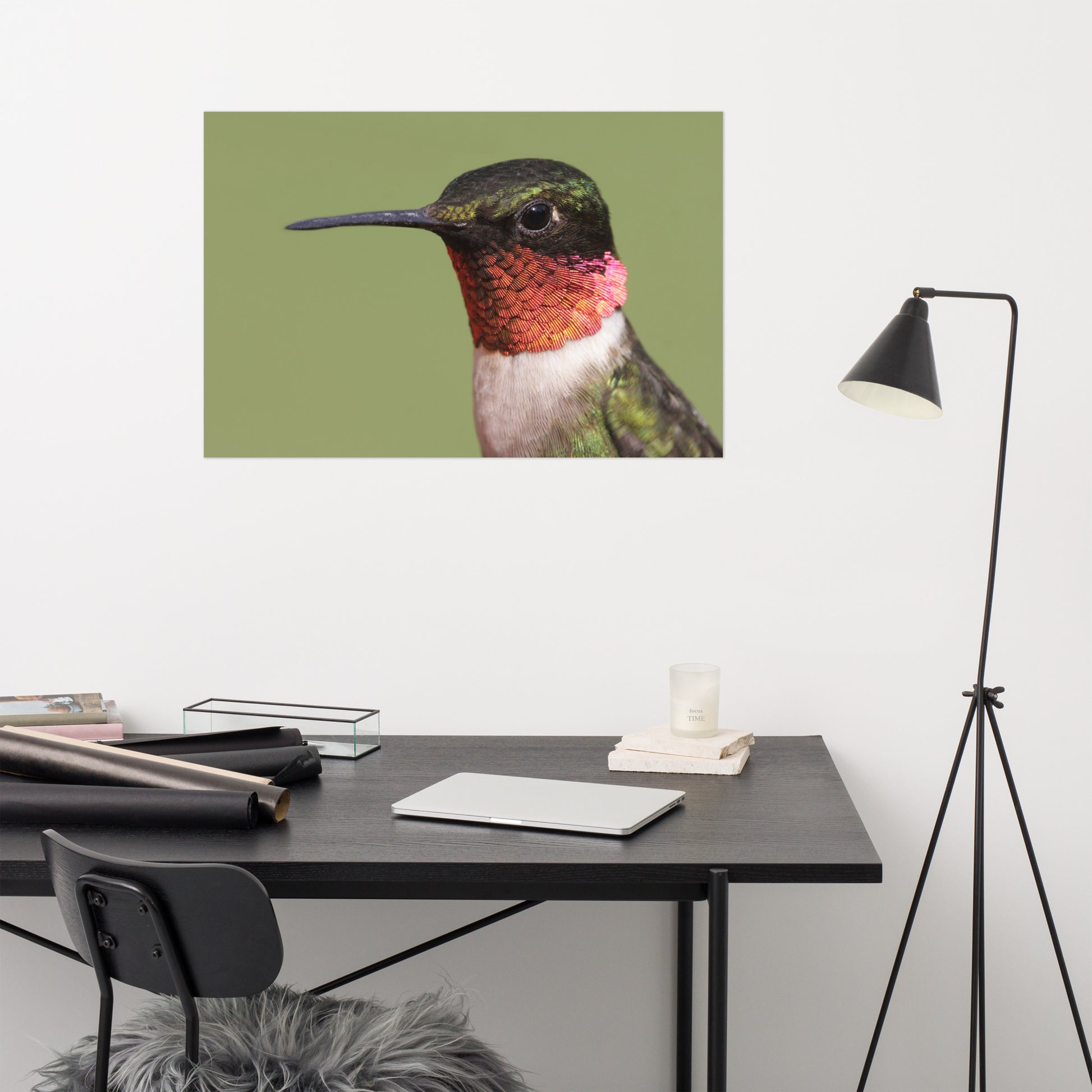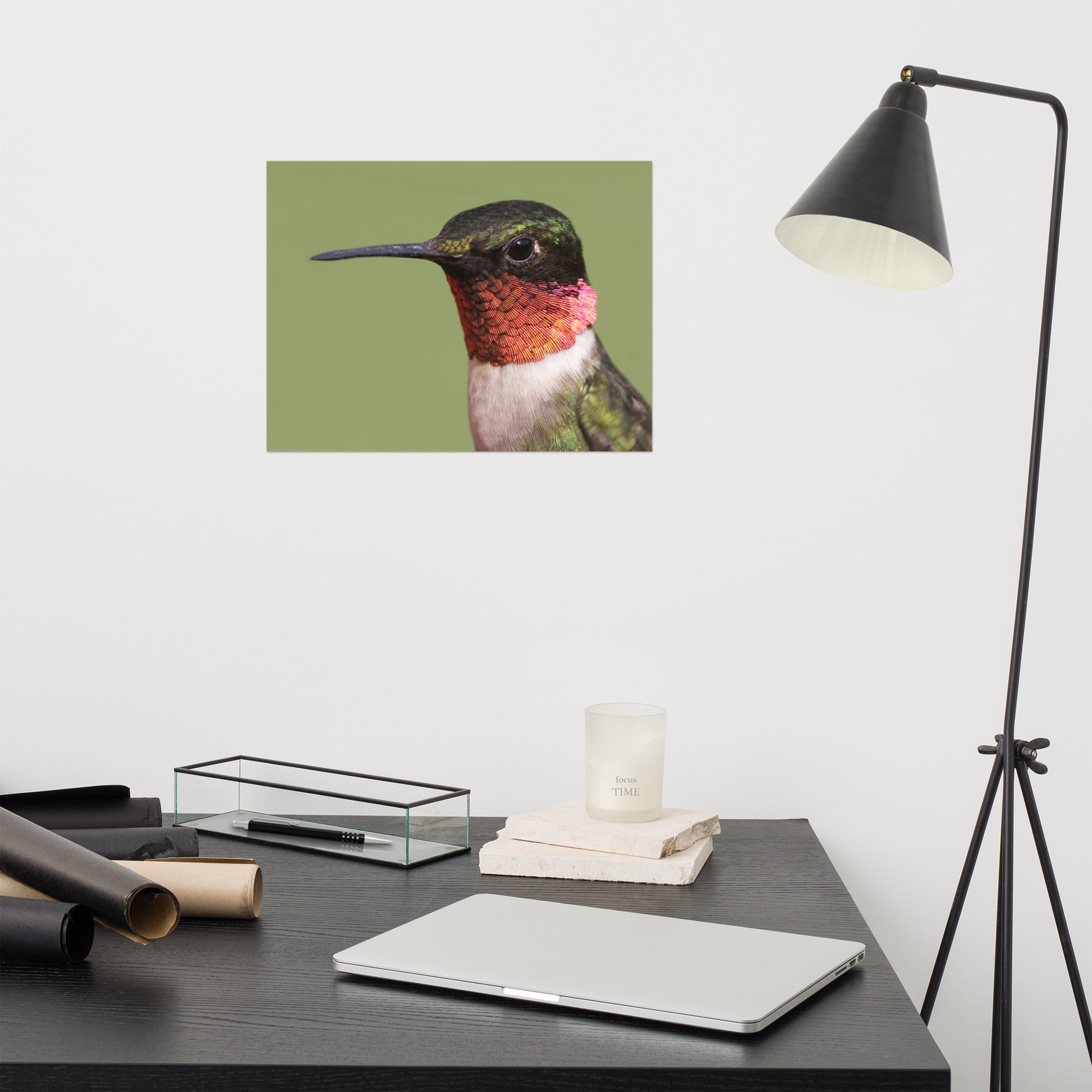 About these bird artwork prints: Capture the fleeting beauty of nature with this minimalist close-up photograph of a male Ruby-throated Hummingbird. Perched serenely against a calming garden-green backdrop, this exquisite image showcases the intricate details of the hummingbird's iridescent feathers and delicate form.