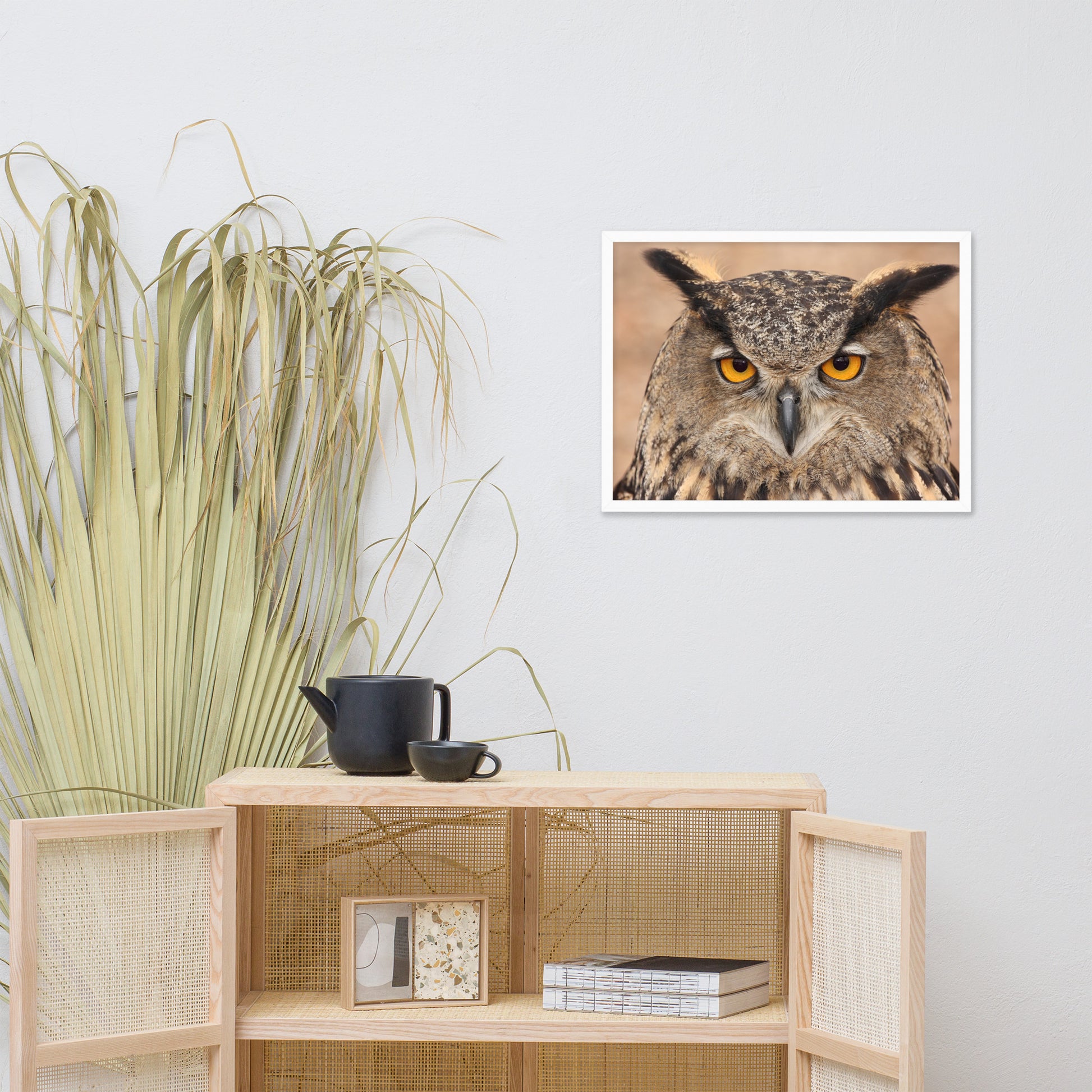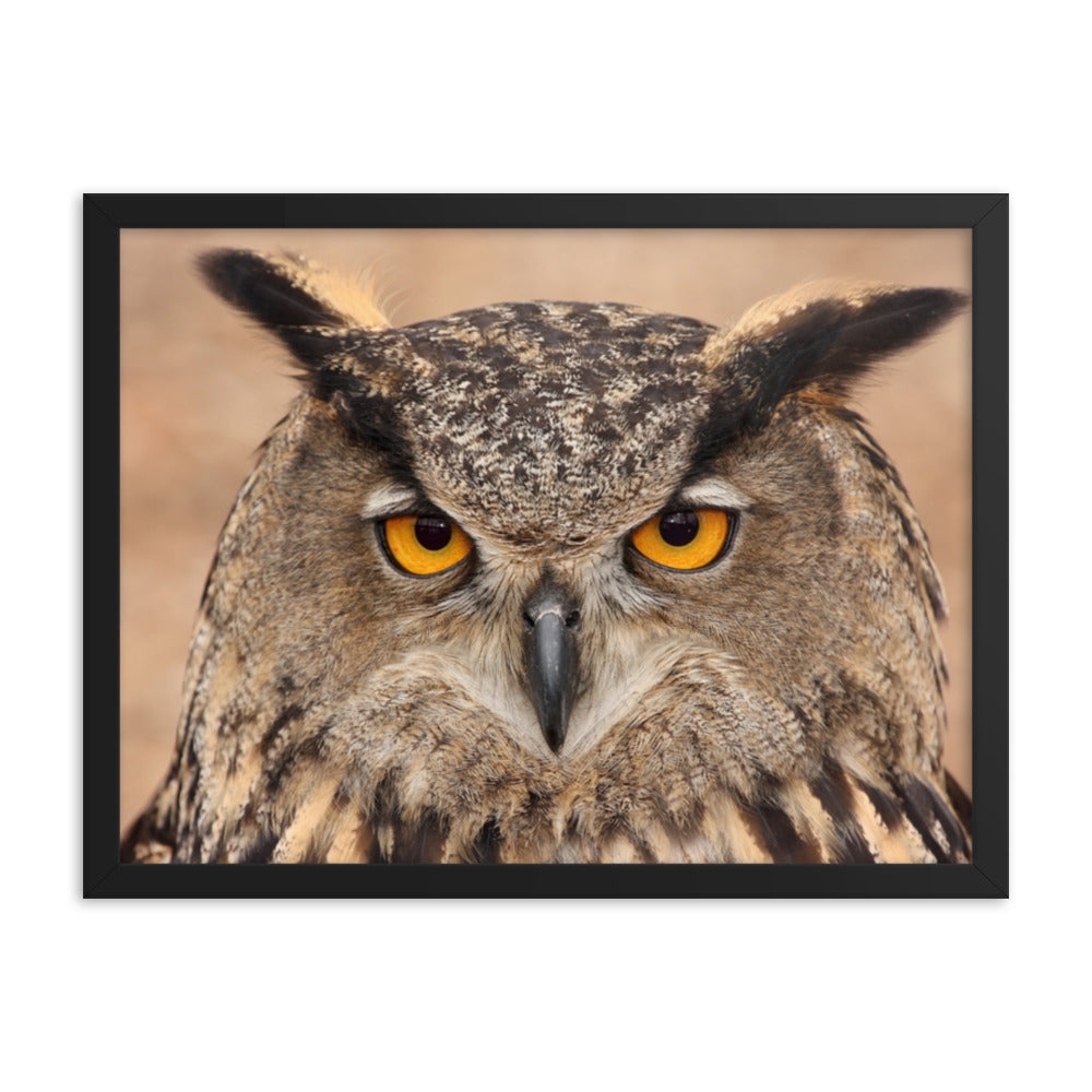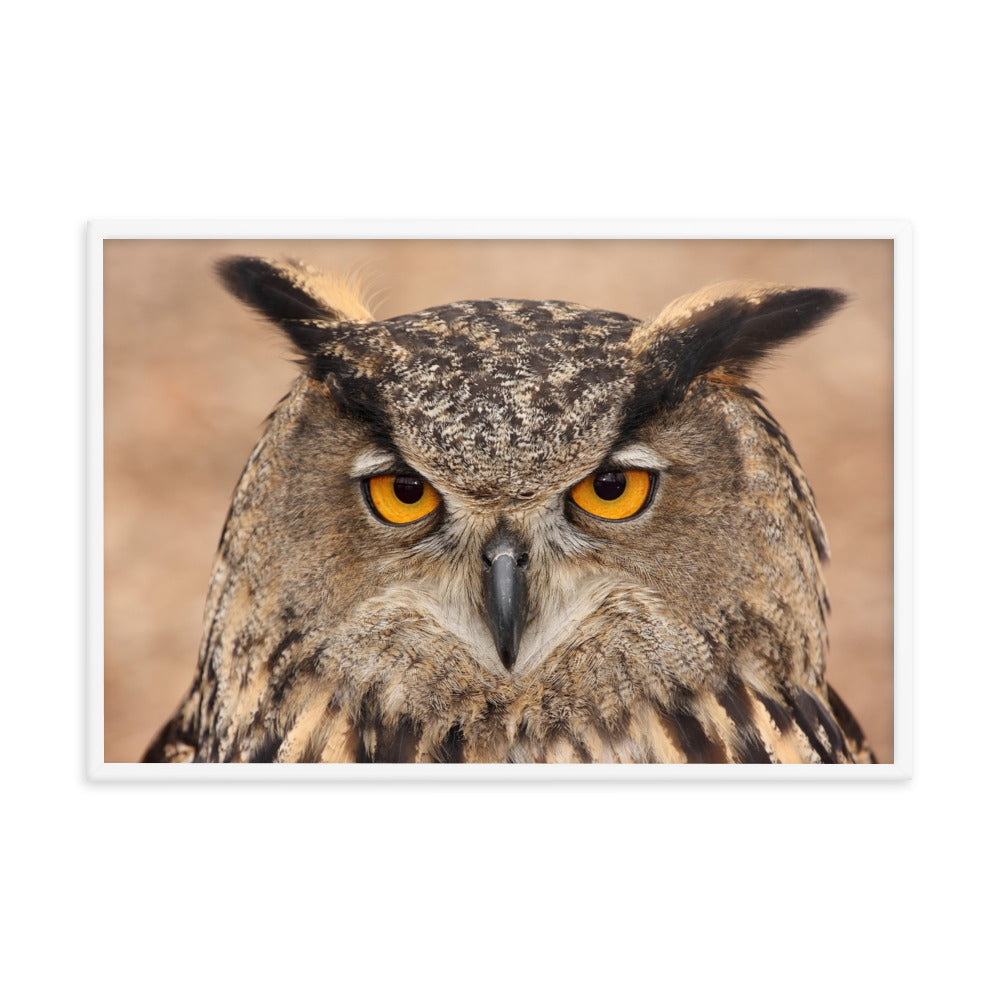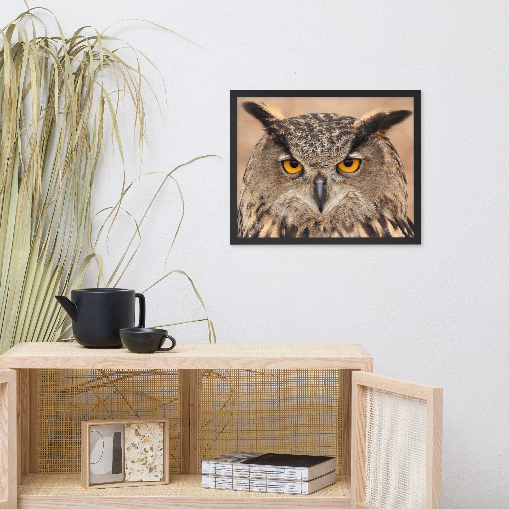 Rustic Animal Wall Decor: Close-up Yellow Eurasian Eagle Owl - Bird - Wildlife / Nature Artwork - Framed Wall Art Print