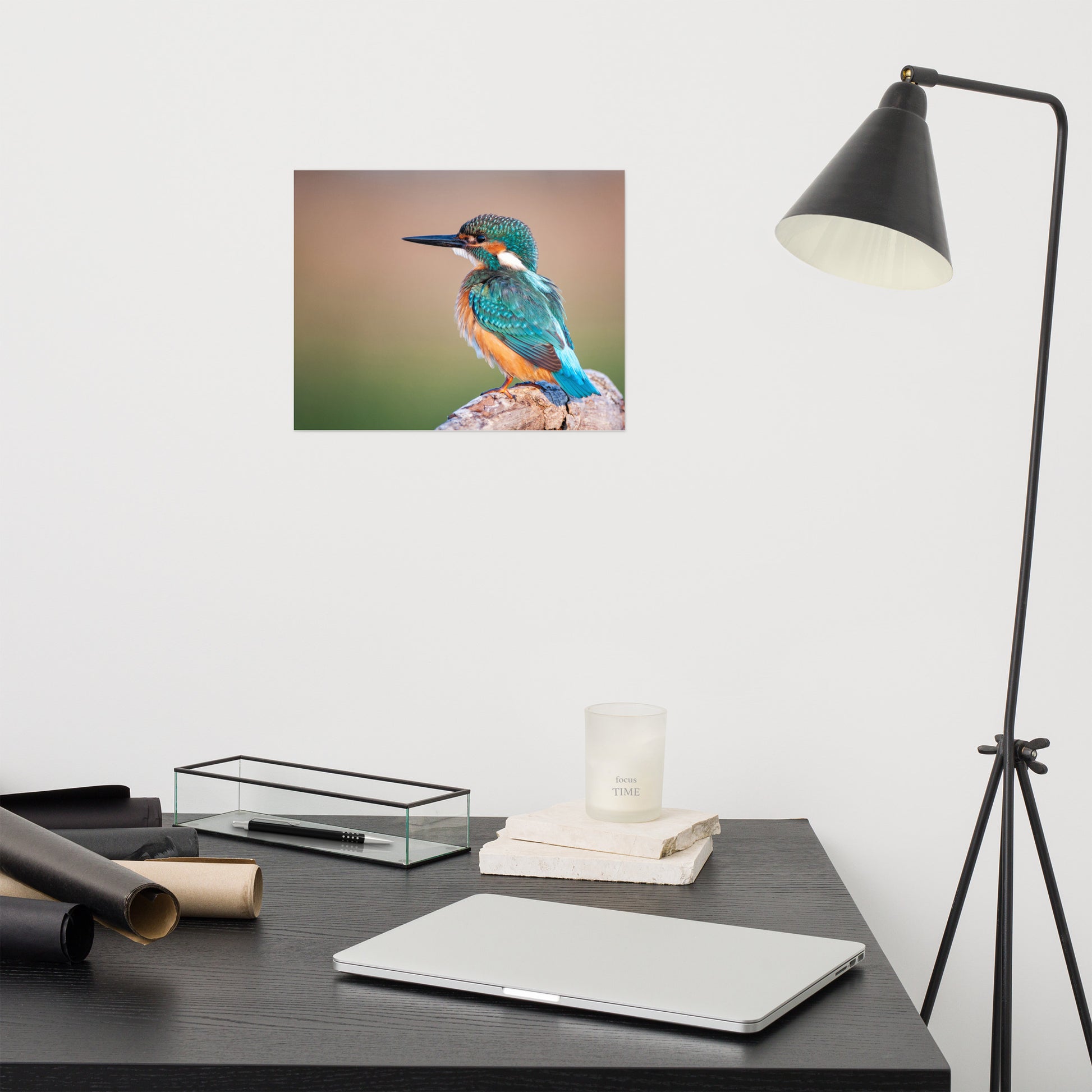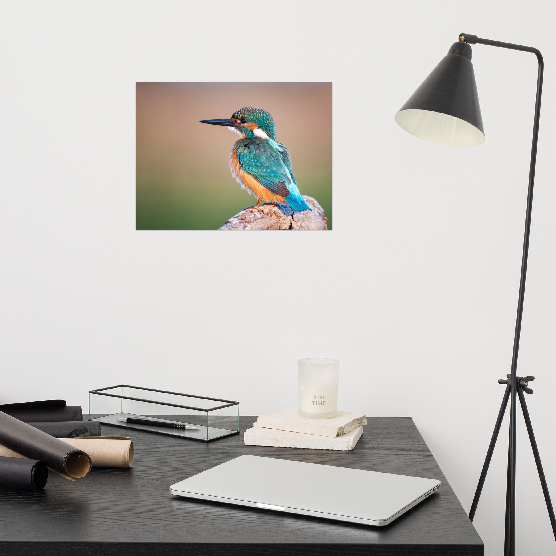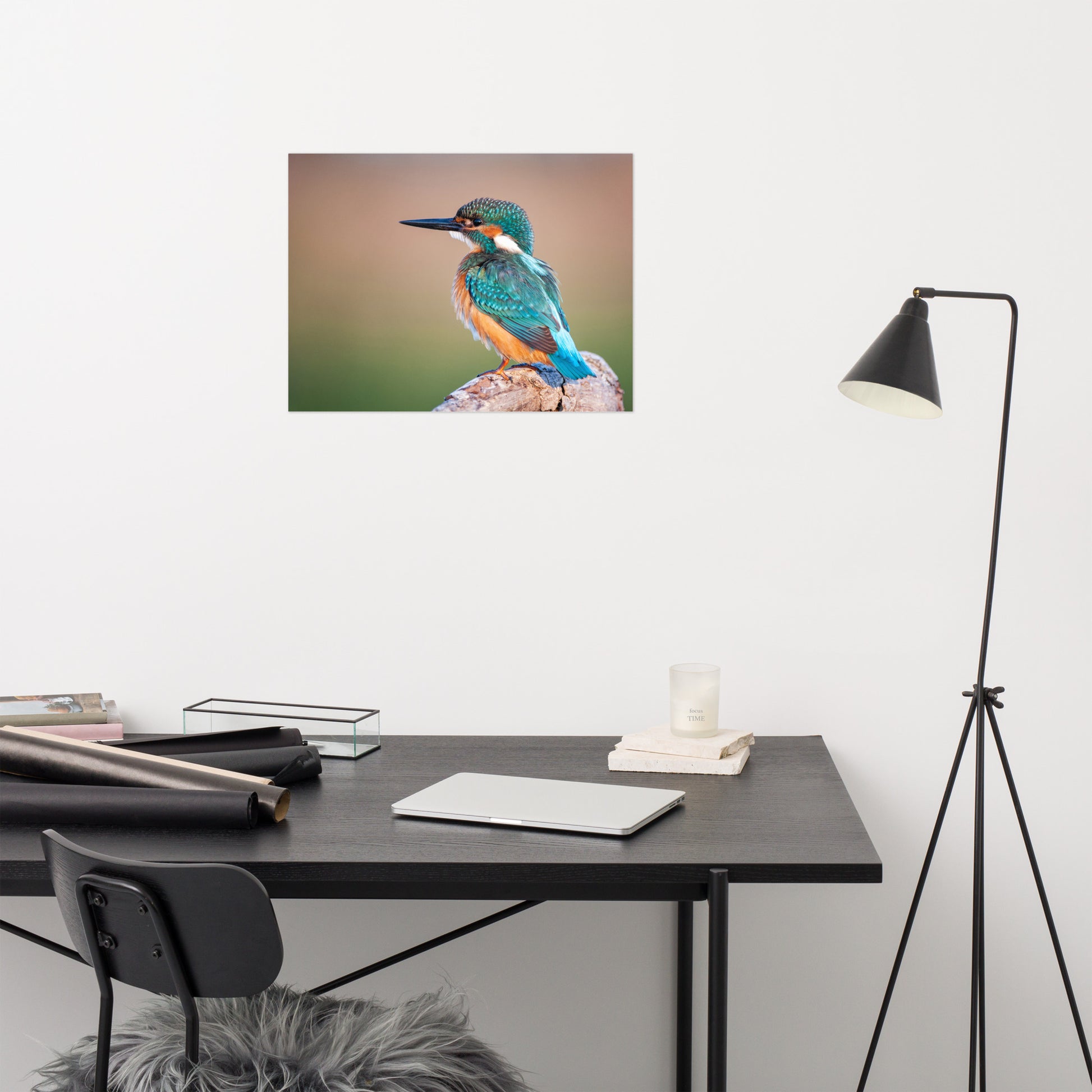 About this minimal bird art print: Capture the vibrant beauty of nature with this stunning photo print. A turquoise blue and orange Common Kingfisher (Alcedo atthis) perches serenely, its colors popping against a soft, minimal background. Perfect for adding a touch of nature's elegance to any space. This unframed print allows for versatile display options, from simple to sophisticated.