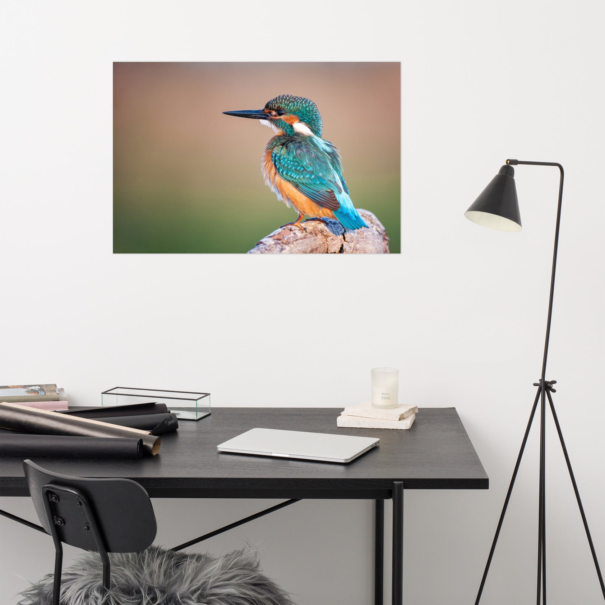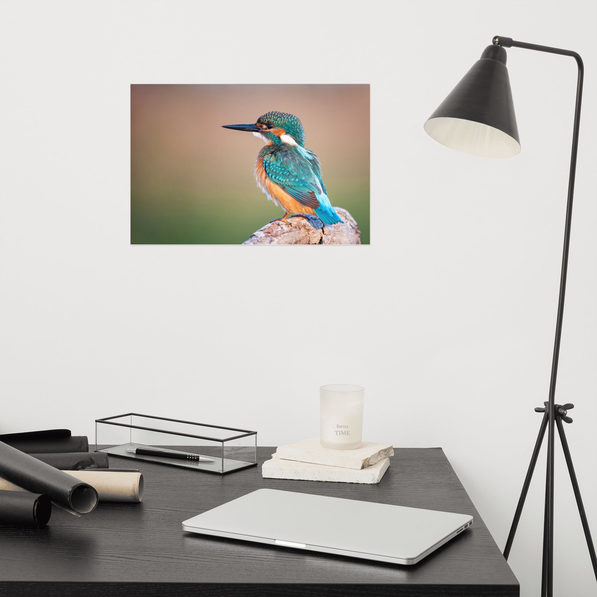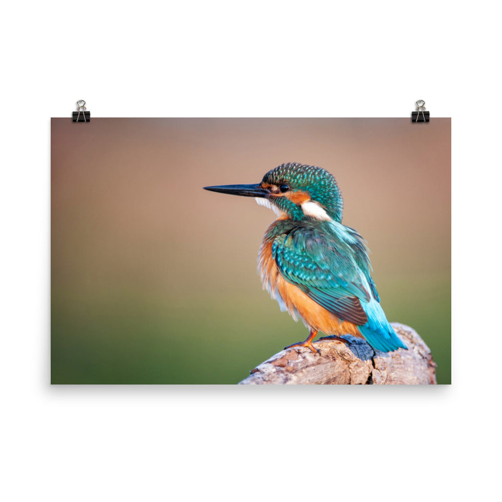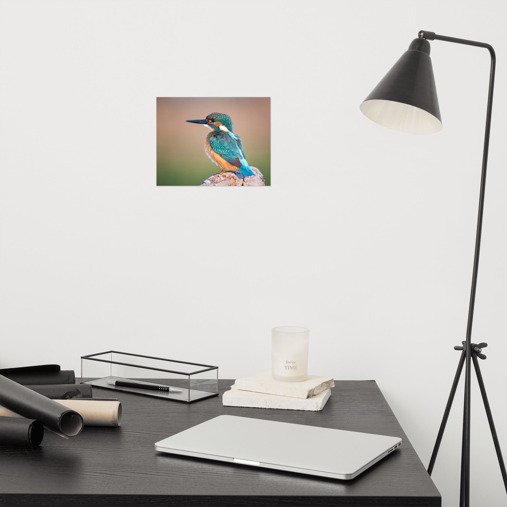 About this minimal bird art print: Capture the vibrant beauty of nature with this stunning photo print. A turquoise blue and orange Common Kingfisher (Alcedo atthis) perches serenely, its colors popping against a soft, minimal background. Perfect for adding a touch of nature's elegance to any space. This unframed print allows for versatile display options, from simple to sophisticated.