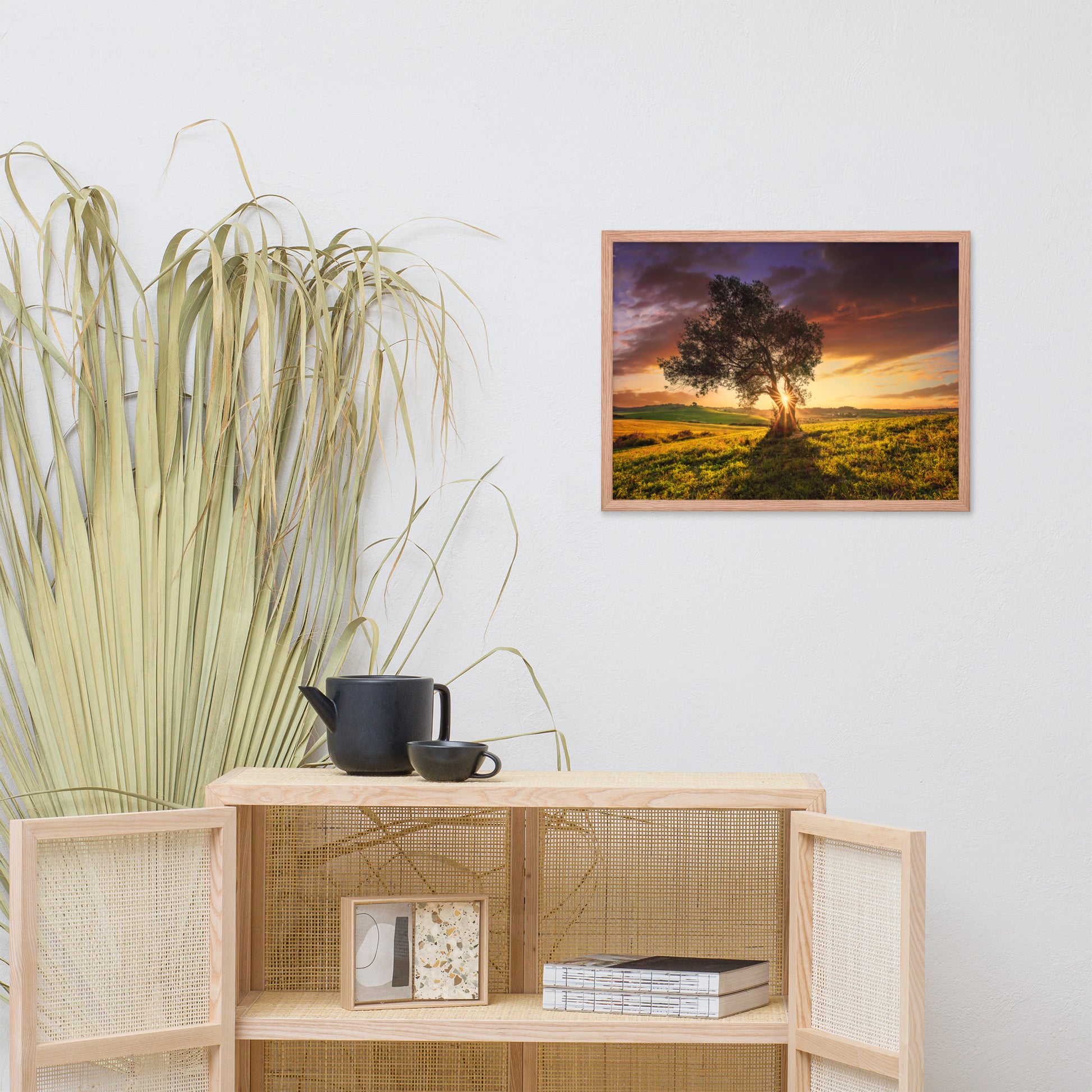 About these rustic framed prints: Bring the warmth and tranquility of the Tuscan countryside into your home with this stunning wall art print. Capturing the breathtaking beauty of a lone olive tree silhouetted against a vibrant sunset, this piece evokes a sense of peace and serenity that will transform any room.