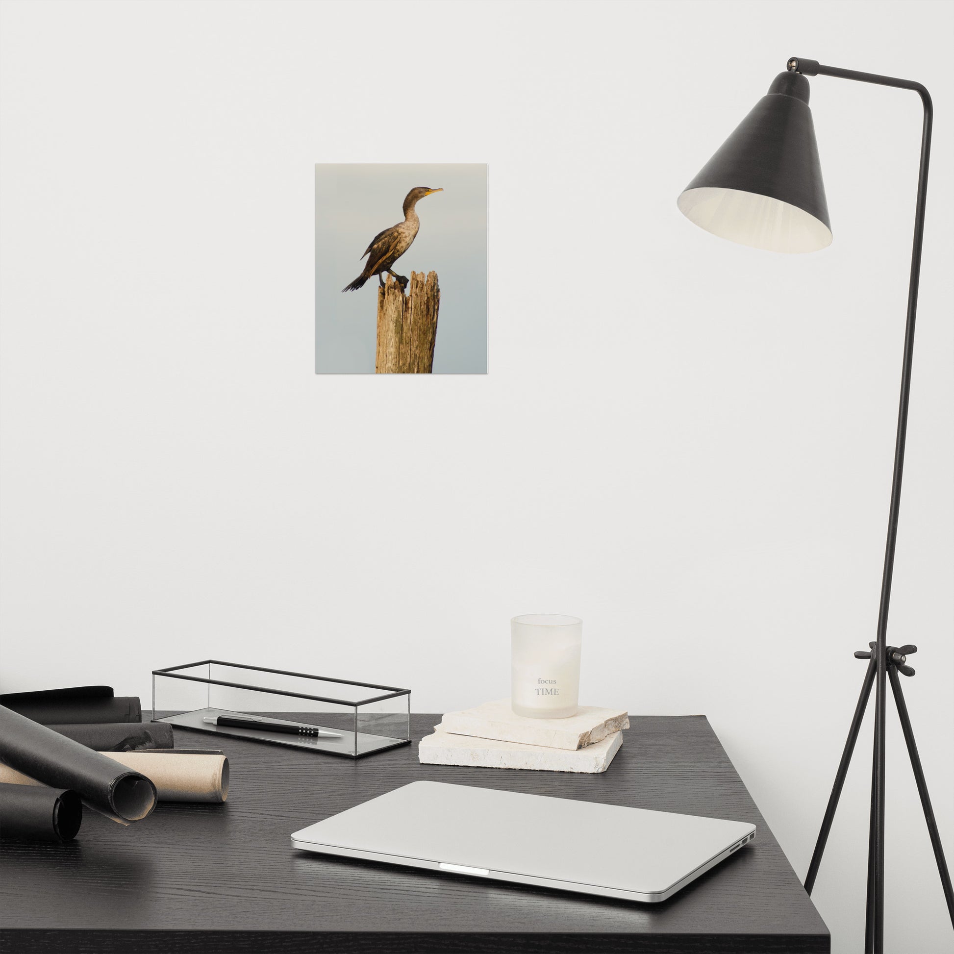 About this beach style artwork: Capture the dramatic beauty of nature with this stunning minimal wildlife photograph, "Double Crested Cormorant in the Sunset." Taken at Port Mahon near Little Creek, Delaware, this print showcases the resilience of a Double Crested Cormorant as it perches on a weathered post, silhouetted against the vibrant hues of a post-storm sunset. Bring the power and tranquility of the coast into your home with this evocative piece, ready to be custom framed and displayed to your personal taste.