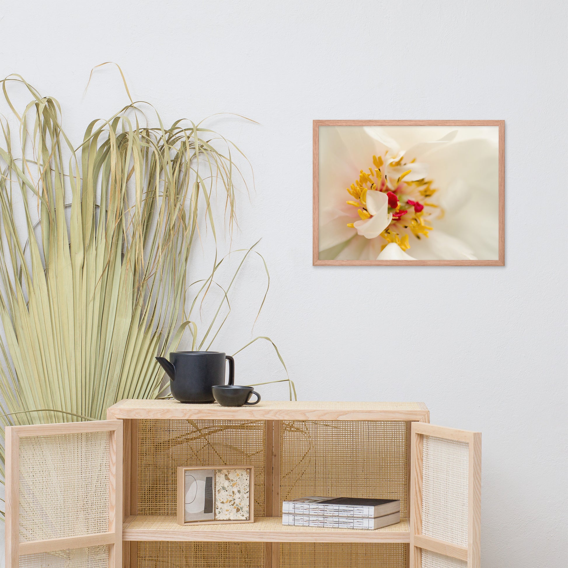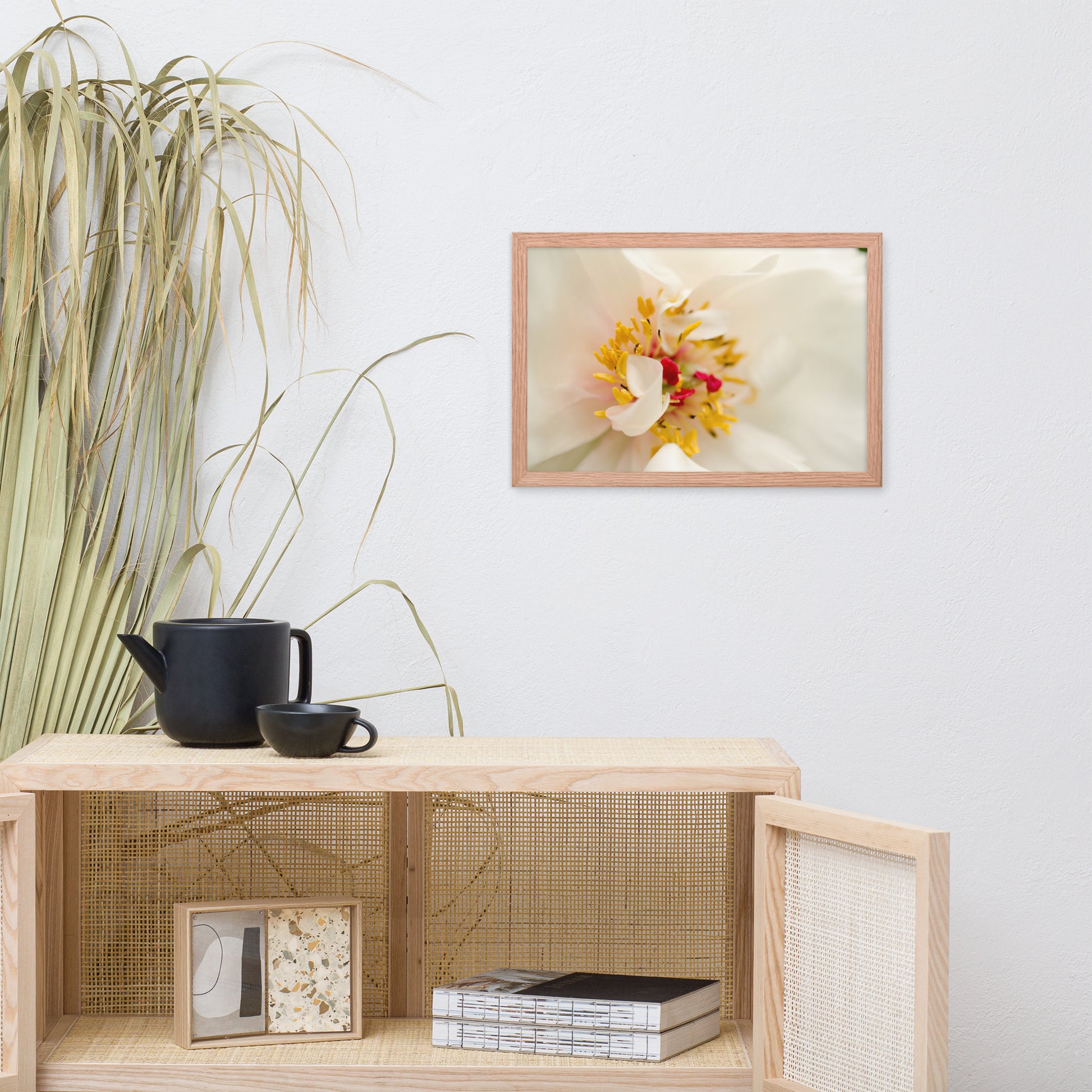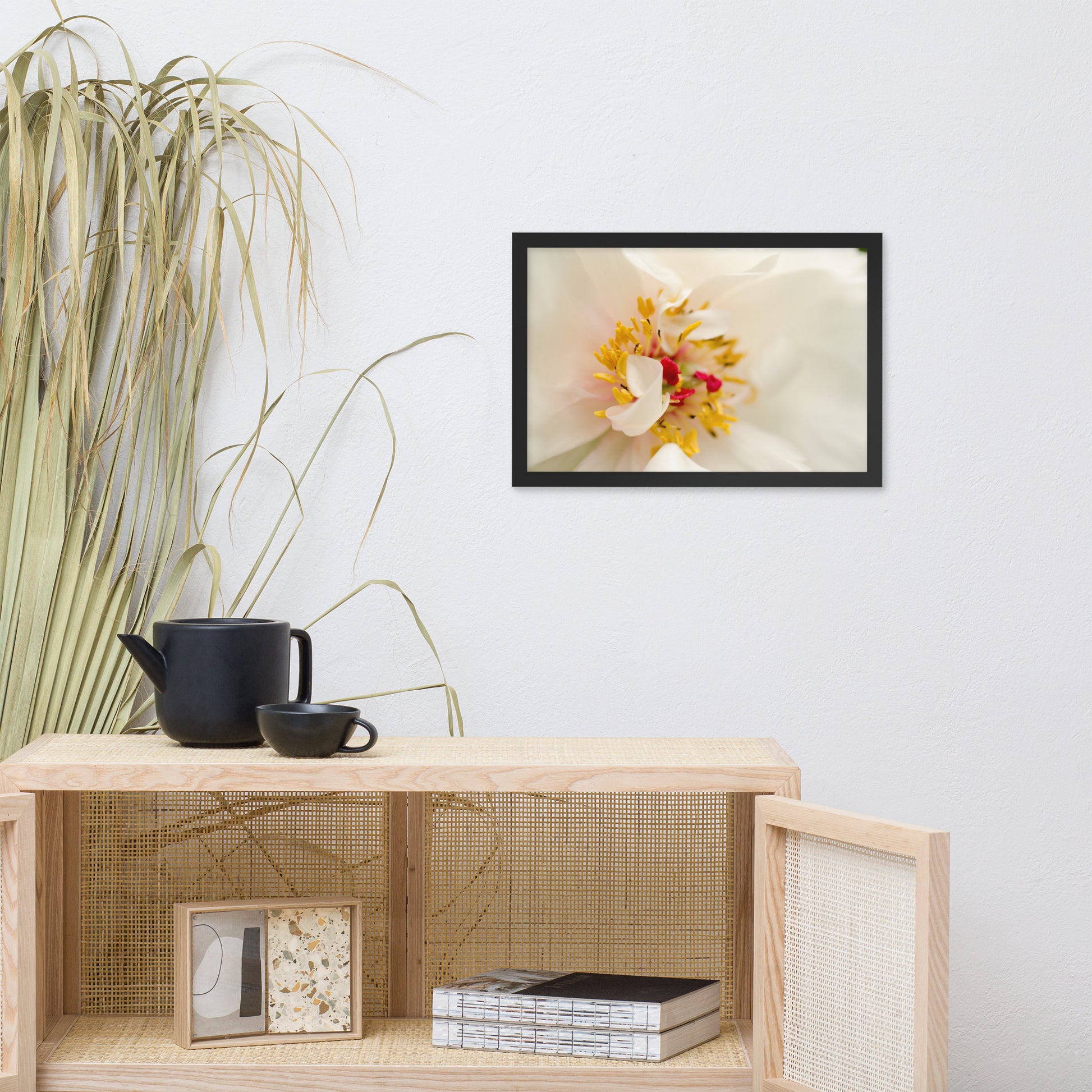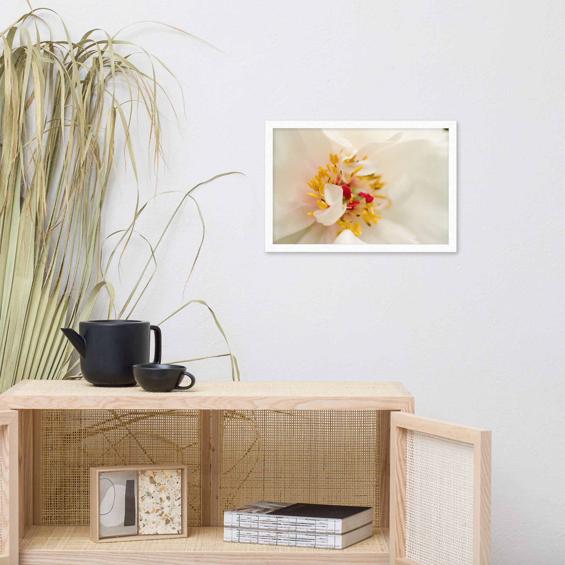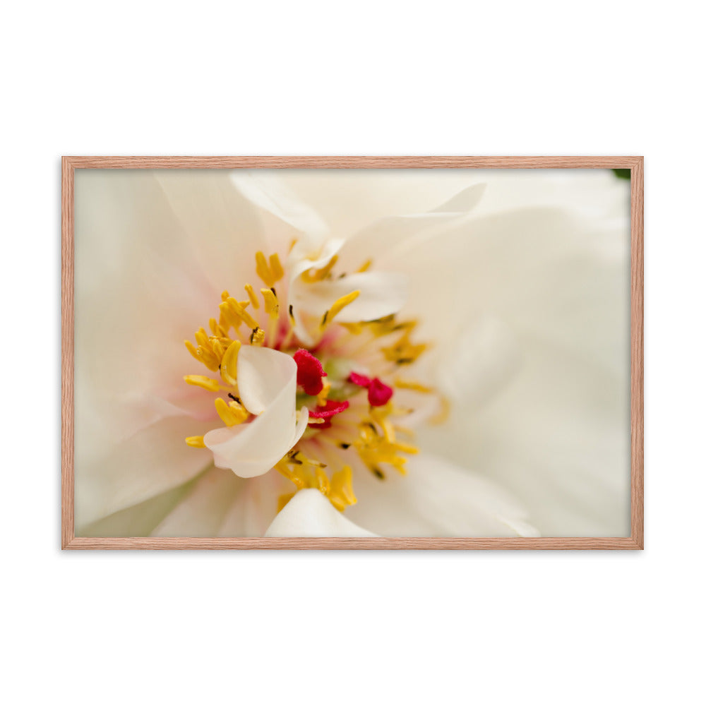 About this white flower framed wall art: Invite the delicate beauty of nature into your home with this exquisite art photograph print. "Eye of Peony" captures the ephemeral elegance of a blooming peony, its intricate details magnified in stunning clarity. The soft, creamy white petals envelop a vibrant burst of golden stamens, dusted with a touch of crimson, creating a captivating focal point that draws you into the heart of the flower.