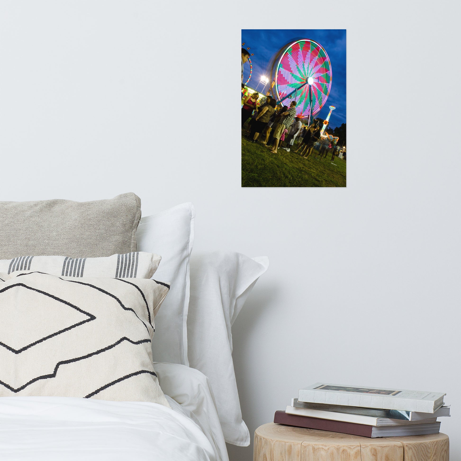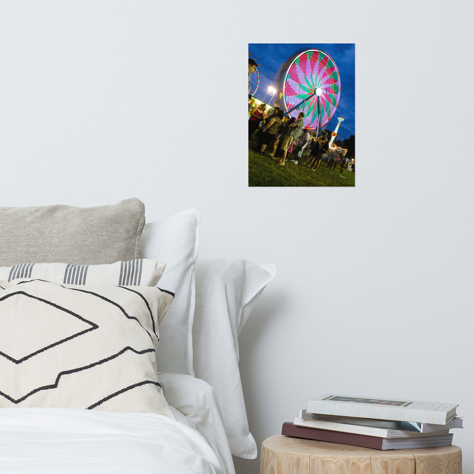 About this urban landscape scene: Transform your living space with the captivating allure of "Ferris Wheel 1," a stunning night photograph that captures the magic and excitement of St. Anthony's Carnival in Wilmington, Delaware. This loose, unframed art print showcases the iconic Ferris wheel in motion, its vibrant lights creating a mesmerizing pattern against the dark night sky.