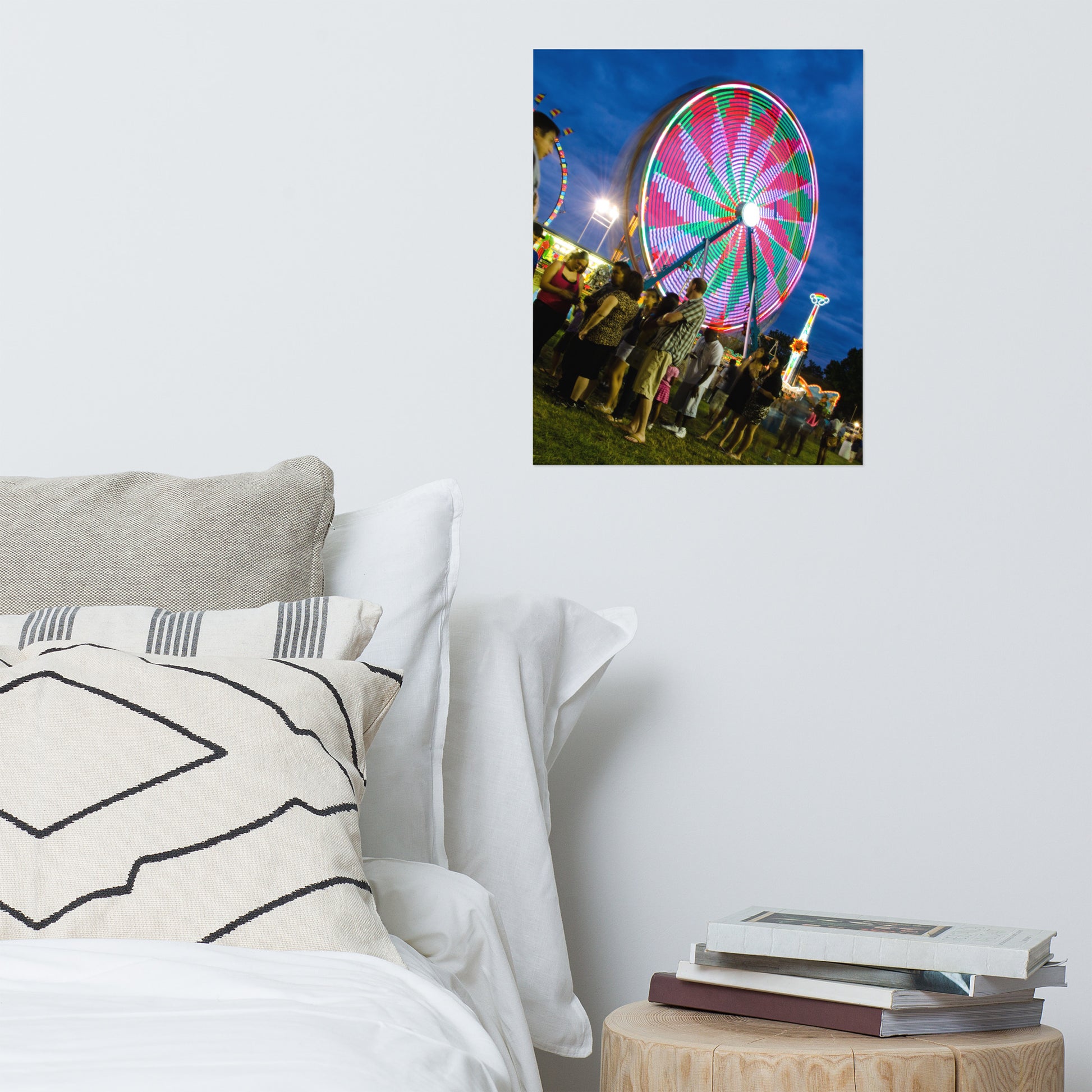 The Ferris wheel, the undisputed star of the scene, is beautifully captured in a way that exudes both majesty and a welcoming warmth. Its illuminated carriages trace graceful arcs, inviting viewers to imagine the laughter and joy echoing from within. The photograph's rich, saturated colors further enhance the sense of energy and celebration, making it a perfect addition to any room in need of a touch of vibrancy and life.