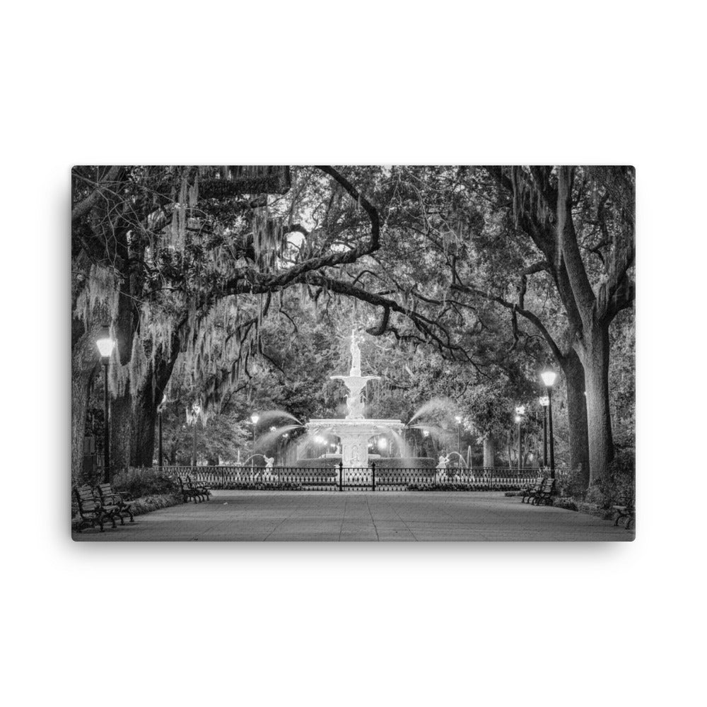 Elevate your space with the classic beauty of Savannah's Forsyth Park. This striking black and white canvas print showcases the iconic fountain nestled amongst moss-draped oaks, radiating a sense of Southern charm and tranquility.