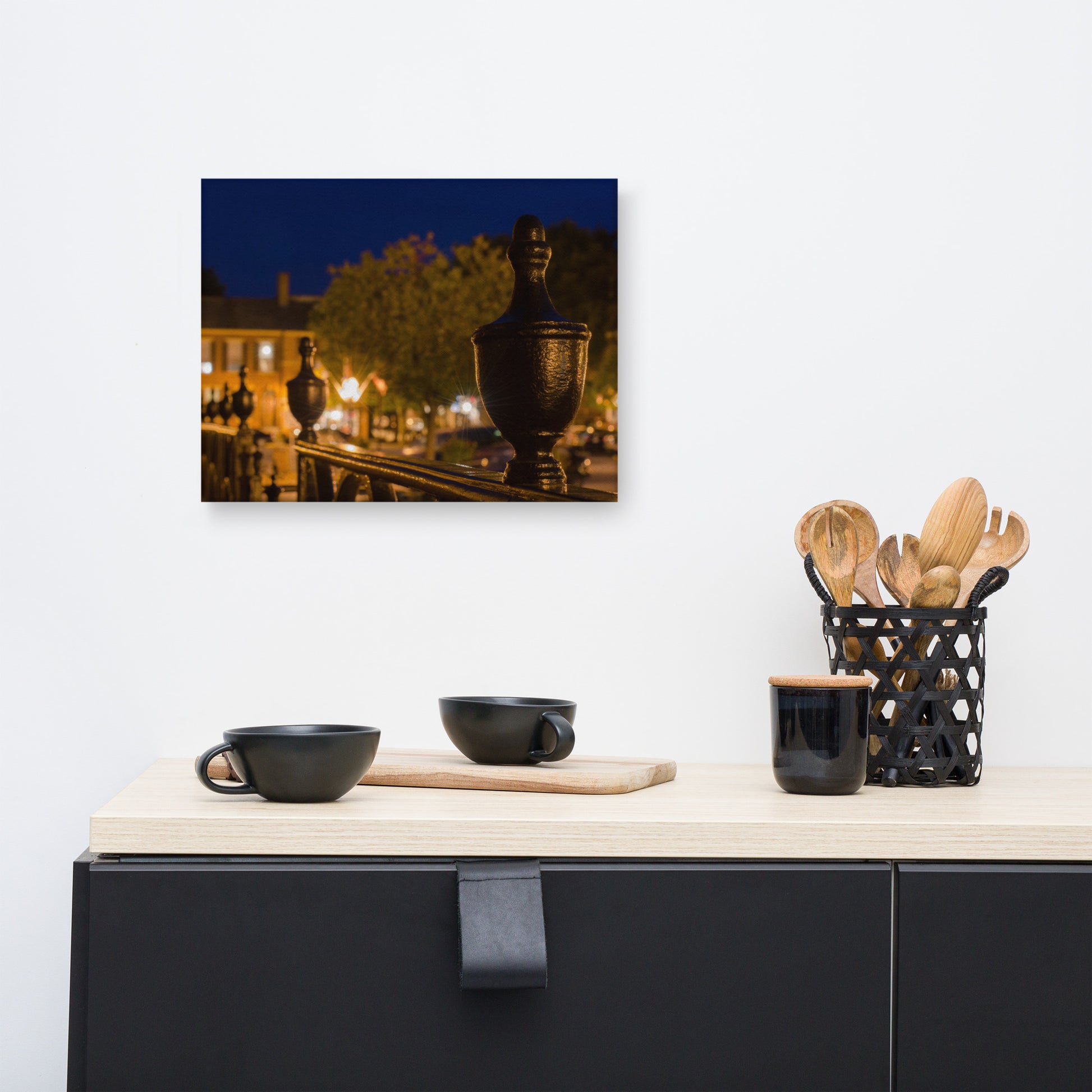 About this architectural wall decor: Transform your living space into a serene escape with this captivating canvas print. "Historic New Castle 4" captures the magical ambiance of a historic square bathed in the warm glow of faux gas lamps. The soft, inviting light illuminates the intricate details of the ornate iron fence, casting mesmerizing shadows that dance across the cobblestones. The blurred backdrop of elegant buildings and lush greenery creates a sense of depth and mystery, inviting the viewer to step into the scene and explore the enchanting streets of Savannah.