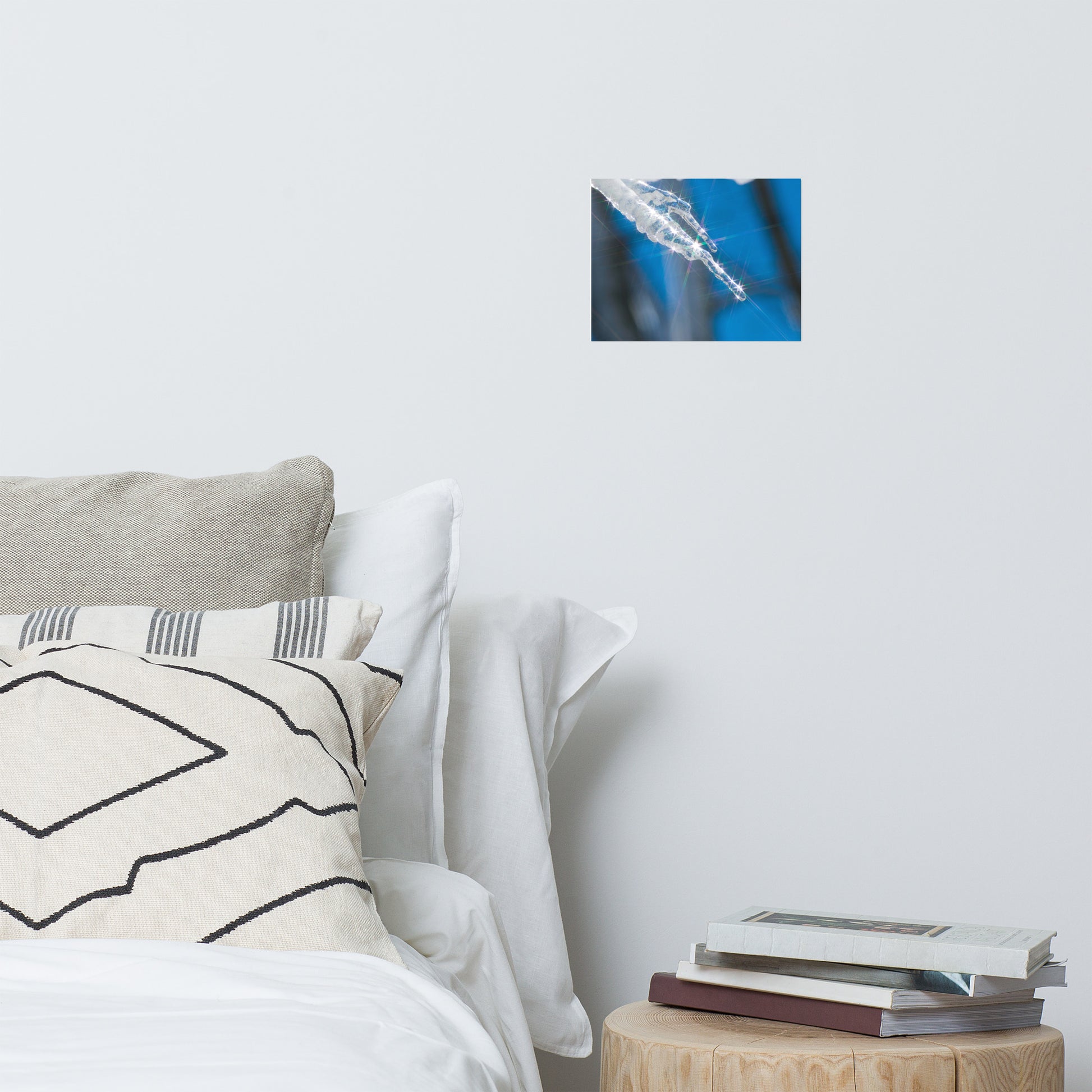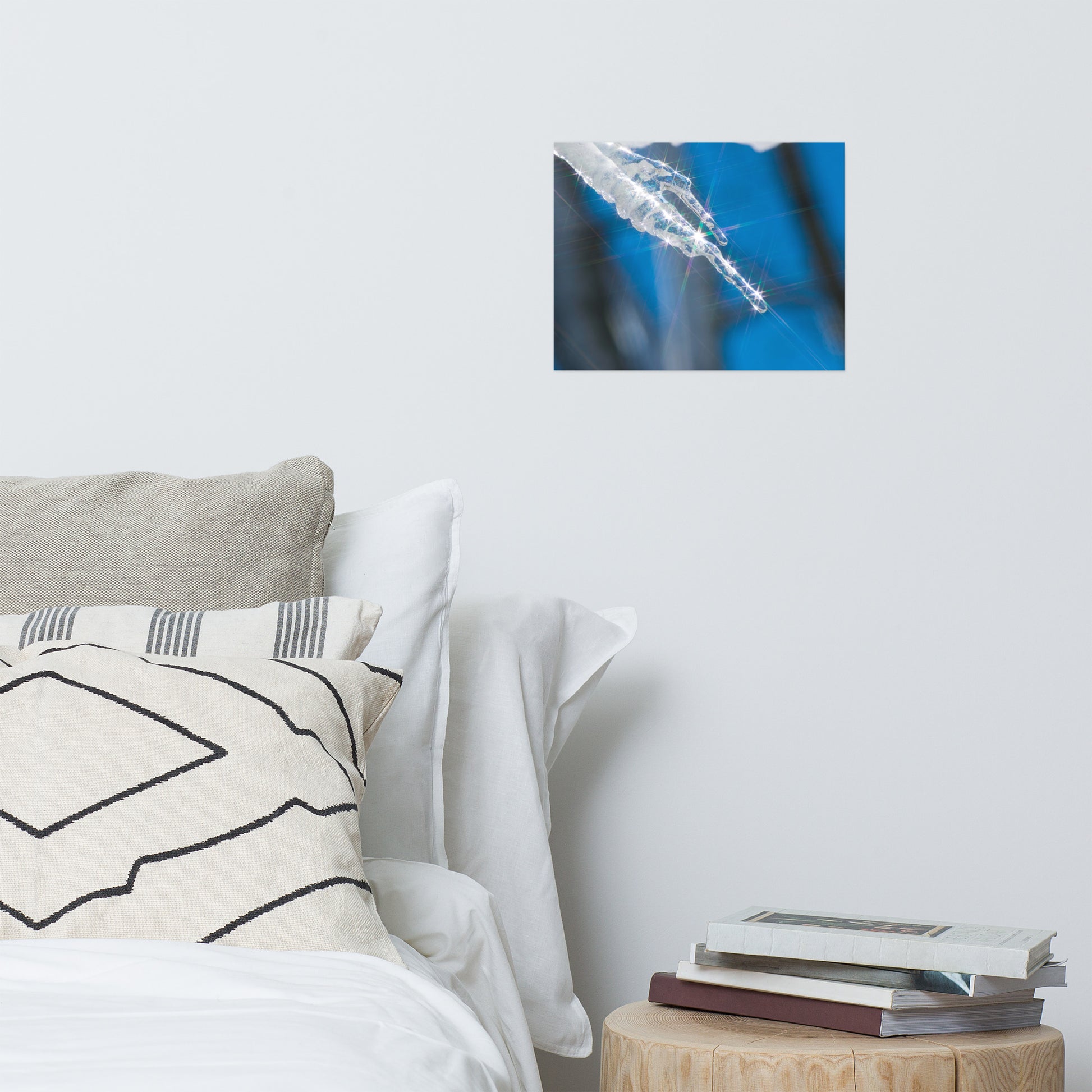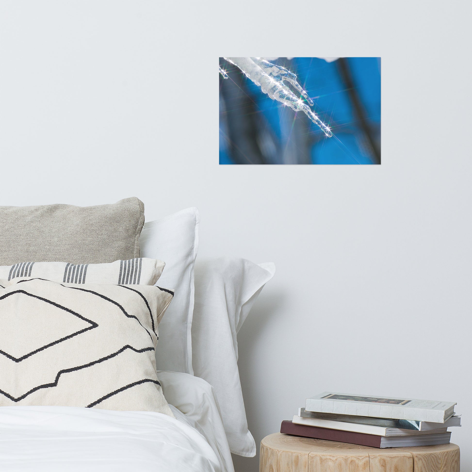 About this nature art print: Bring the beauty of nature indoors with this stunning photo print, "Icicle." Sunlight shimmers through the ice, creating a mesmerizing interplay of light and shadow. The star filter adds a touch of magic, transforming the icicle into a radiant jewel against the cool blue sky. This unique piece captures the fleeting beauty of nature, perfect for those who appreciate the simple wonders of the world.